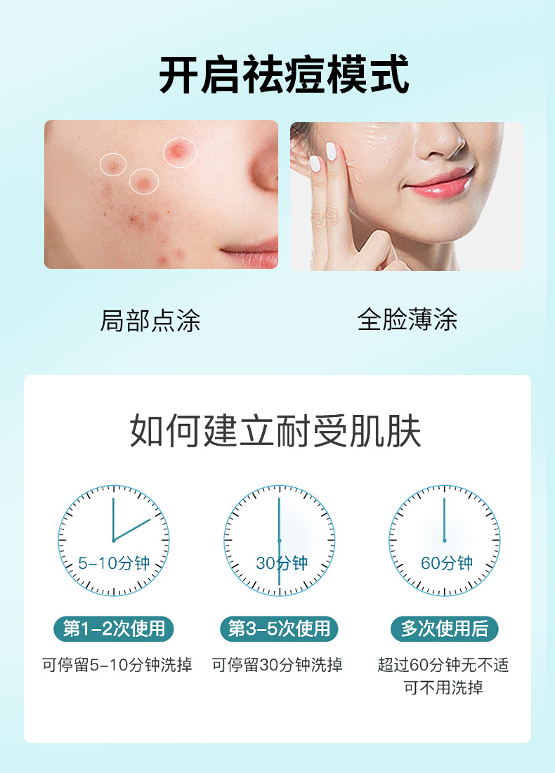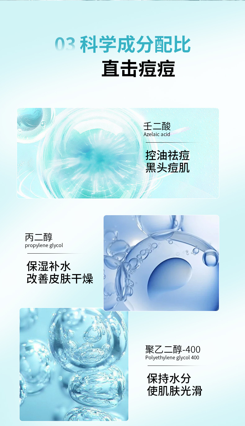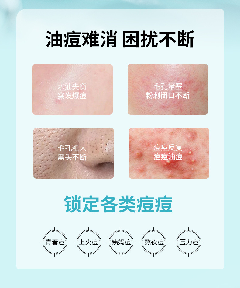 | Eficacia del producto | Eliminación del acné, reparación de la piel propensa al acné, mejora el equilibrio agua-aceite de la textura de la piel y tiene un efecto notable al eliminar el acné y cerrar el acné. |