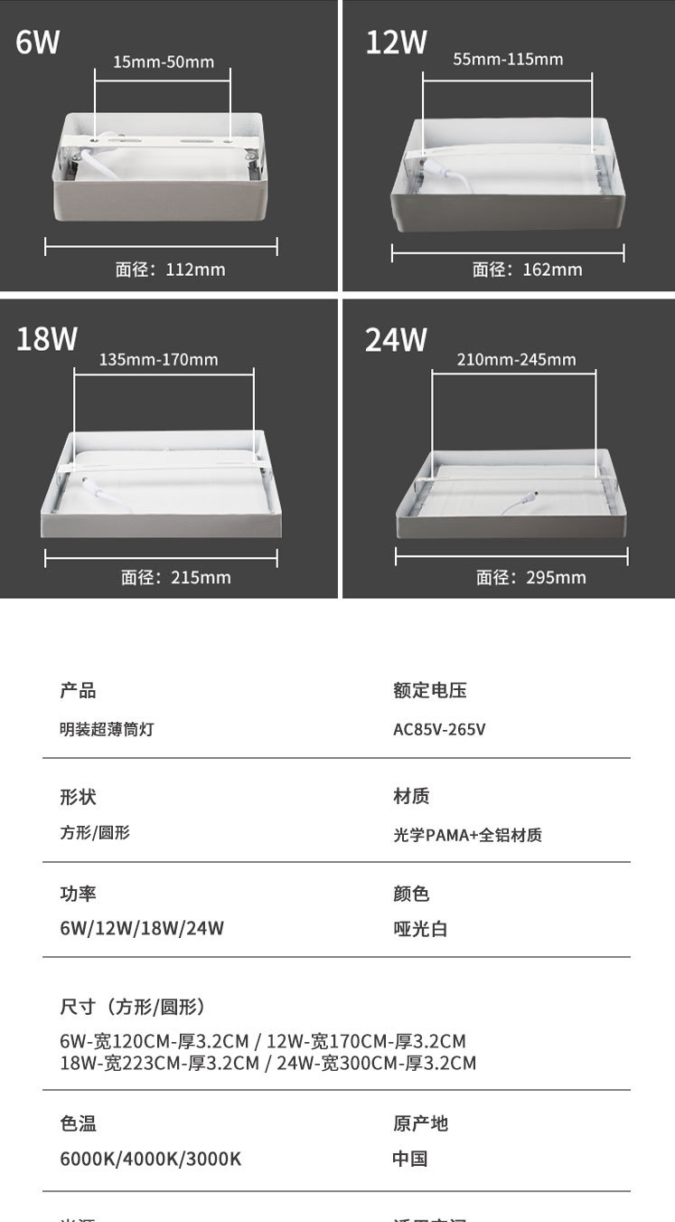 | Poder | 6W redondo (Φ110 * h28)mm,12W redondo (Φ160 * h28)mm,18W redondo (Φ210 * h28)mm,24W redondo (Φ285 * h28)mm,6W redondo (Φ120 * h32)mm,12W redondo (Φ170 * h32)mm,18W redondo (Φ220 * h32)mm,24W redondo (Φ300 * h32)mm,6W cuadrado (Φ110 * h28)mm,12W cuadrado (Φ160 * h28)mm,18W cuadrado (Φ210 * h28)mm,24W cuadrado (Φ285 * h28)mm,6W cuadrado (Φ120 * h32)mm,12W cuadrado (Φ170 * h32)mm,18W cuadrado (Φ220 * h32)mm,24W cuadrado (Φ300 * h32)mm |
