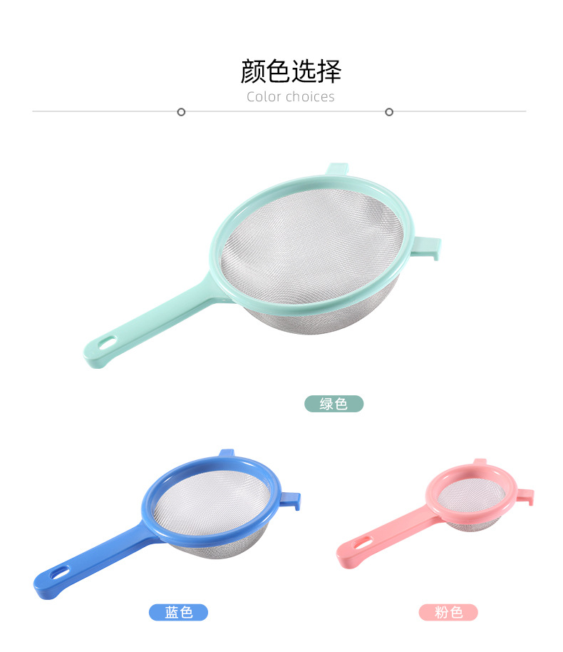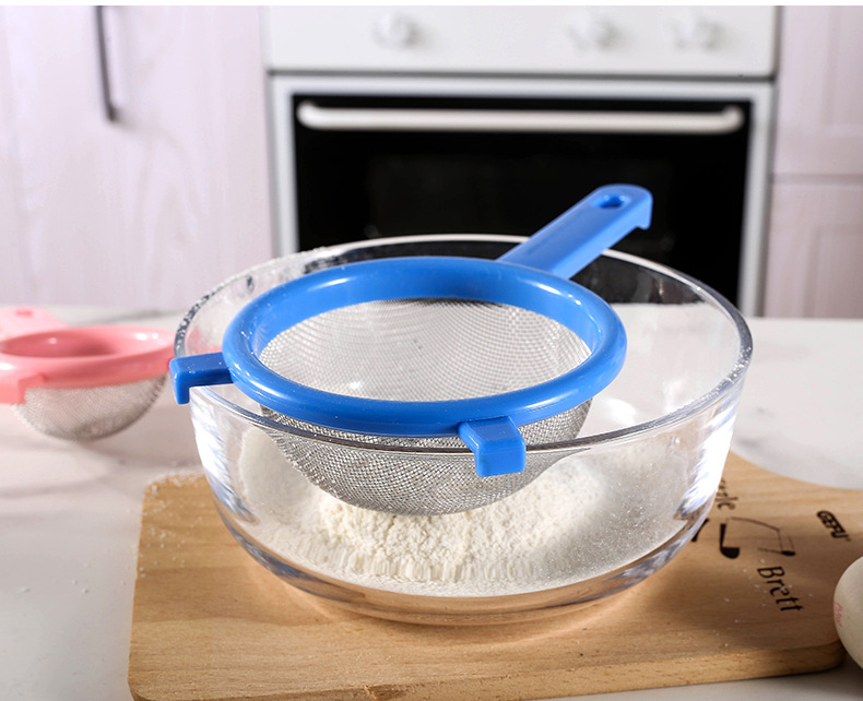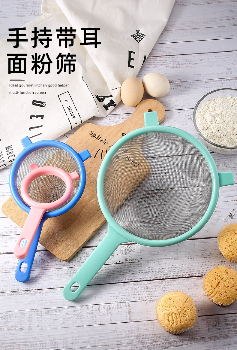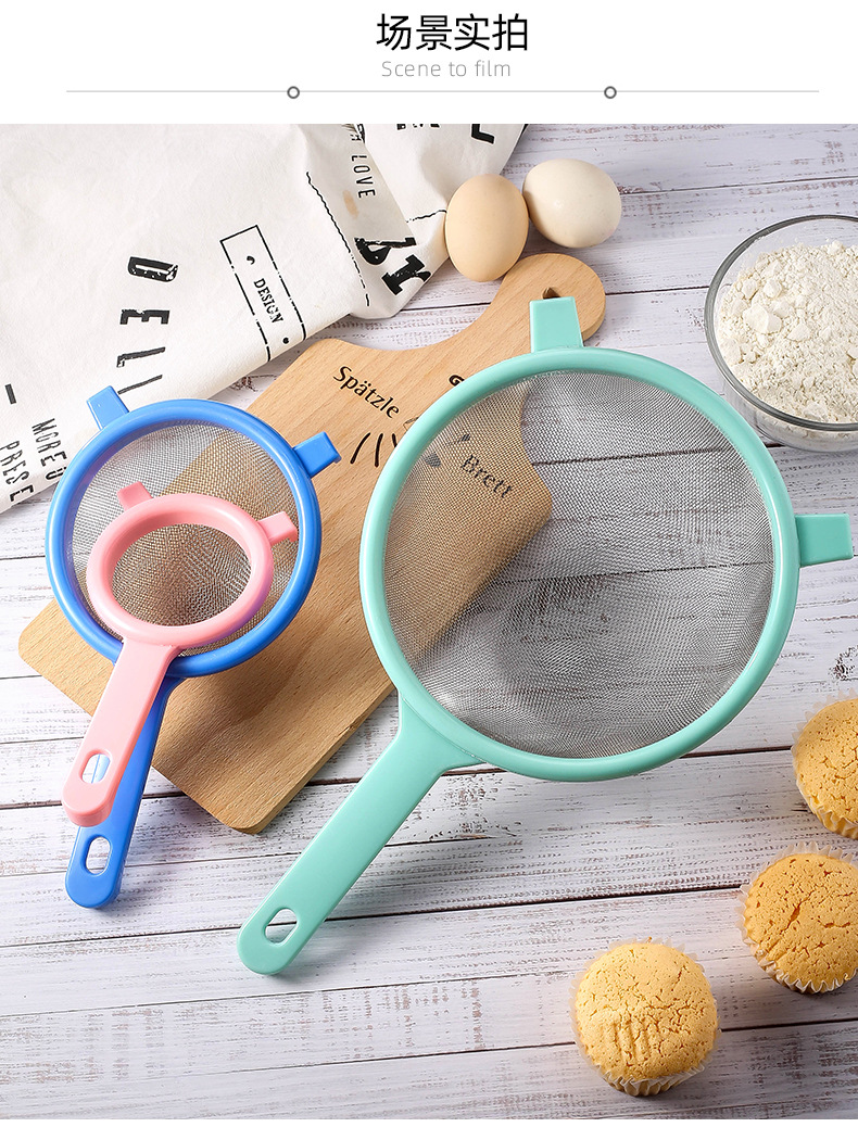 Suministro transfronterizo de comercio electrónico nueva pantalla de filtro de plástico taza de mano tamiz de harina malla doméstica cocina para hornear
