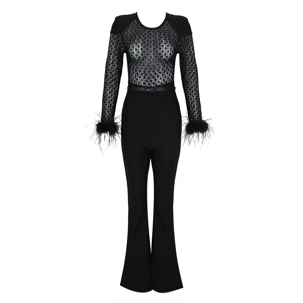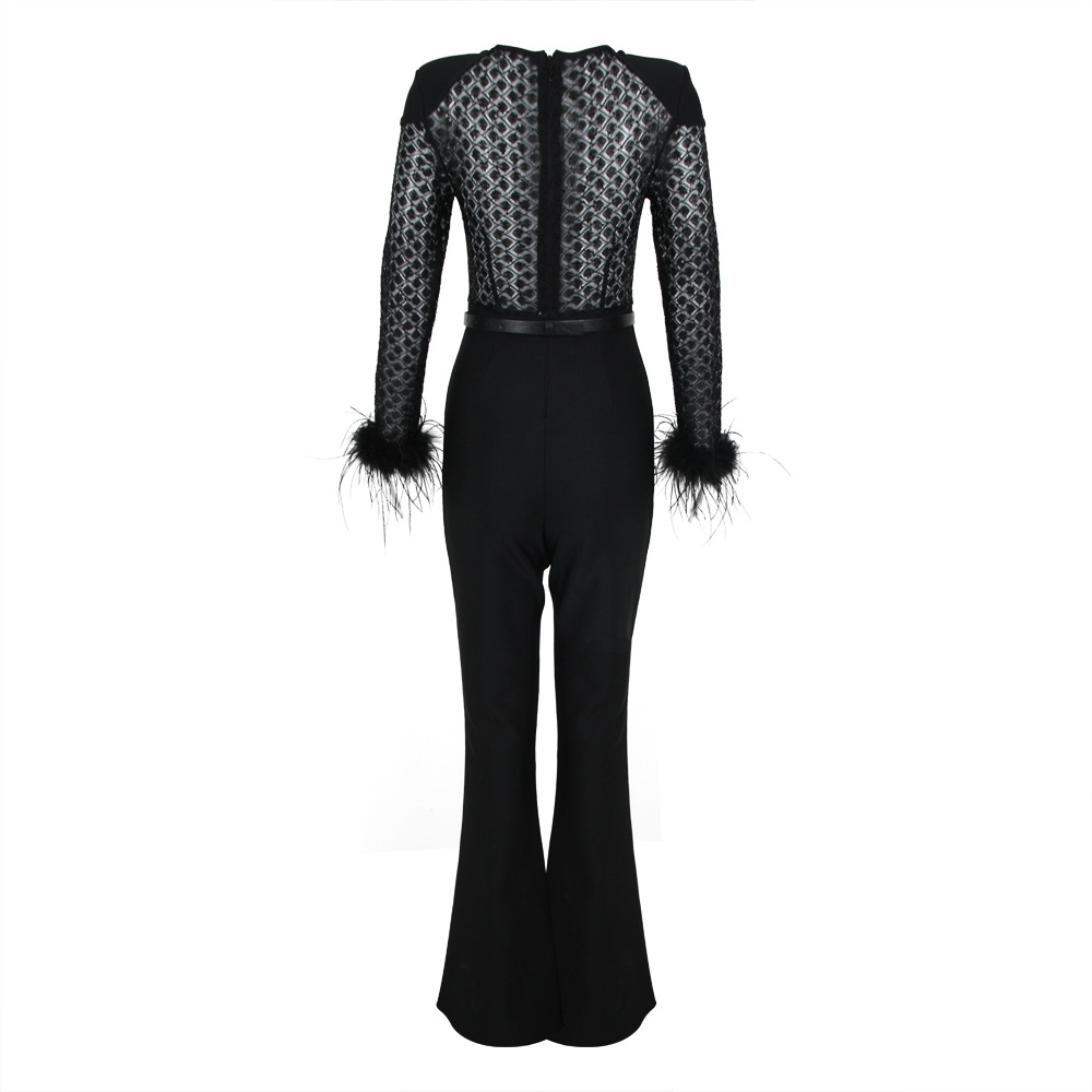 2024 primavera europea y americana nueva moda sexy encaje lentejuelas pluma vendaje mono mujer entrega de una sola pieza