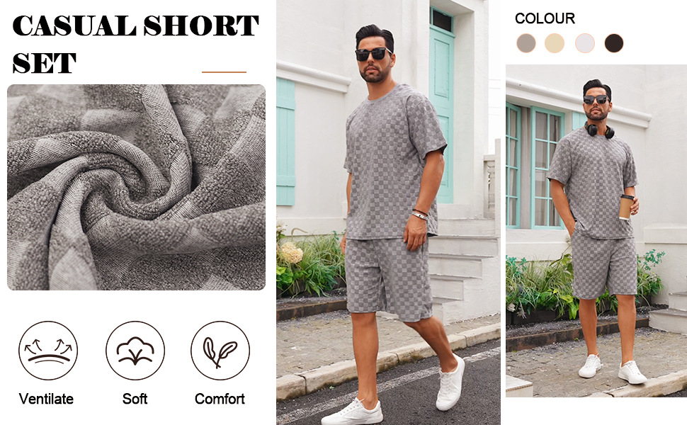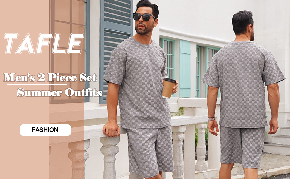 Conjunto de verano 2025 para hombre, camiseta de manga corta con estampado jacquard a cuadros, holgada, talla grande, y pantalones cortos casuales rectos.