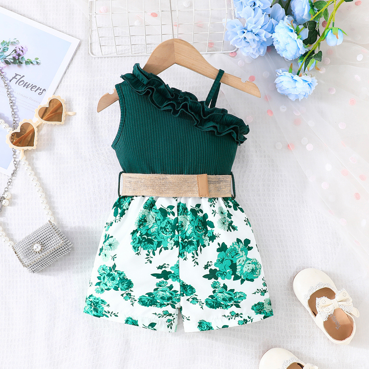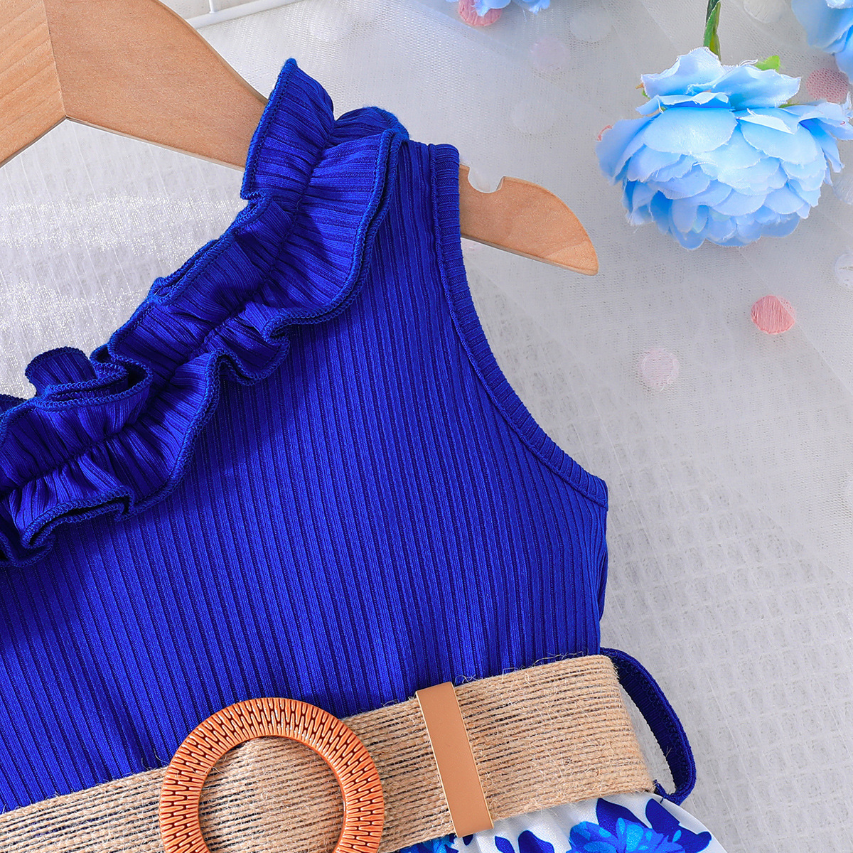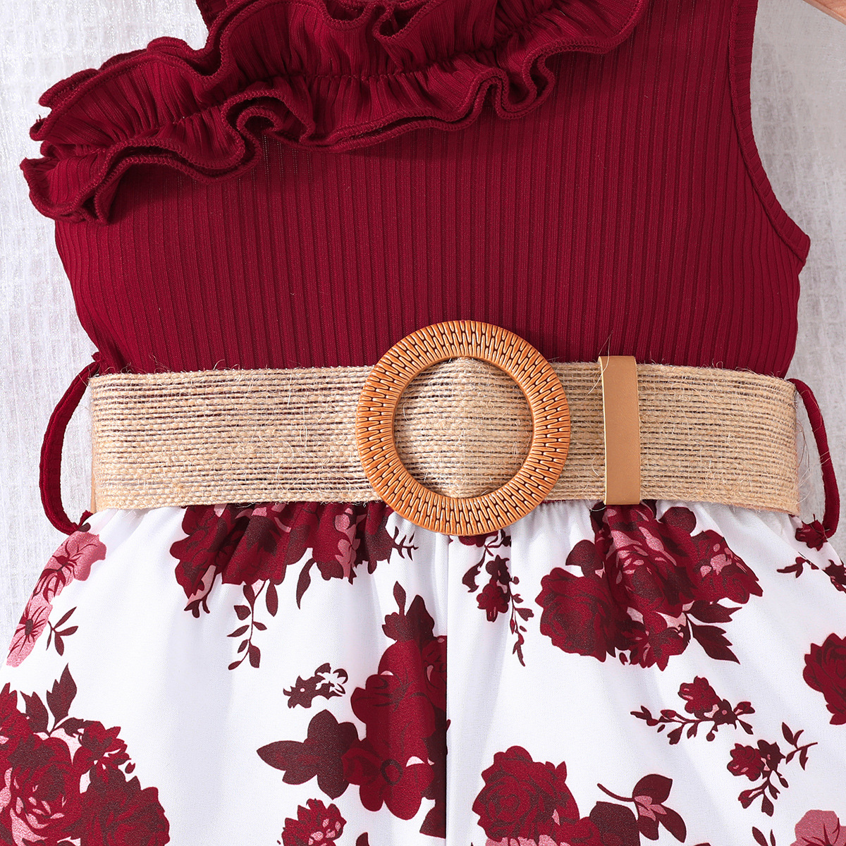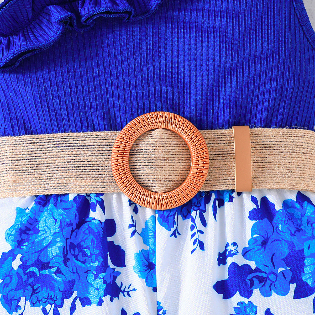 2024 transfronterizo nuevo verano sin mangas correa de encaje escote costura flor imprimir mono en stock al por mayor