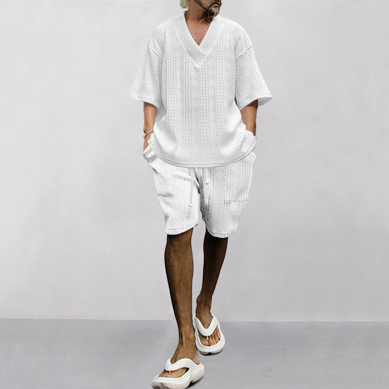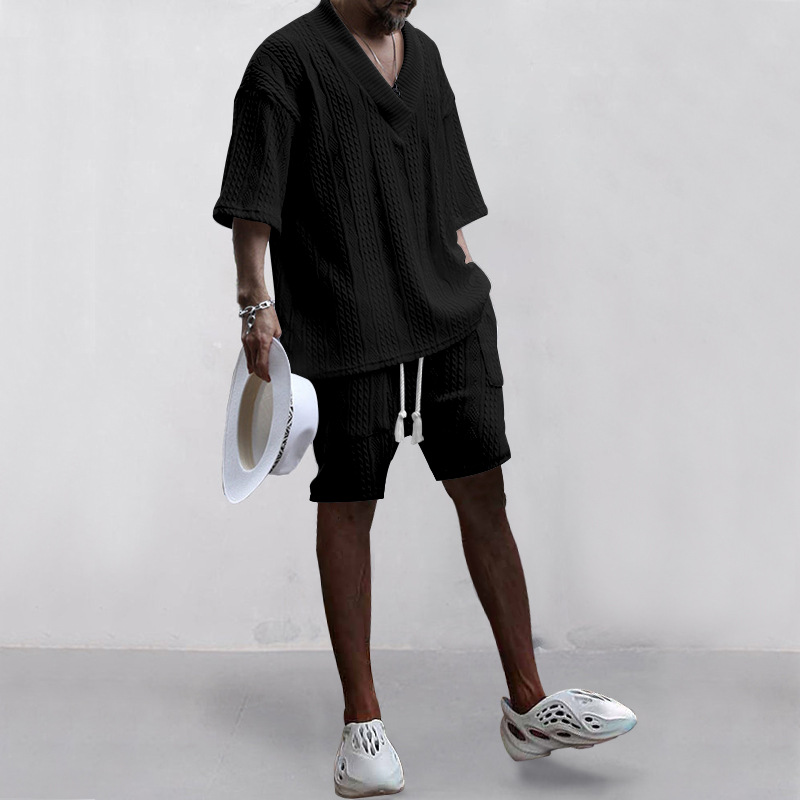 2024 transfronterizos primavera y verano nuevo europeo y americano casual suelta de tres cuartos de manga jacquard suéter Top shorts traje de los hombres