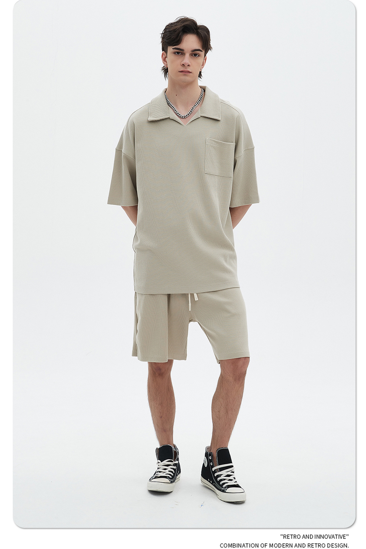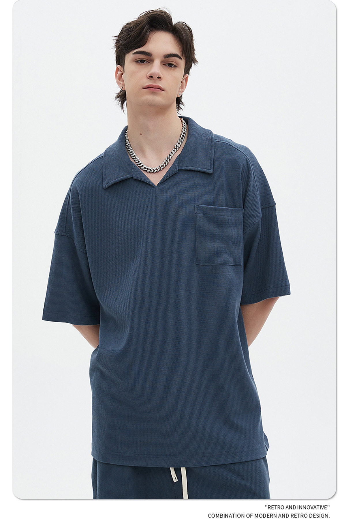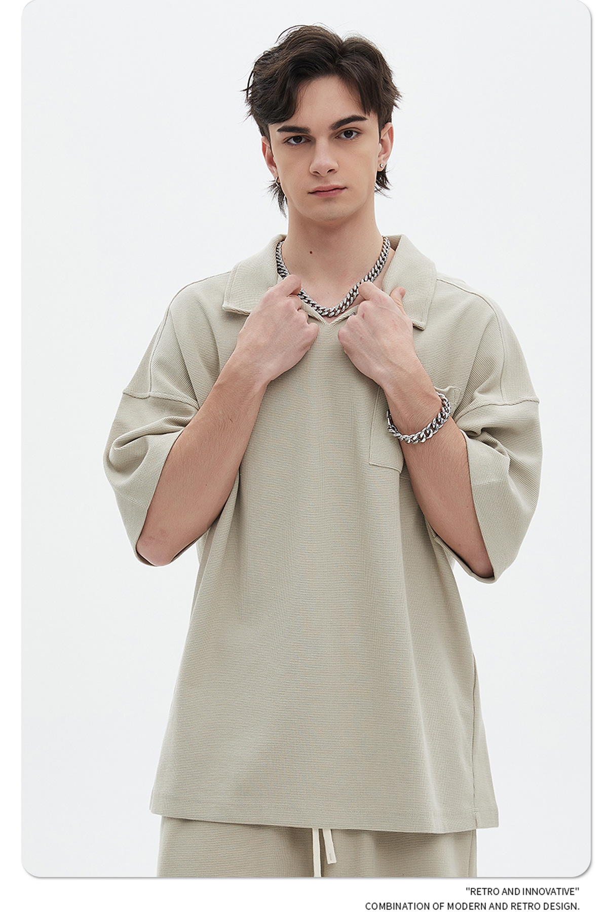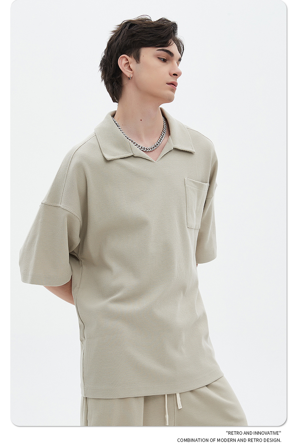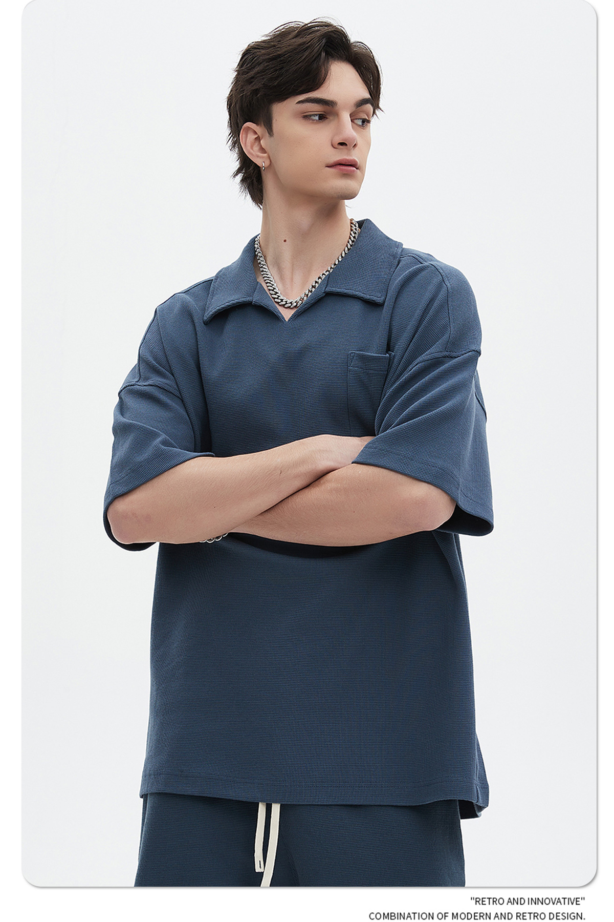 Camiseta de manga corta para hombre, estilo waffle transpirable, talla grande, estilo europeo y americano, holgada, con cuello tipo solapa, moda urbana 2025.
