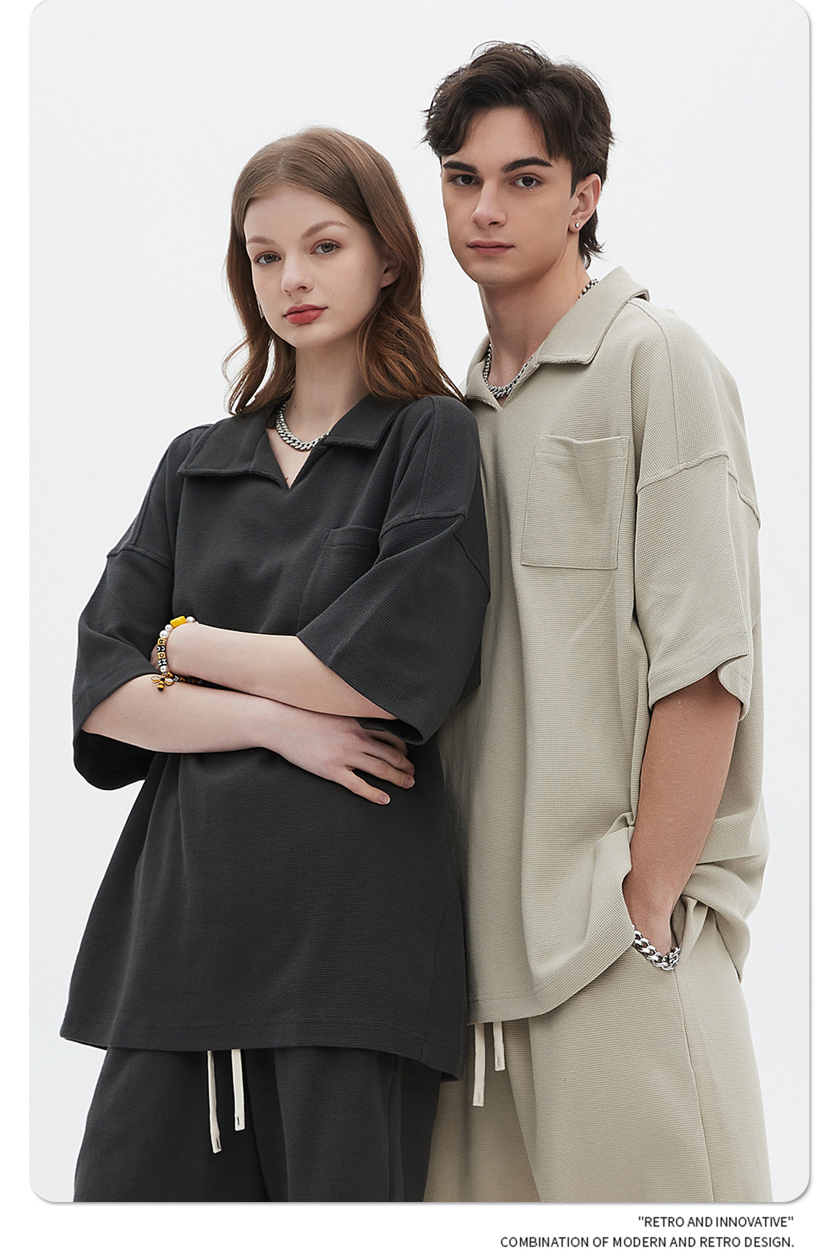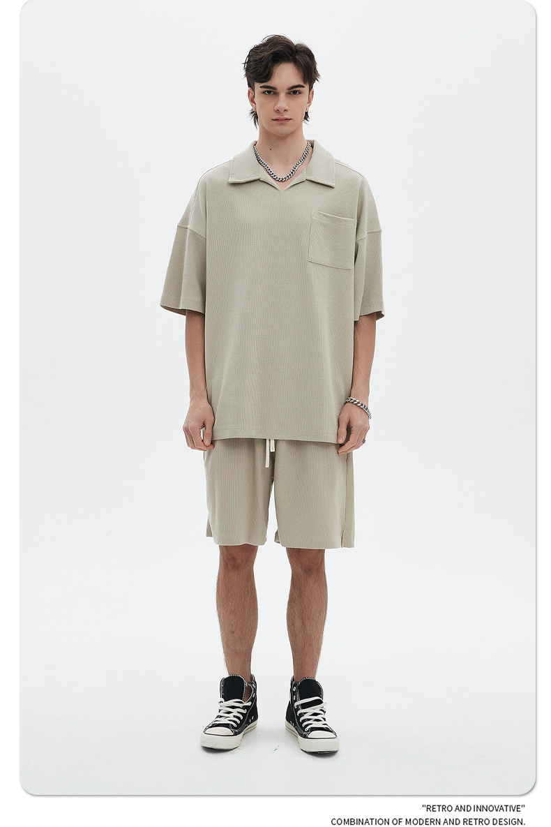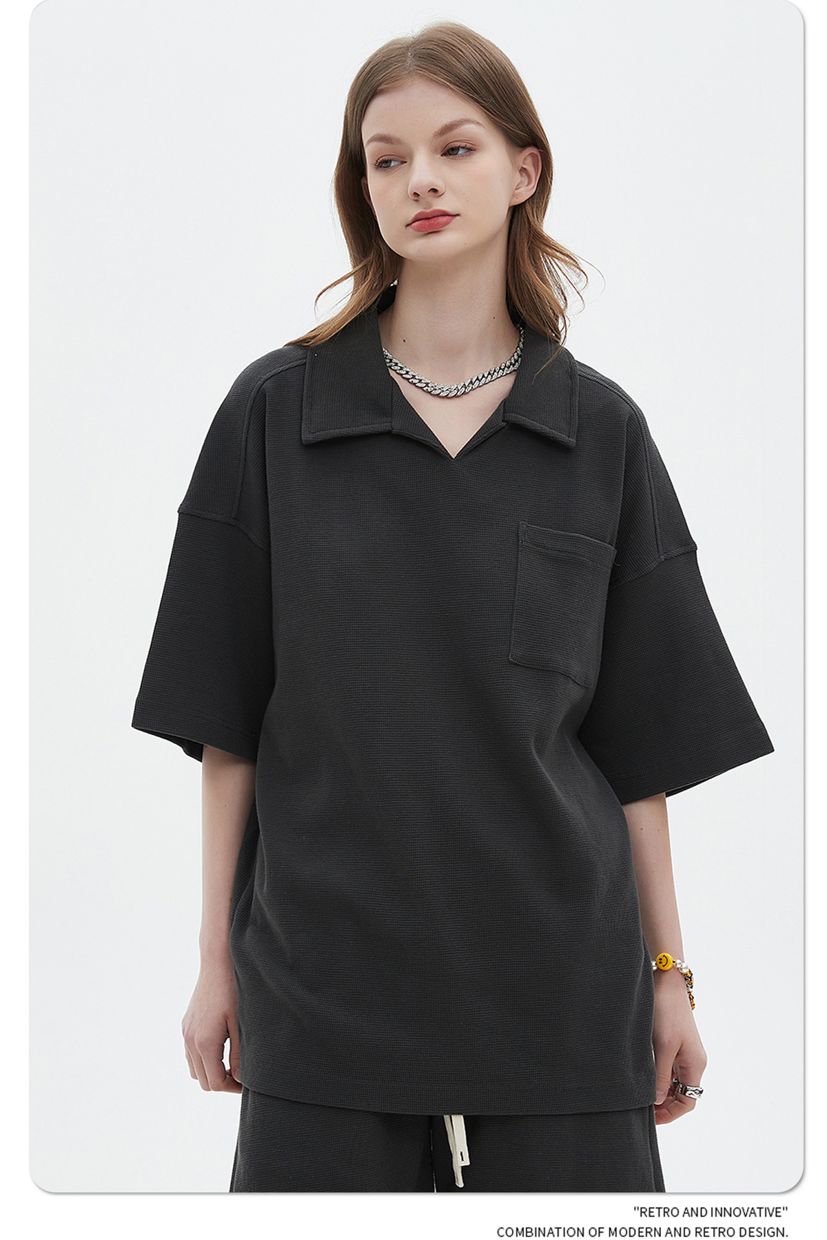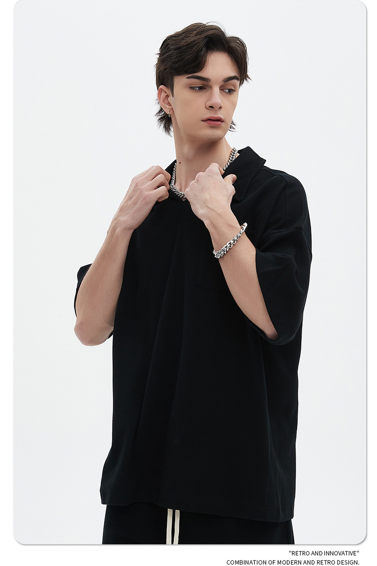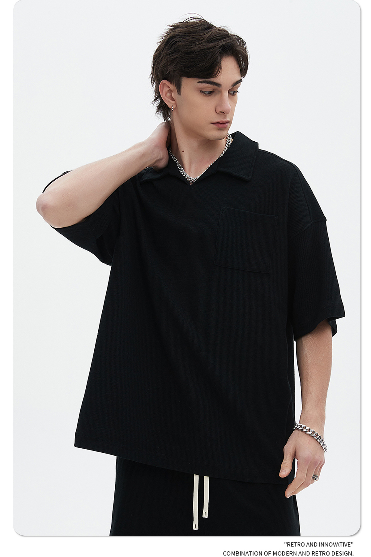 Camiseta de manga corta para hombre, estilo waffle transpirable, talla grande, estilo europeo y americano, holgada, con cuello tipo solapa, moda urbana 2025.