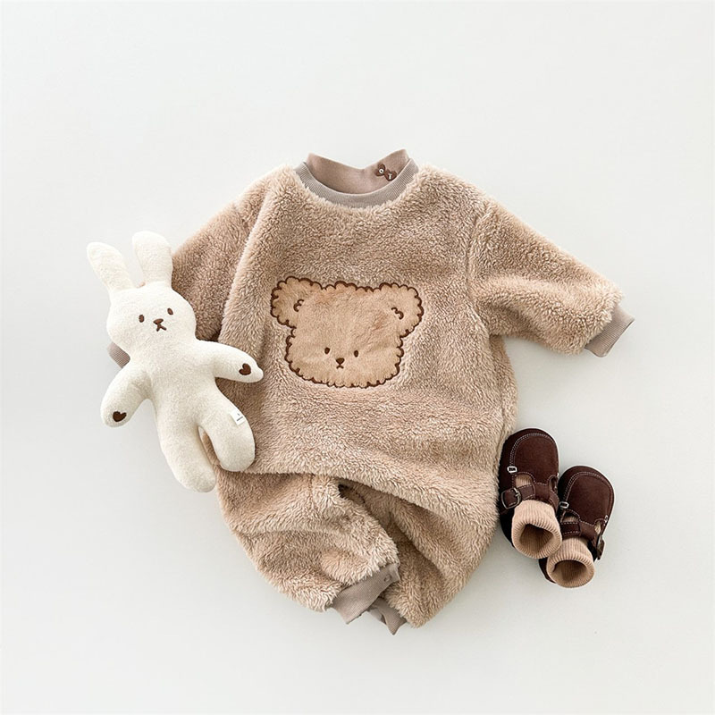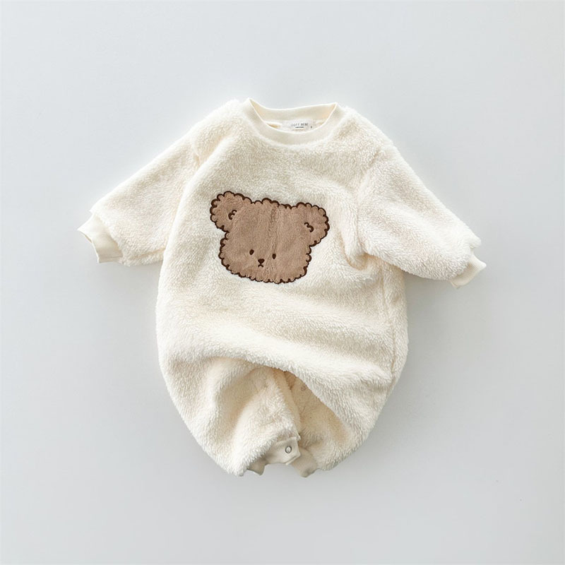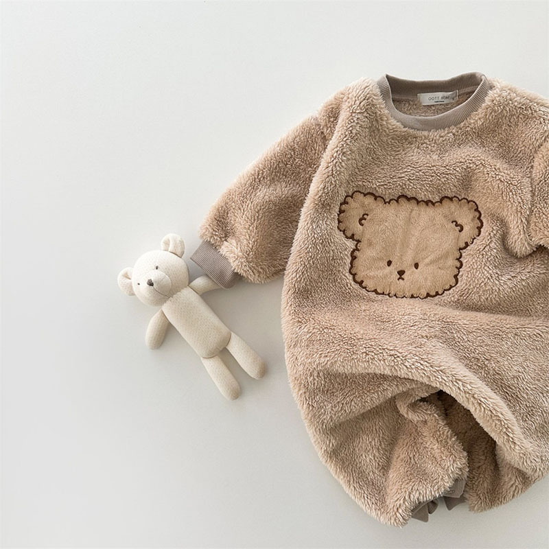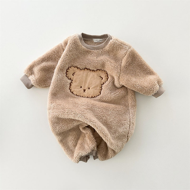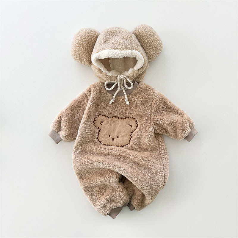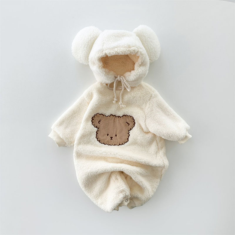 Estilo coreano nuevo bebé 23 invierno niños y niñas suave felpa mono romper desgaste al aire libre sombrero desmontable