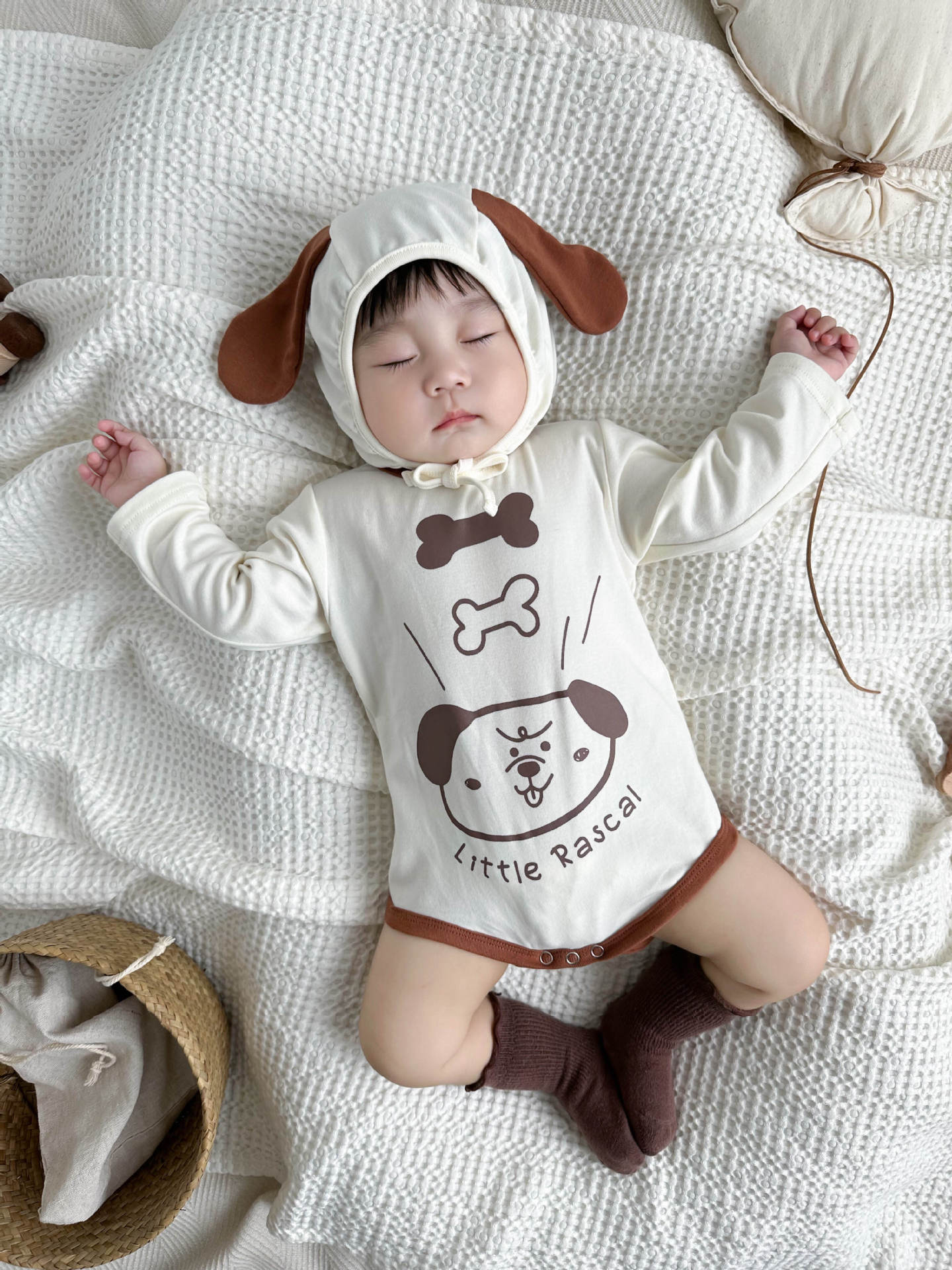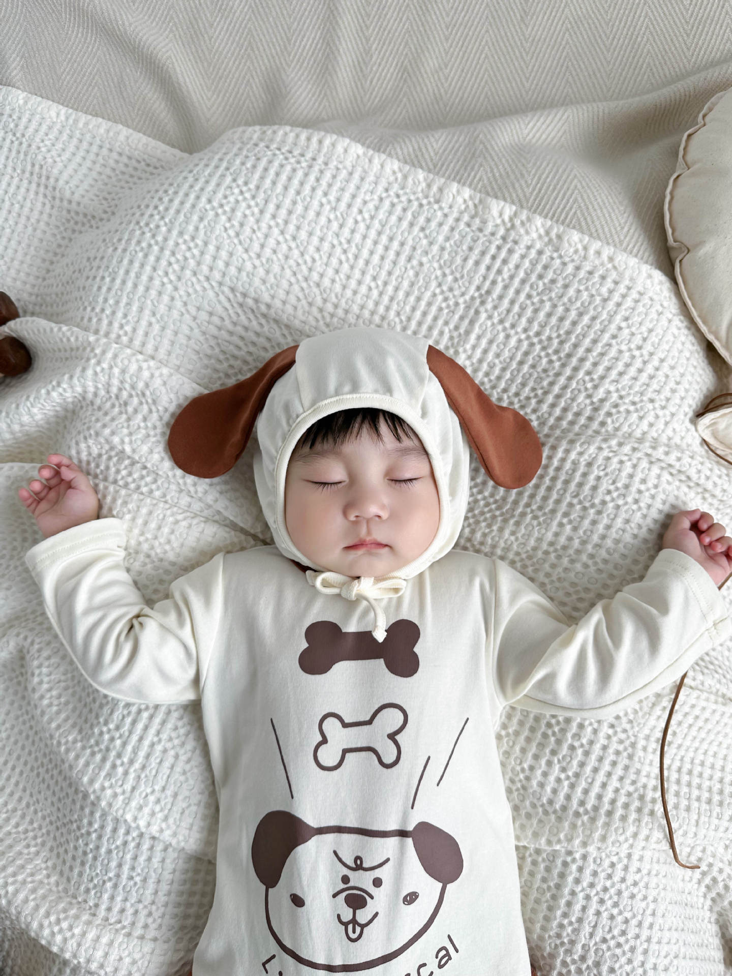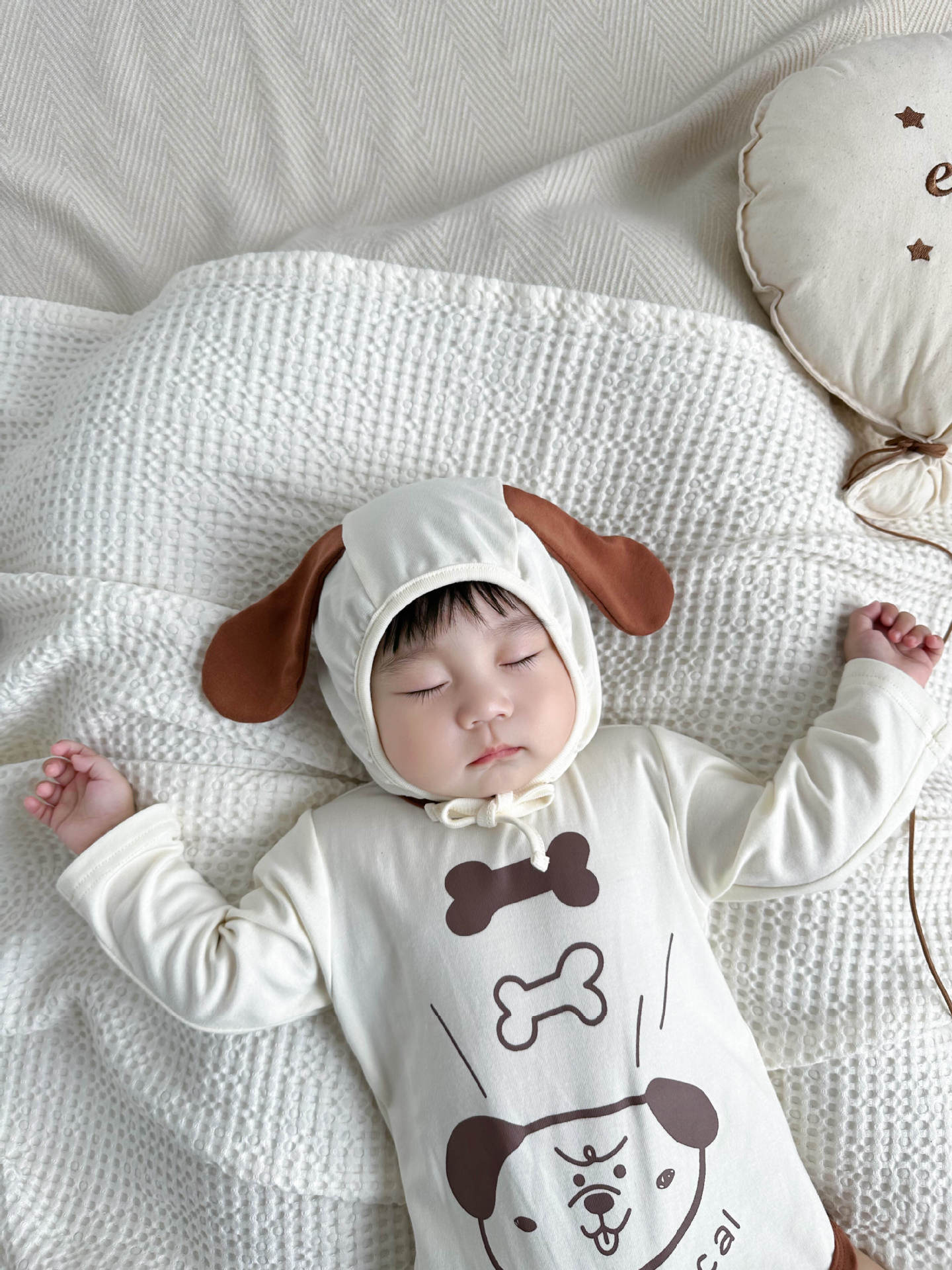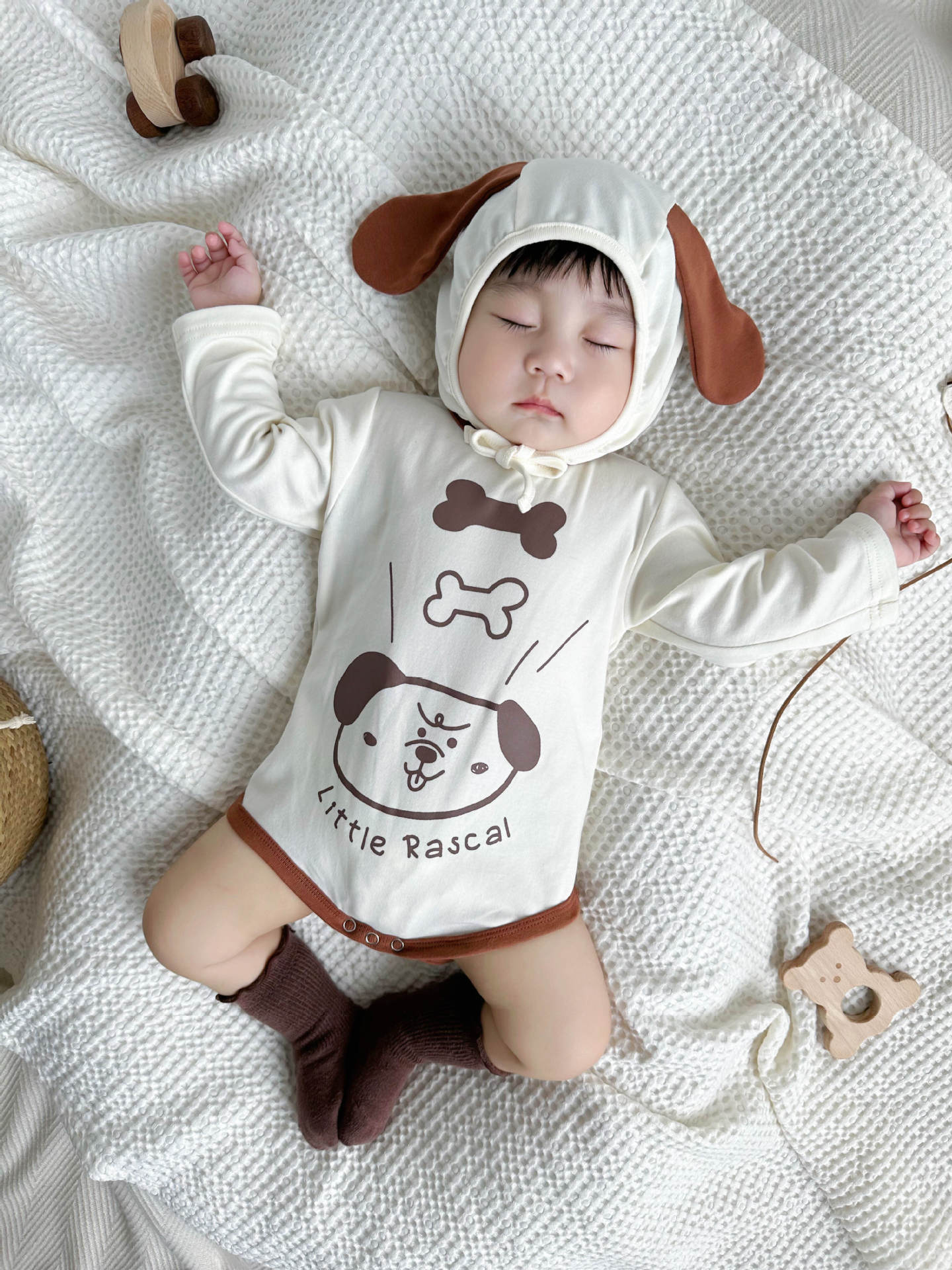 24 primavera estilo coreano bebé mono traje ins estilo cachorro impresión modelado mameluco bebé vaina con sombrero