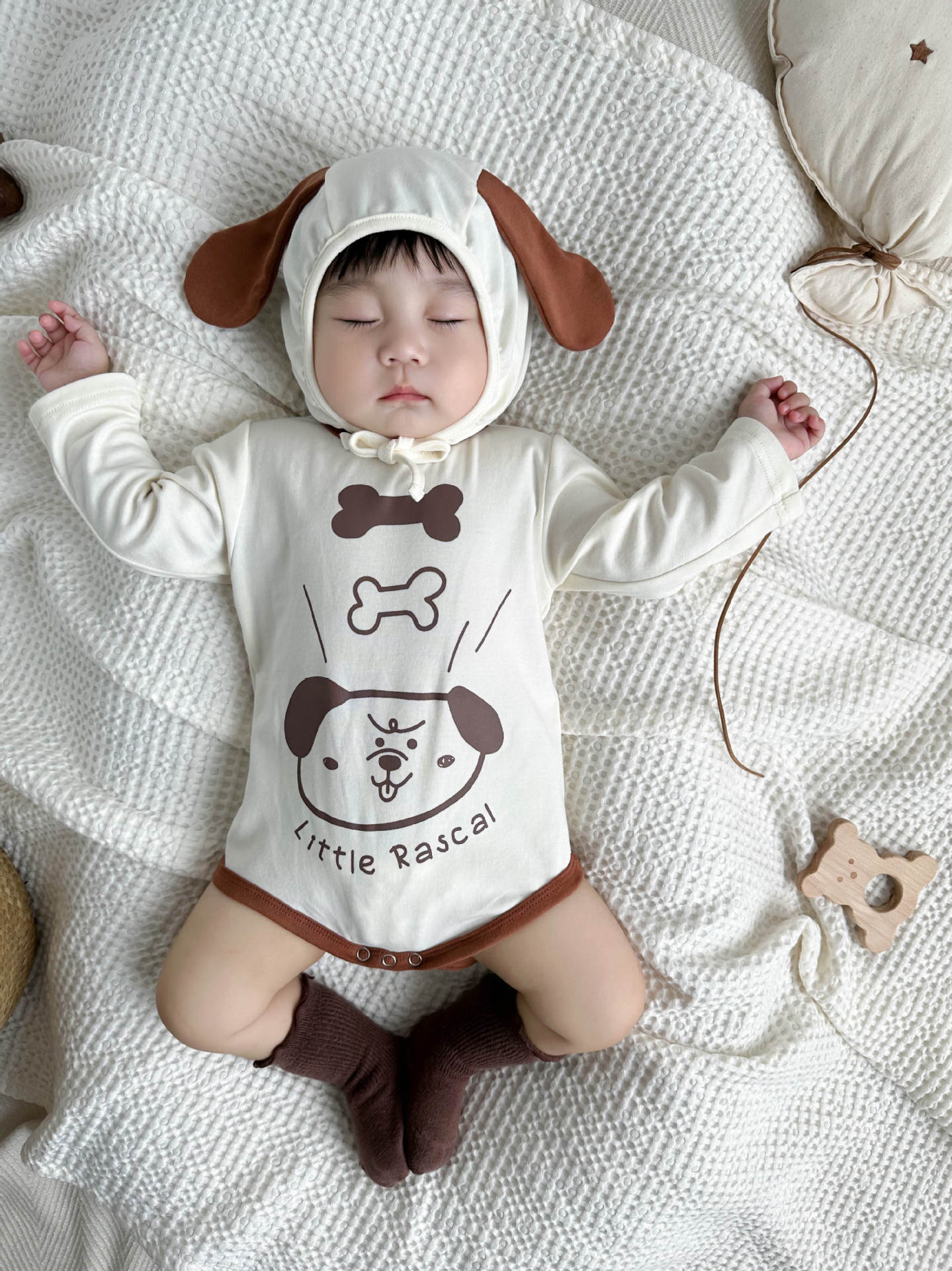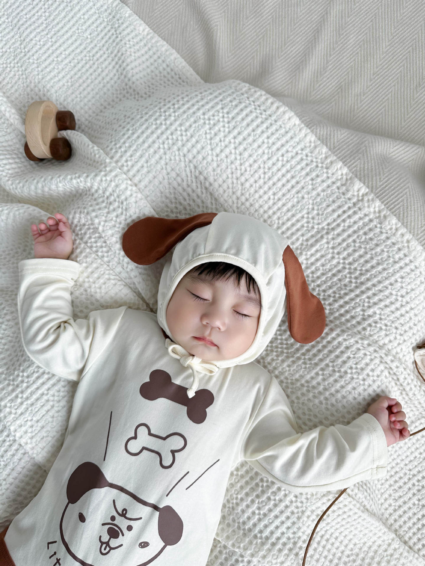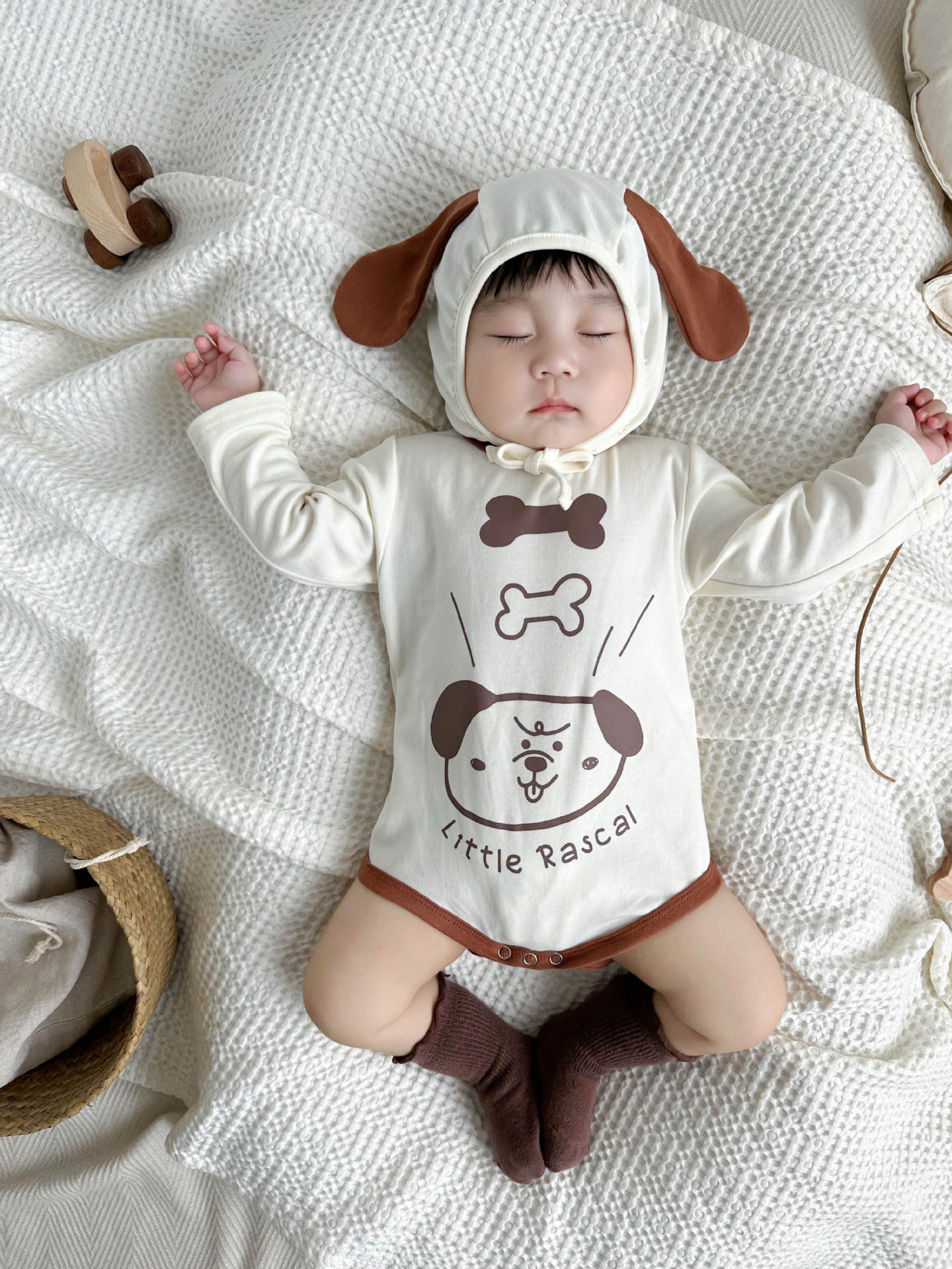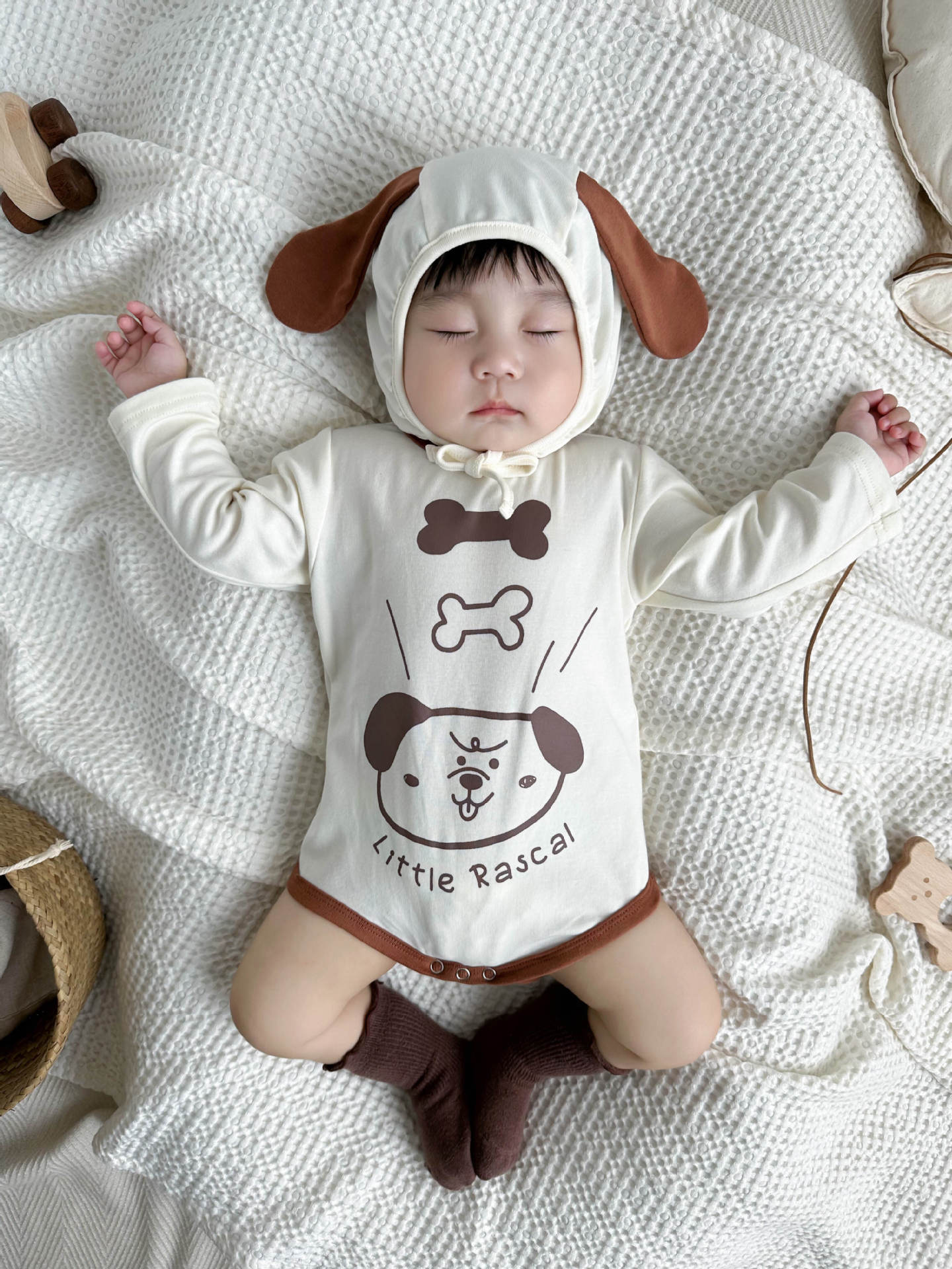 24 primavera estilo coreano bebé mono traje ins estilo cachorro impresión modelado mameluco bebé vaina con sombrero