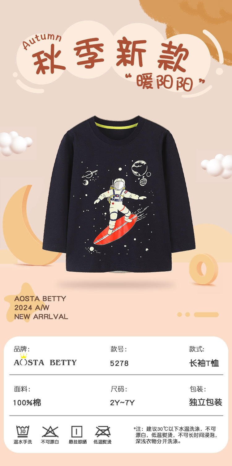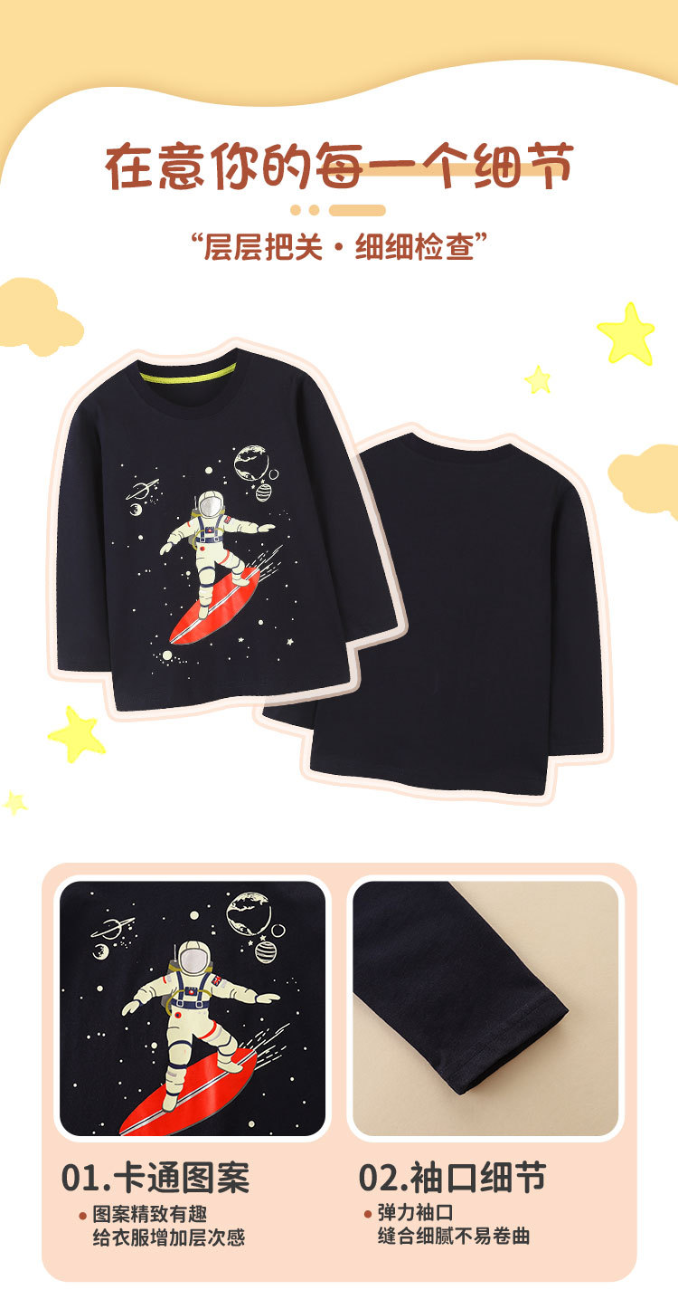 Camiseta de manga larga para niños de algodón europeo y americano otoño nueva tendenciayy astronauta planeta estampado top luminoso para niños