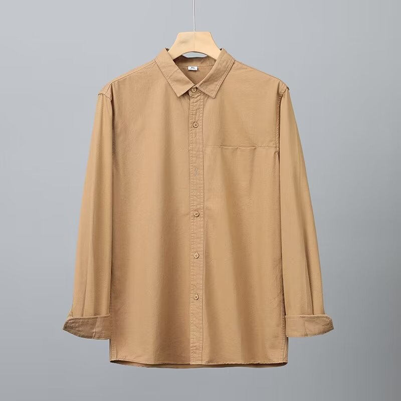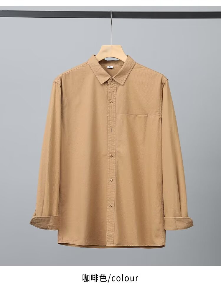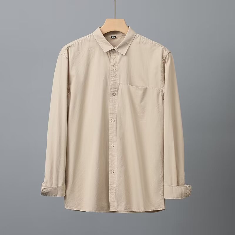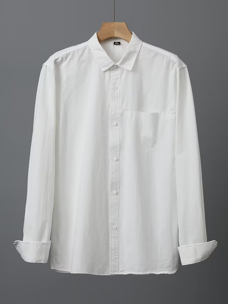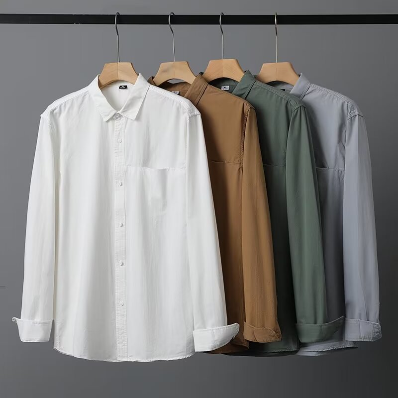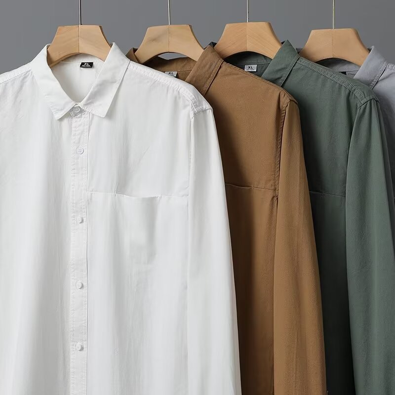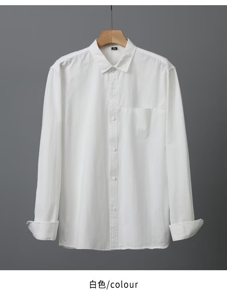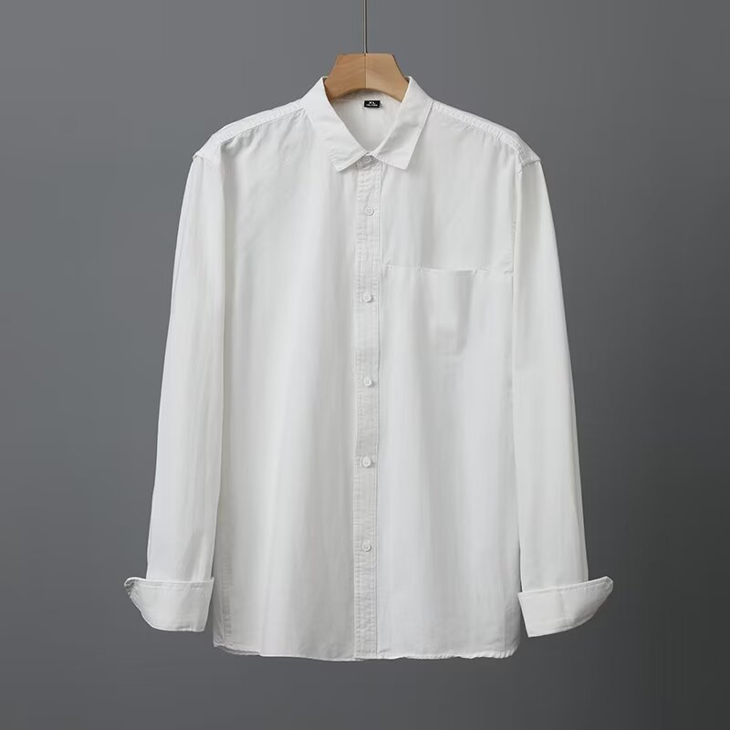 Camisa de algodón blanco pesado americano para hombres, primavera y otoño, casual, suelta, camisa de solapa de manga larga, chaqueta superior