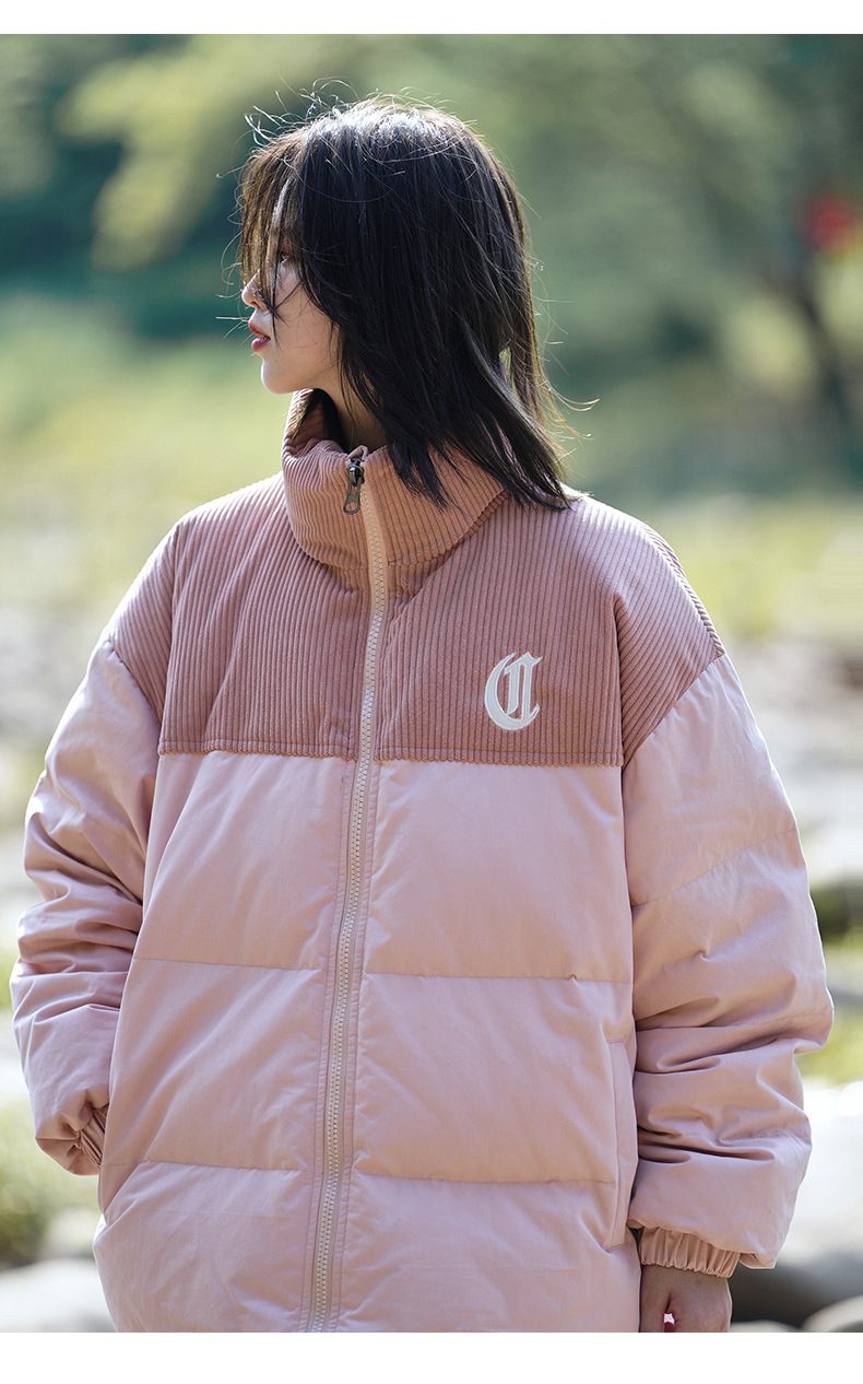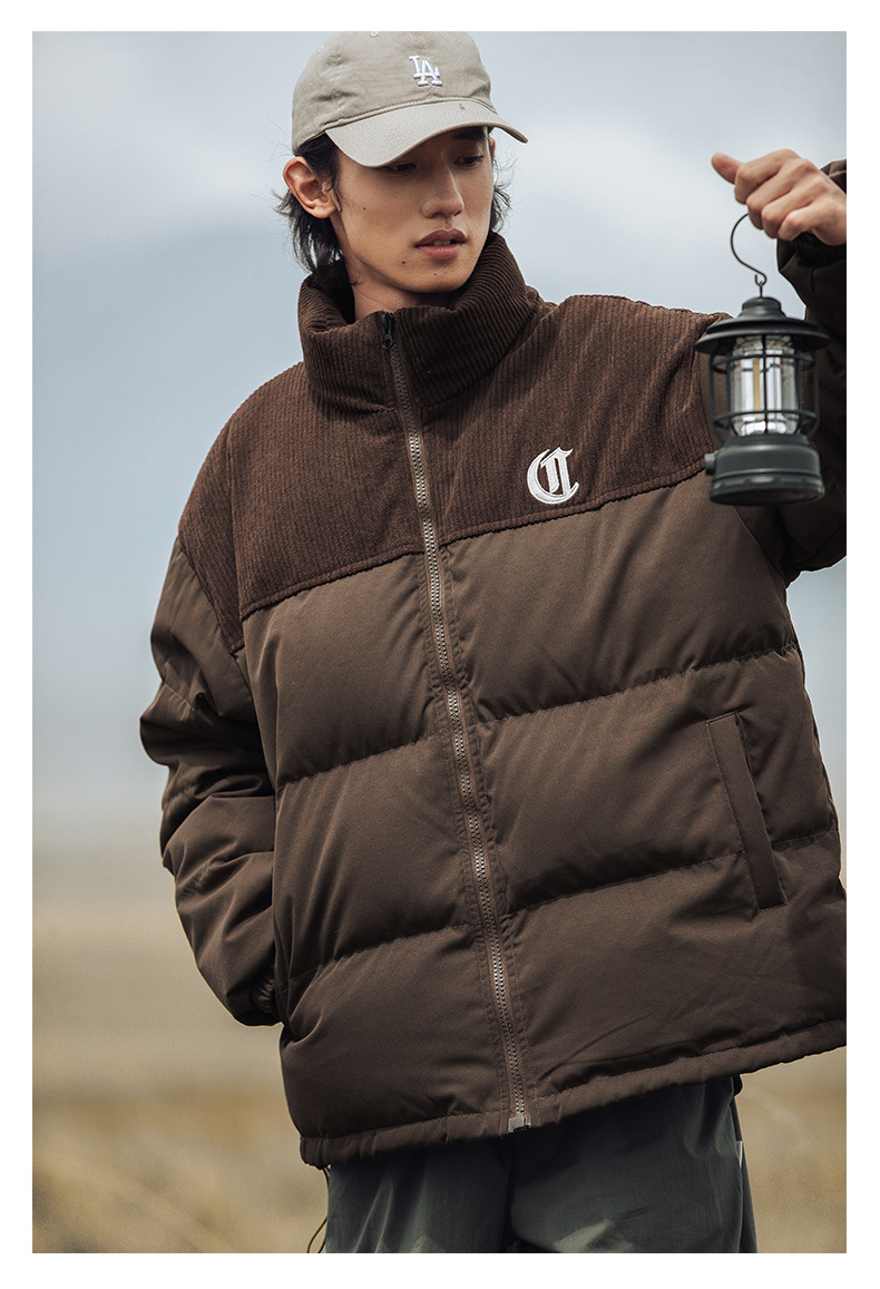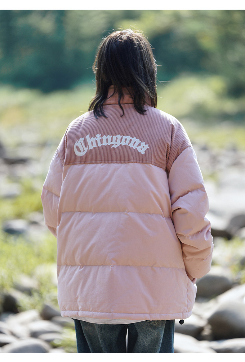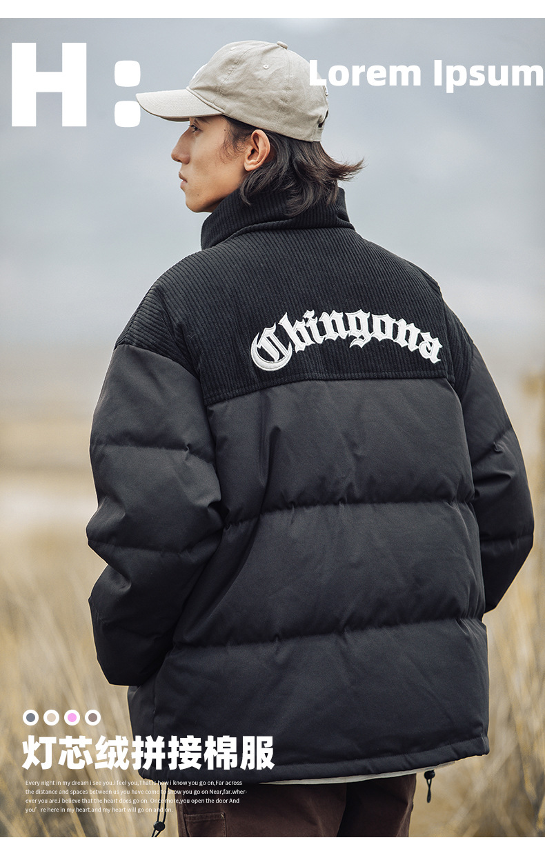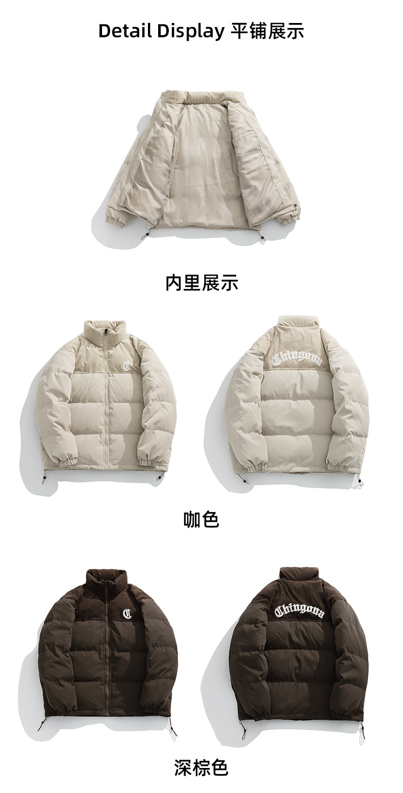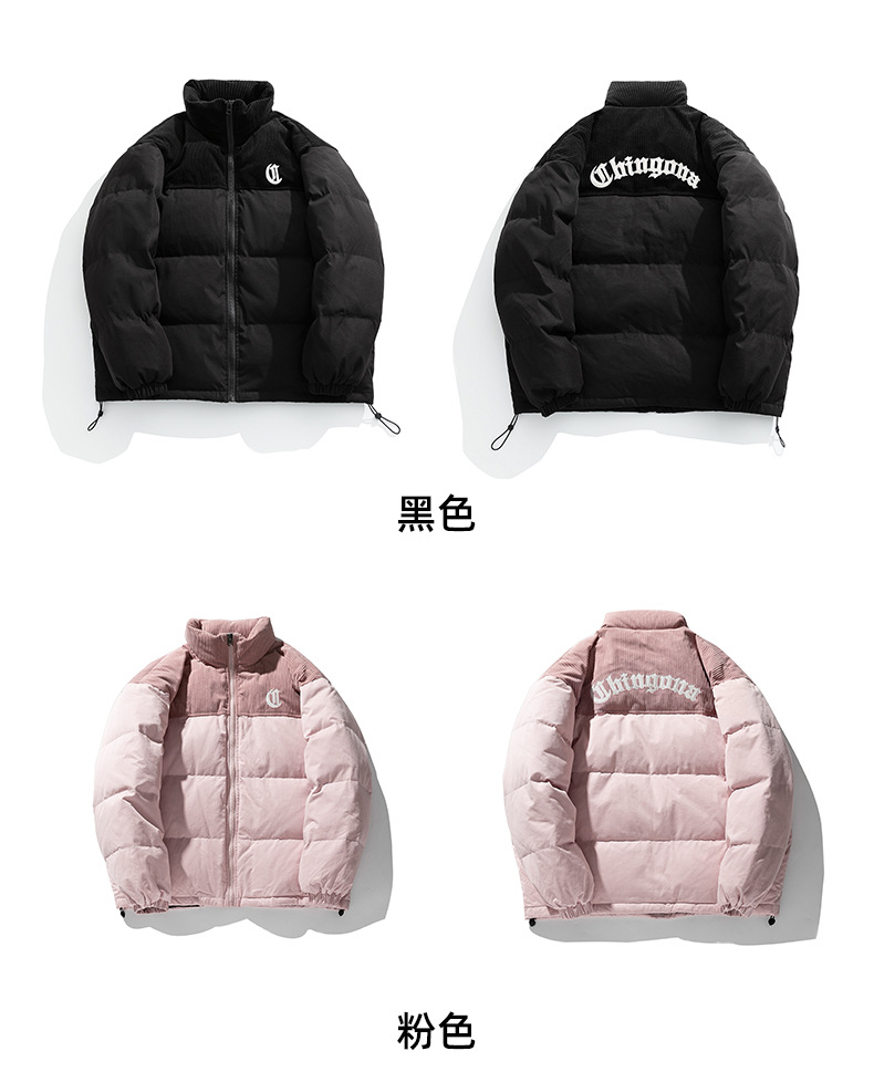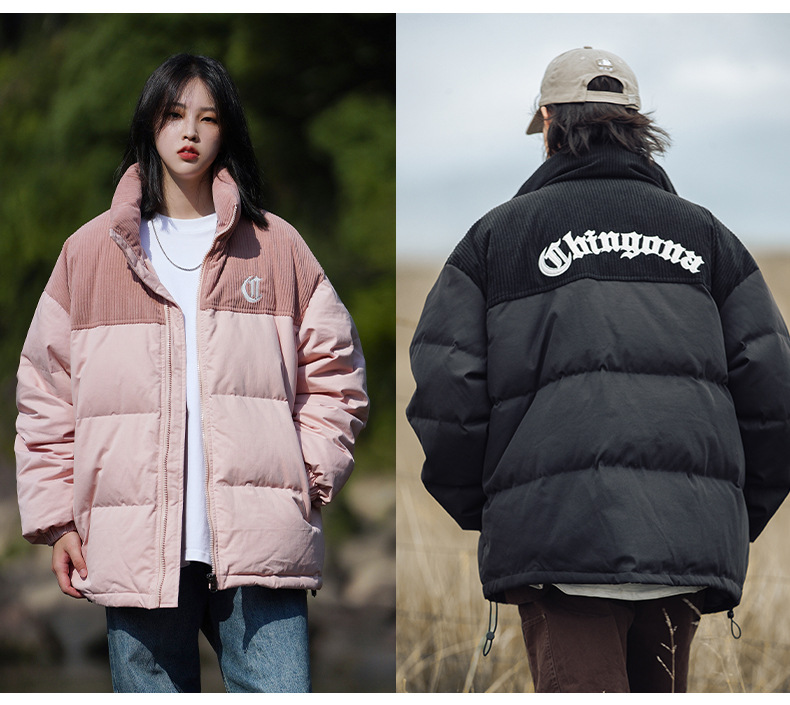 Chaqueta de pana con cuello alto y patchwork de algodón, chaqueta acolchada gruesa de invierno, chaqueta de algodón con bordado de letras de marca de moda para parejas
