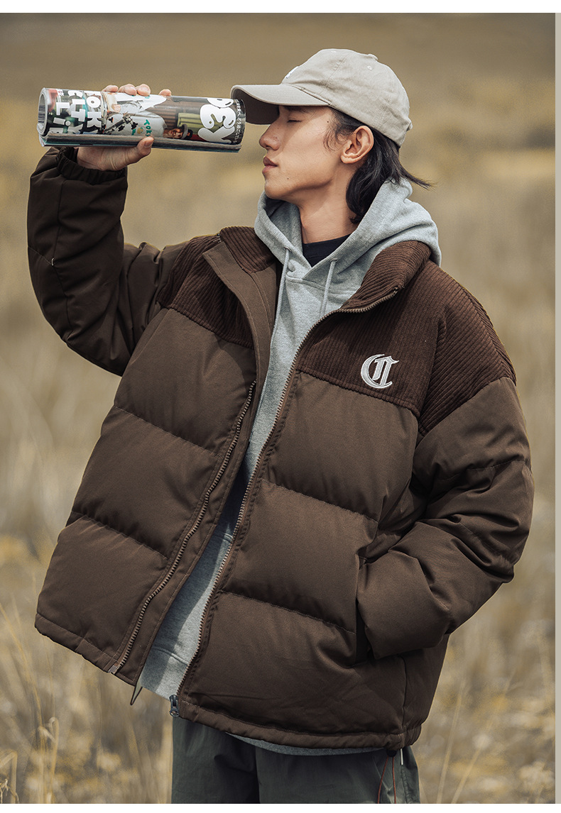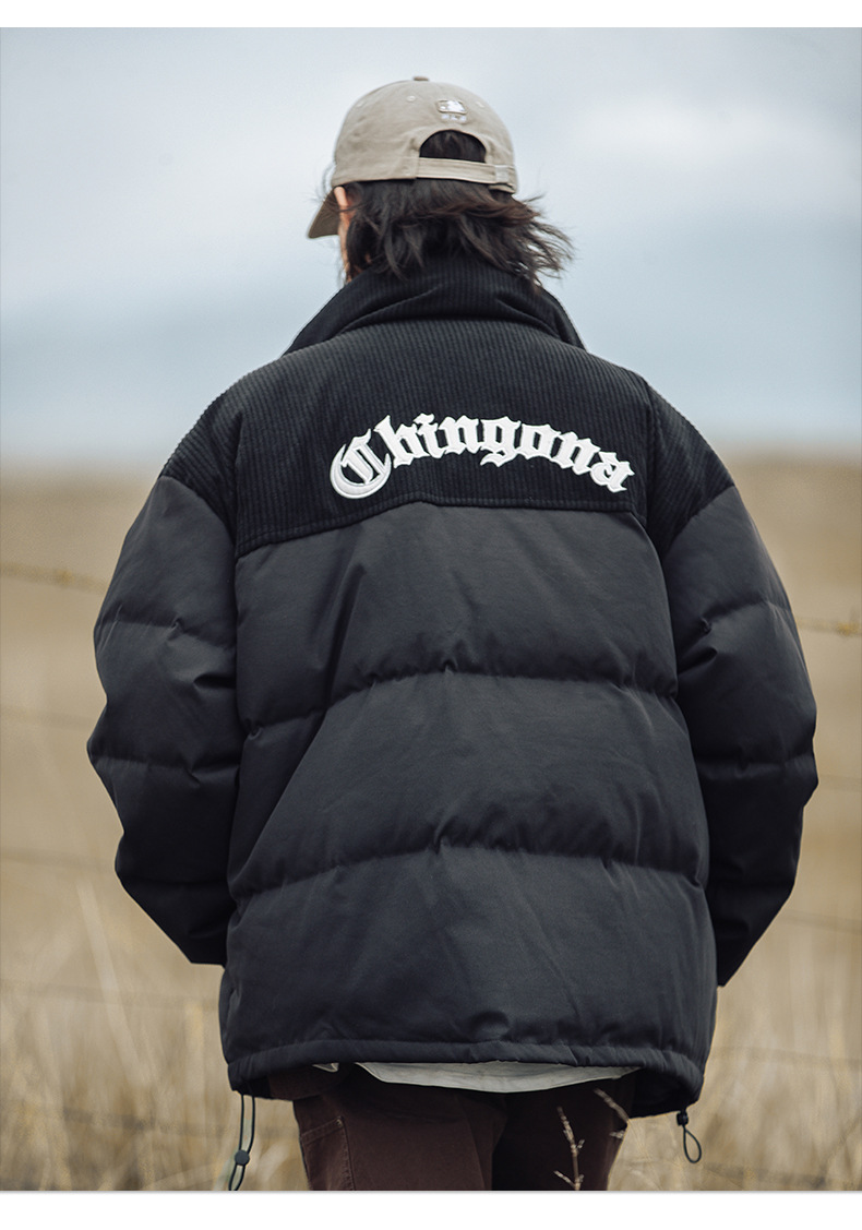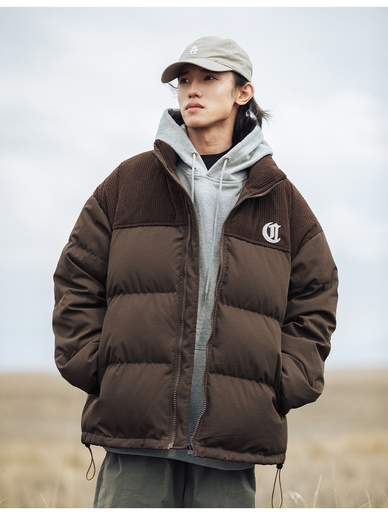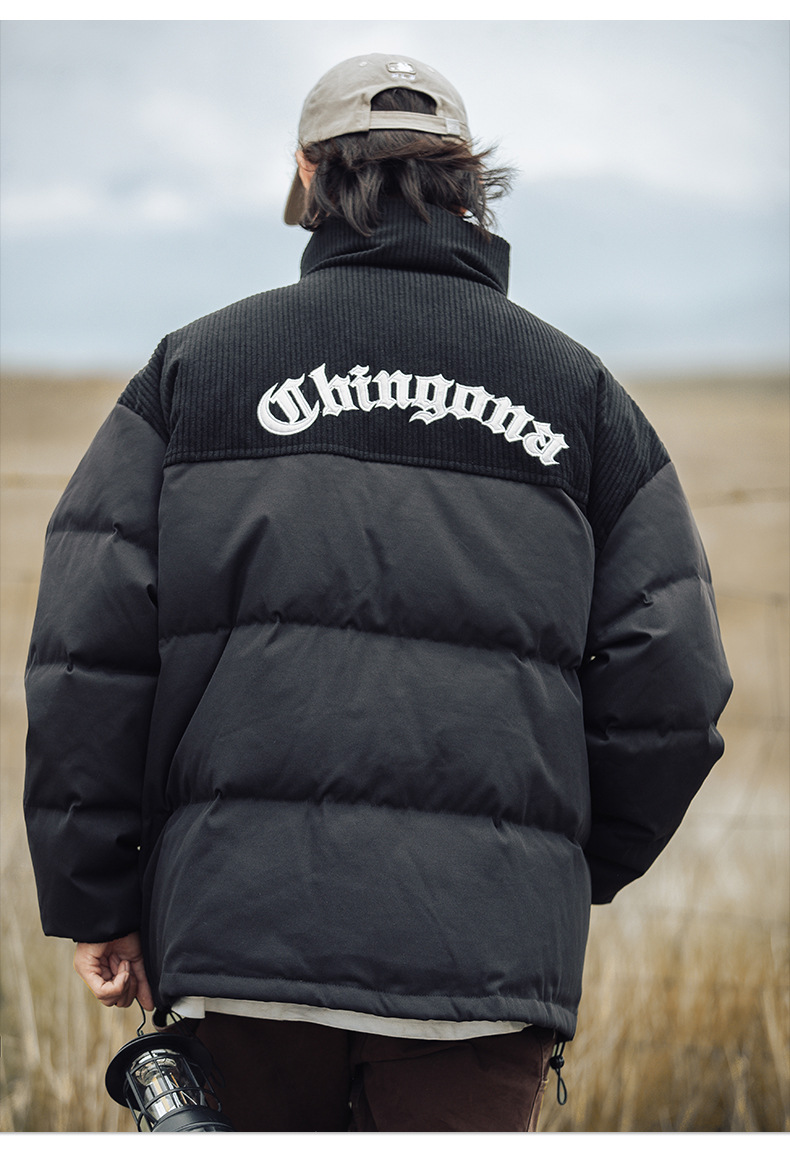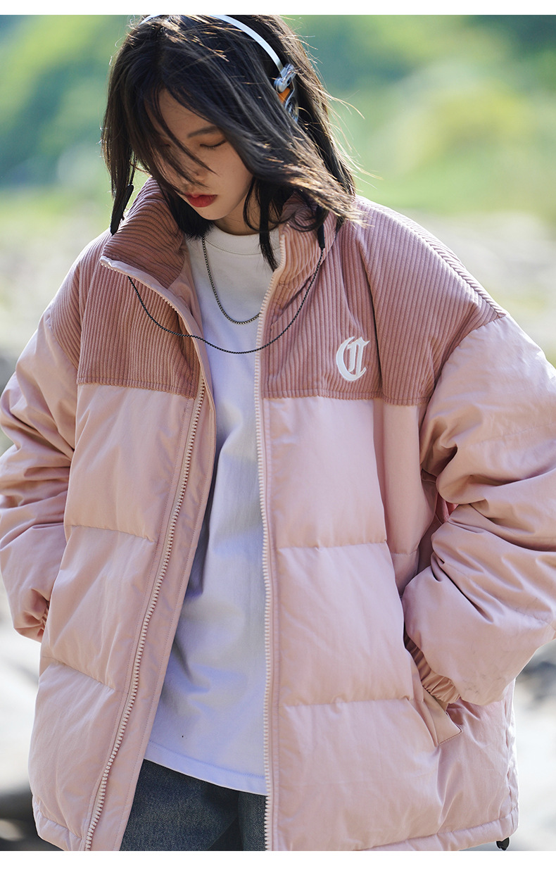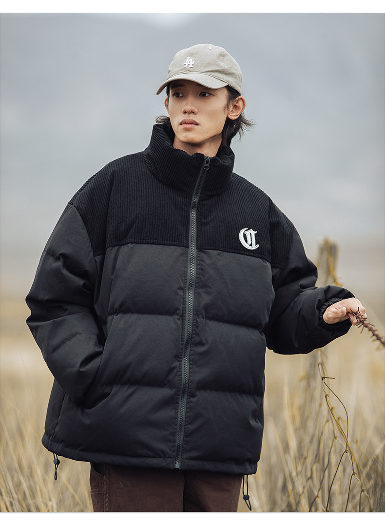 Chaqueta de pana con cuello alto y patchwork de algodón, chaqueta acolchada gruesa de invierno, chaqueta de algodón con bordado de letras de marca de moda para parejas