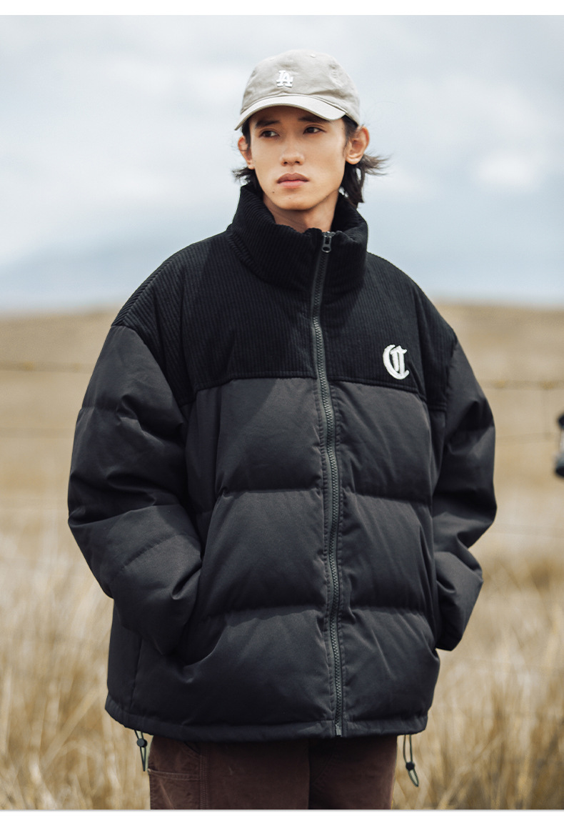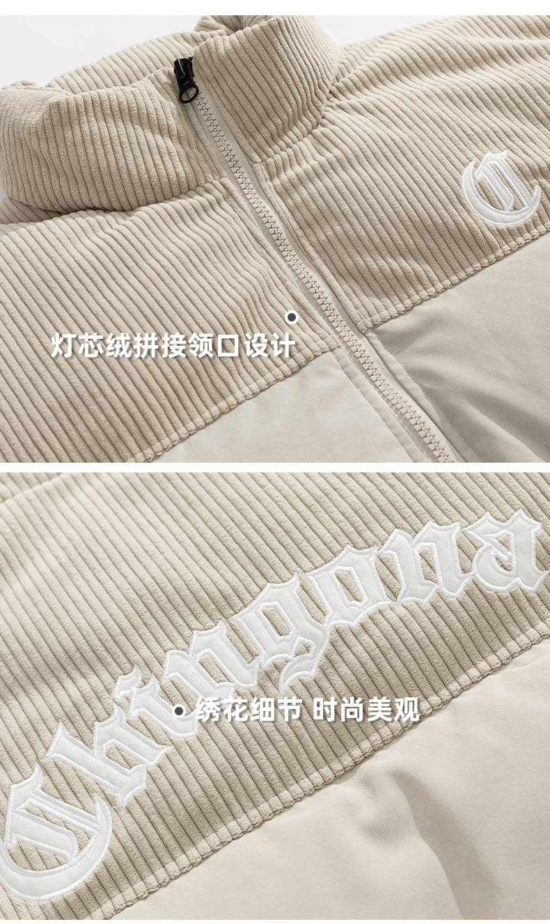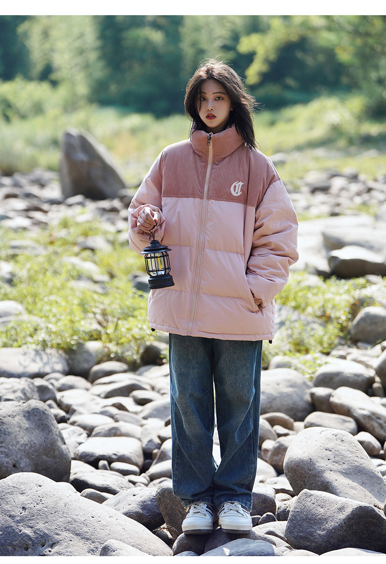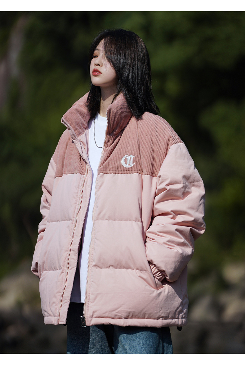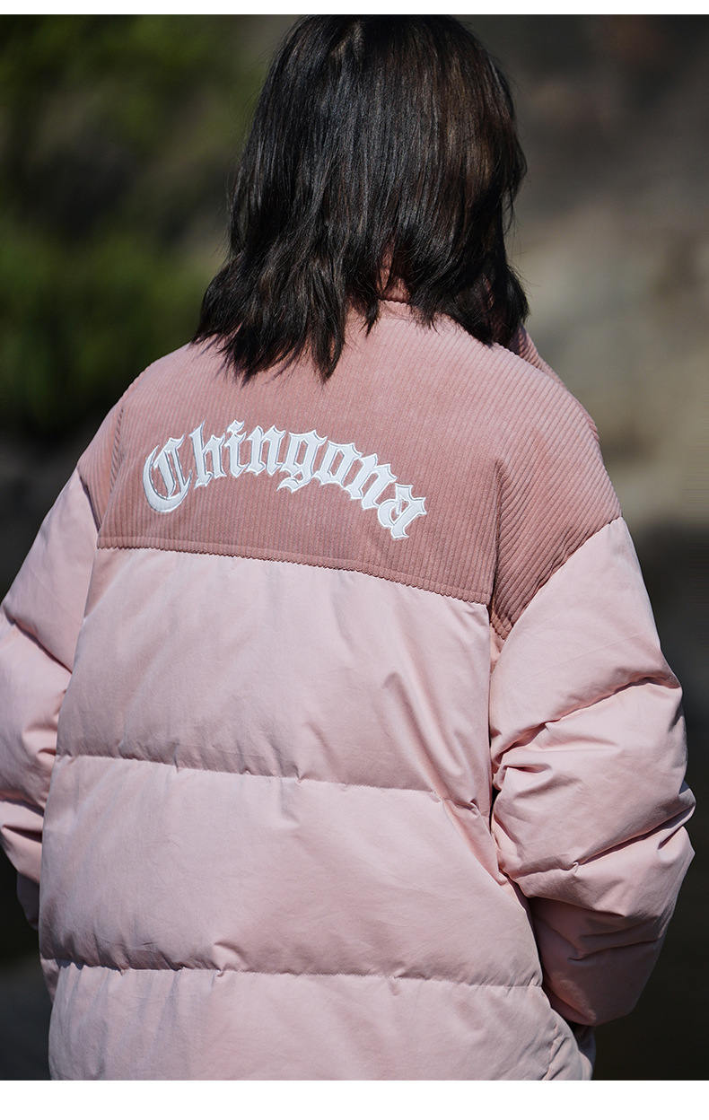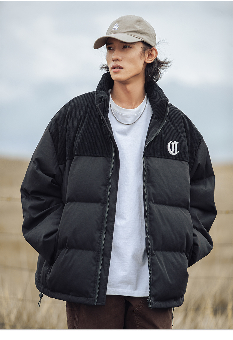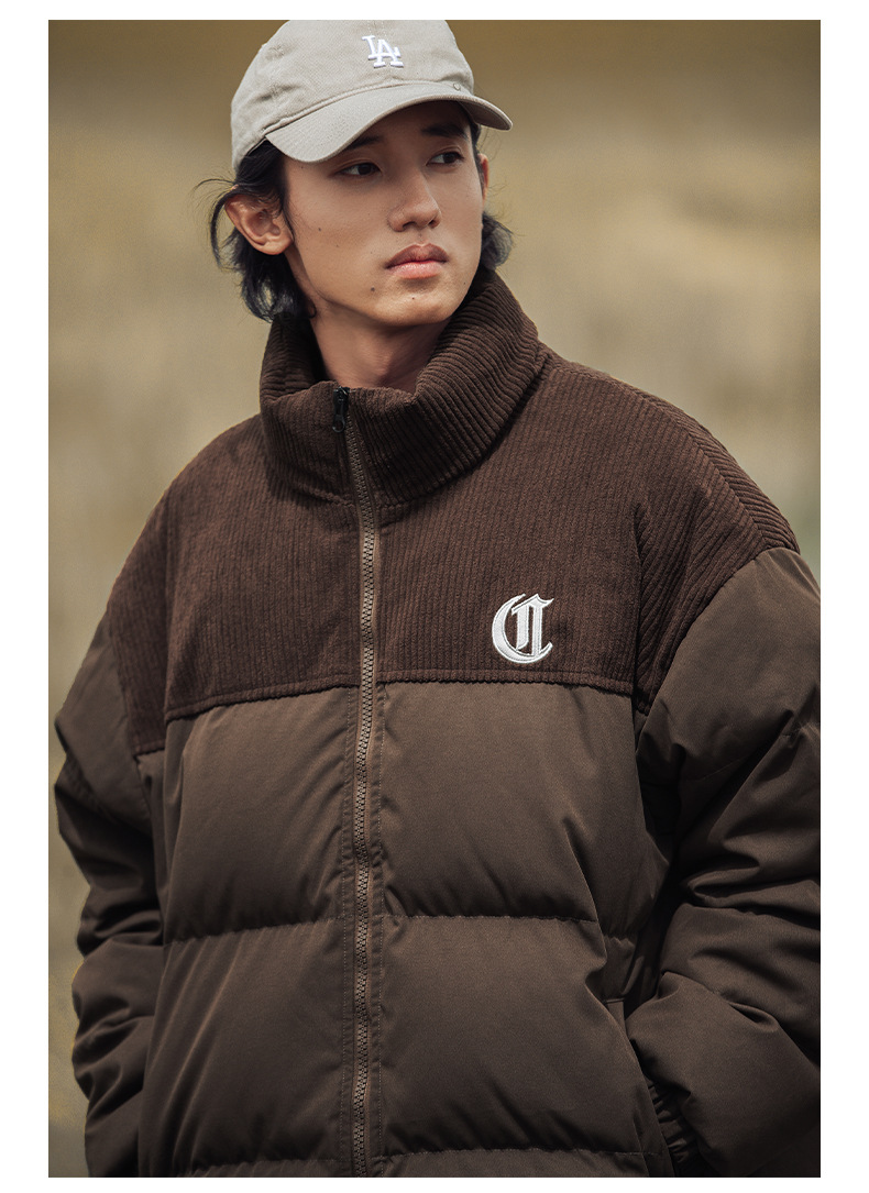 Chaqueta de pana con cuello alto y patchwork de algodón, chaqueta acolchada gruesa de invierno, chaqueta de algodón con bordado de letras de marca de moda para parejas