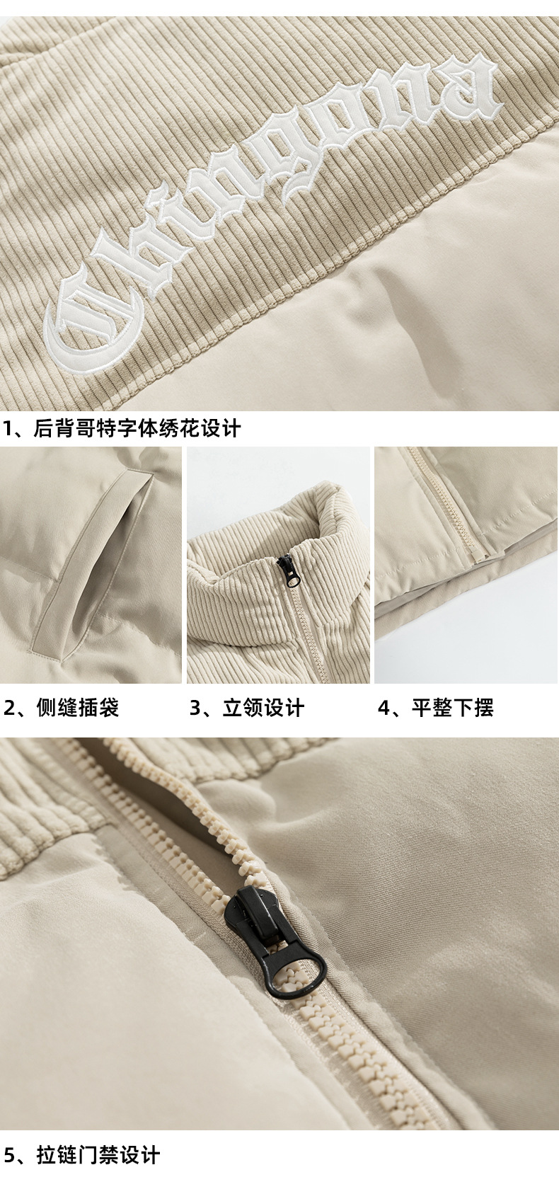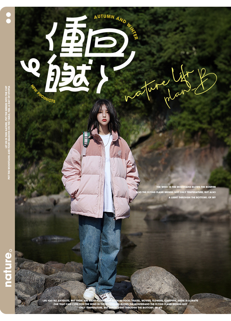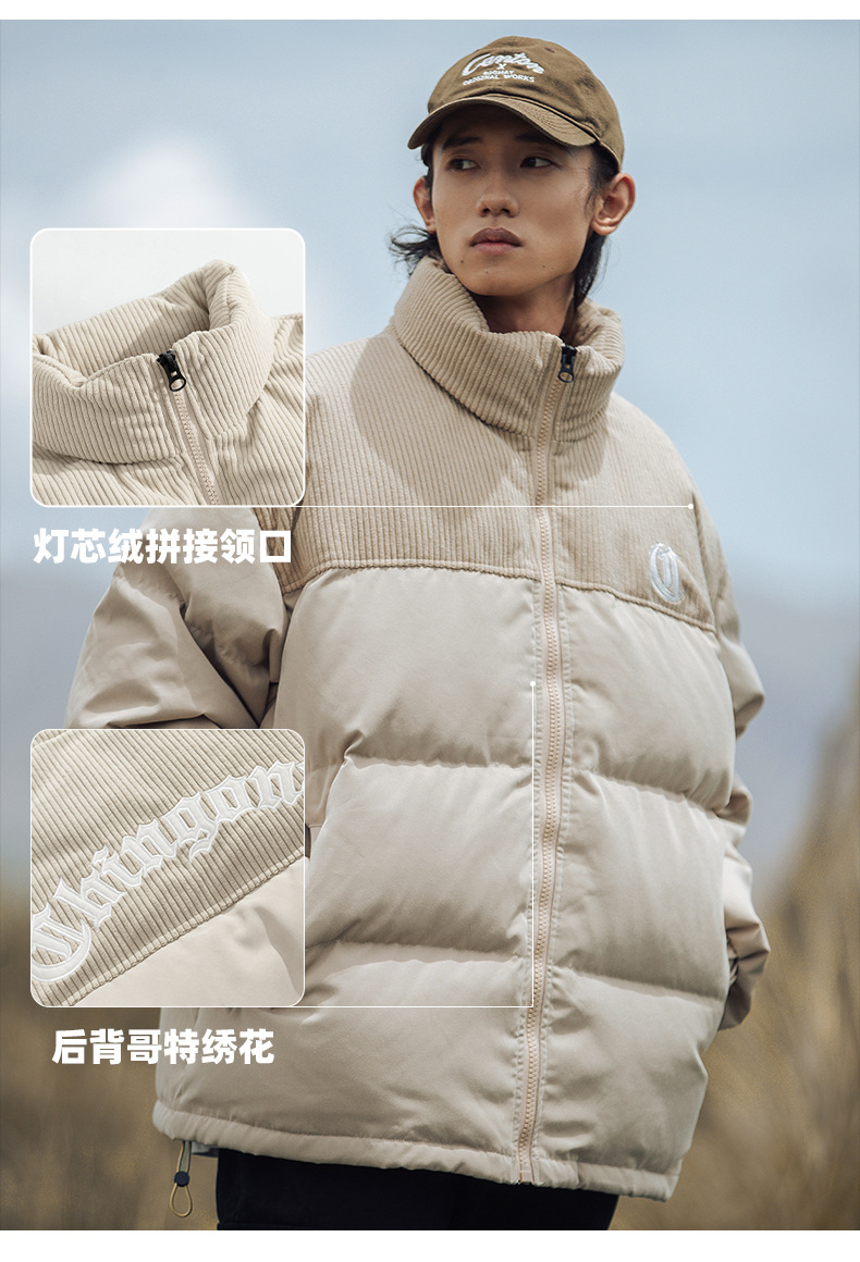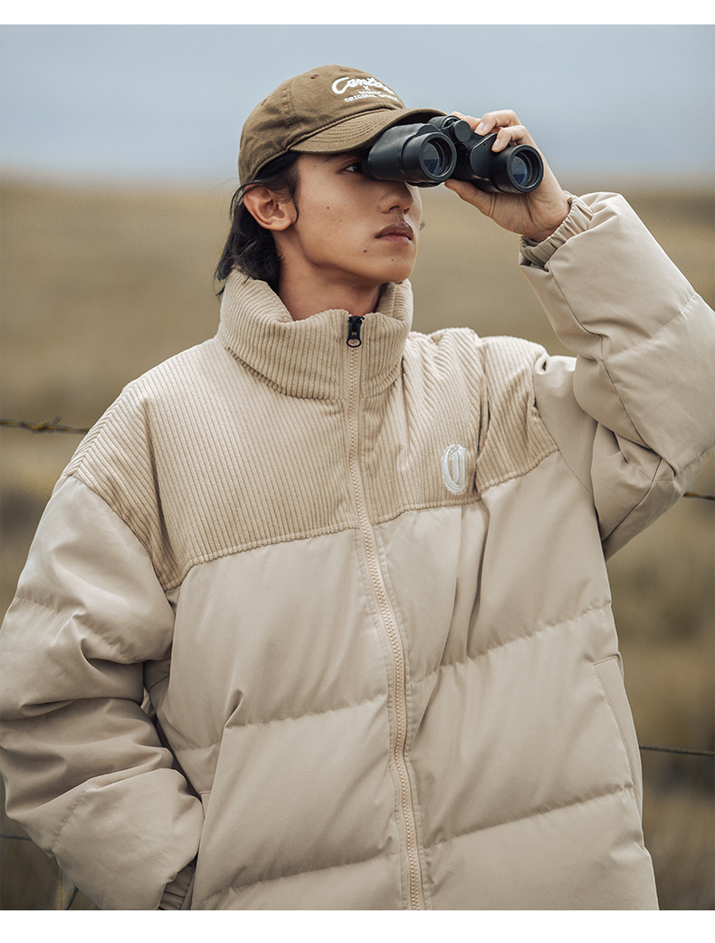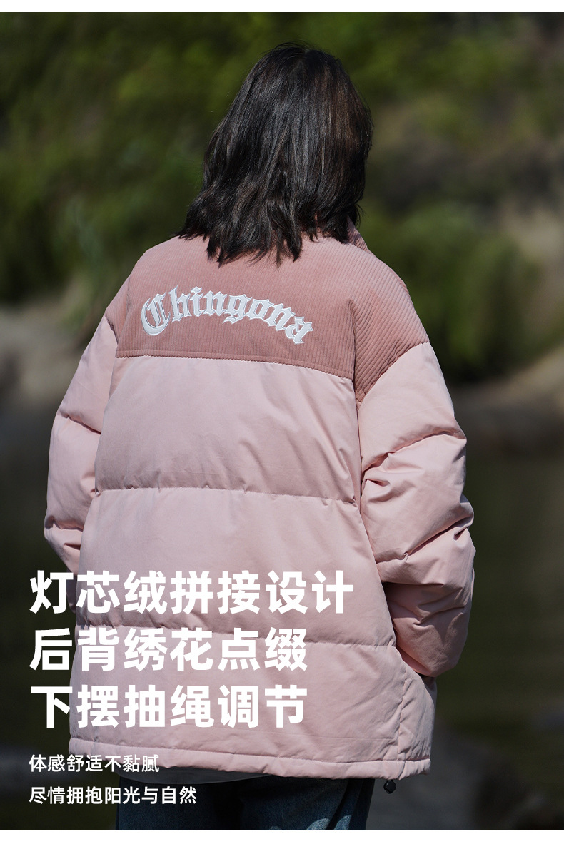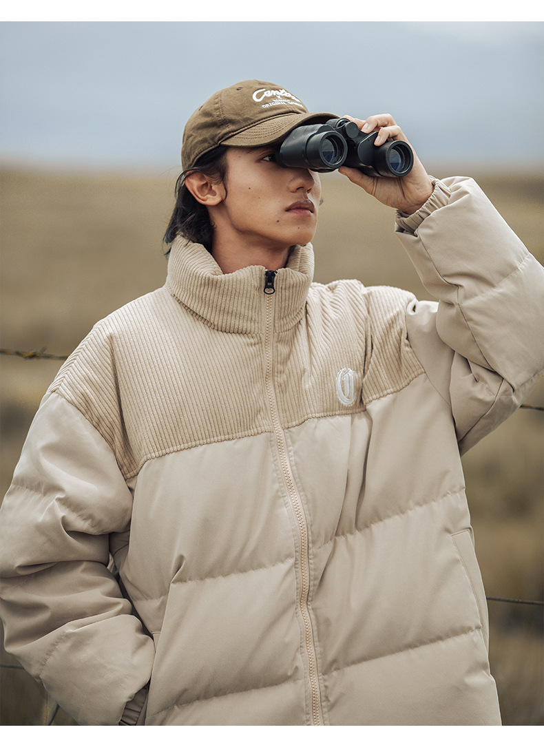 Chaqueta de pana con cuello alto y patchwork de algodón, chaqueta acolchada gruesa de invierno, chaqueta de algodón con bordado de letras de marca de moda para parejas