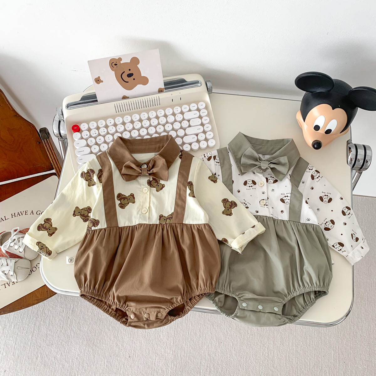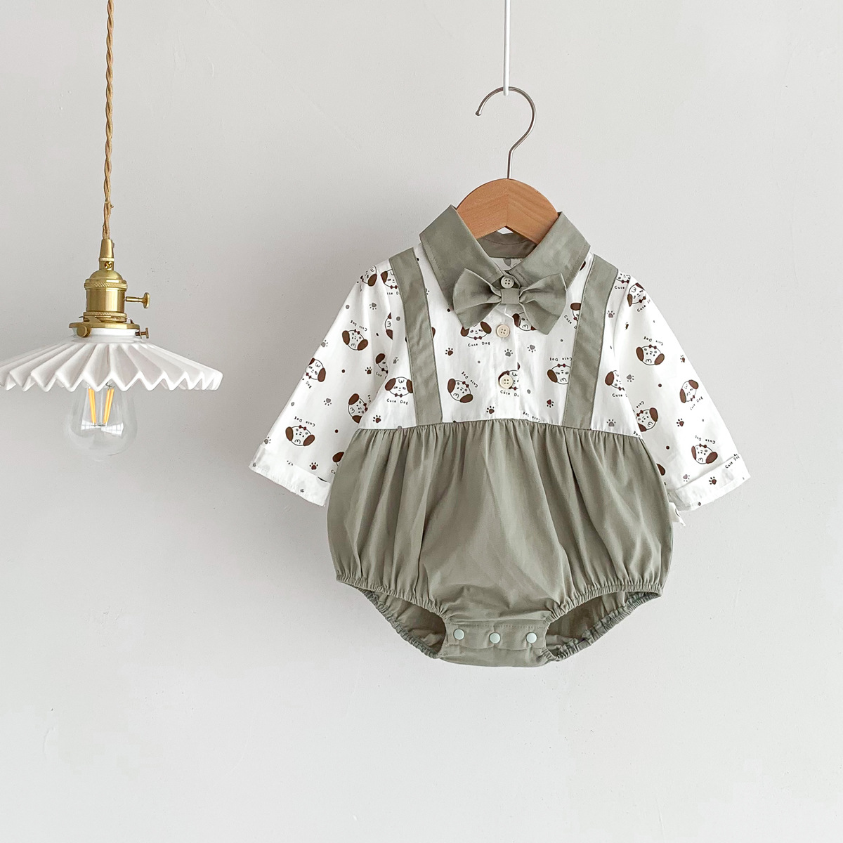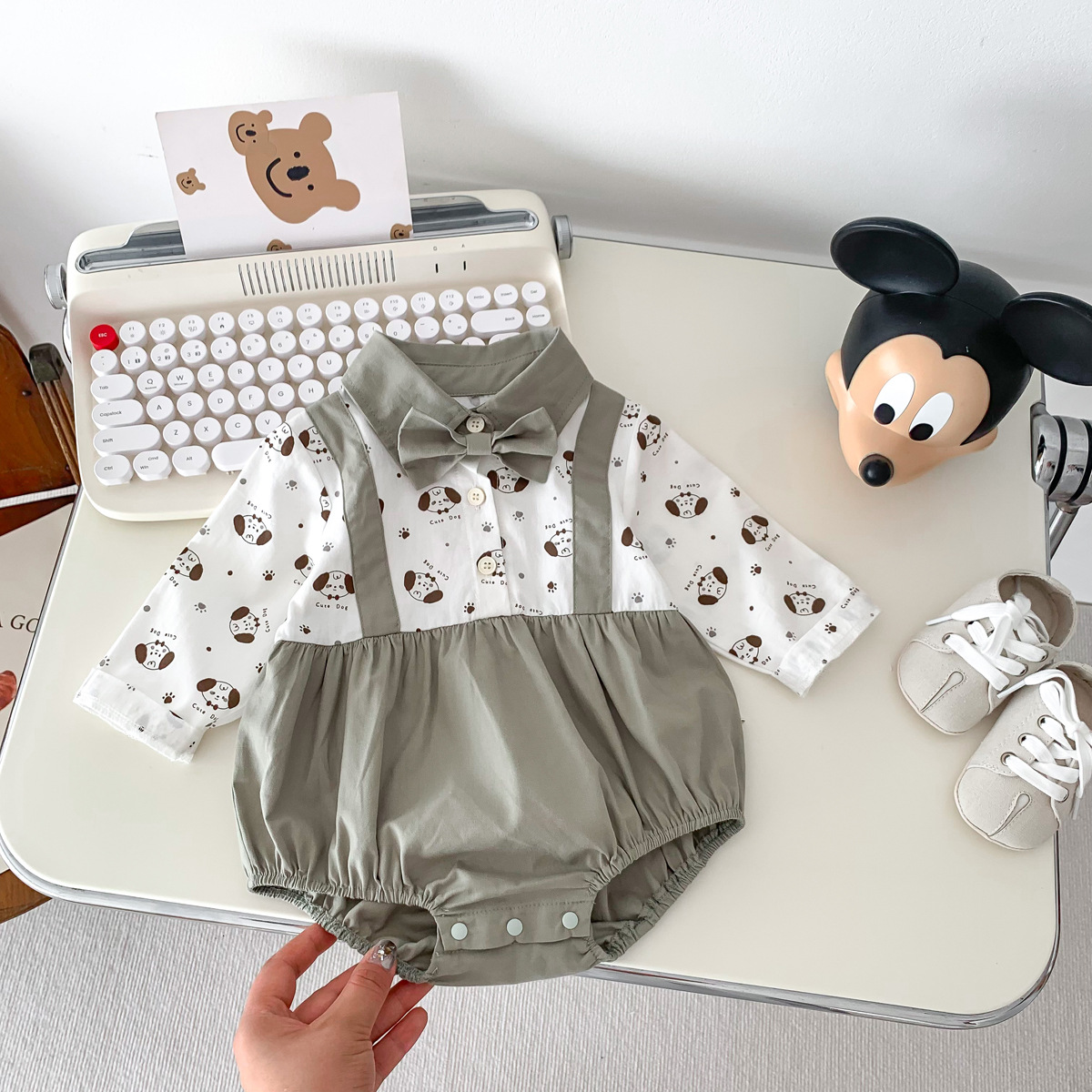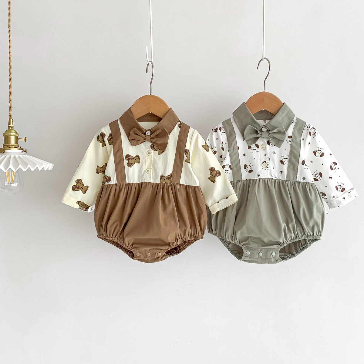 Mono del bebé otoño Niño de dibujos animados impreso ropa bebé recién nacido falso dos piezas Caballero pajarita camisa mameluco