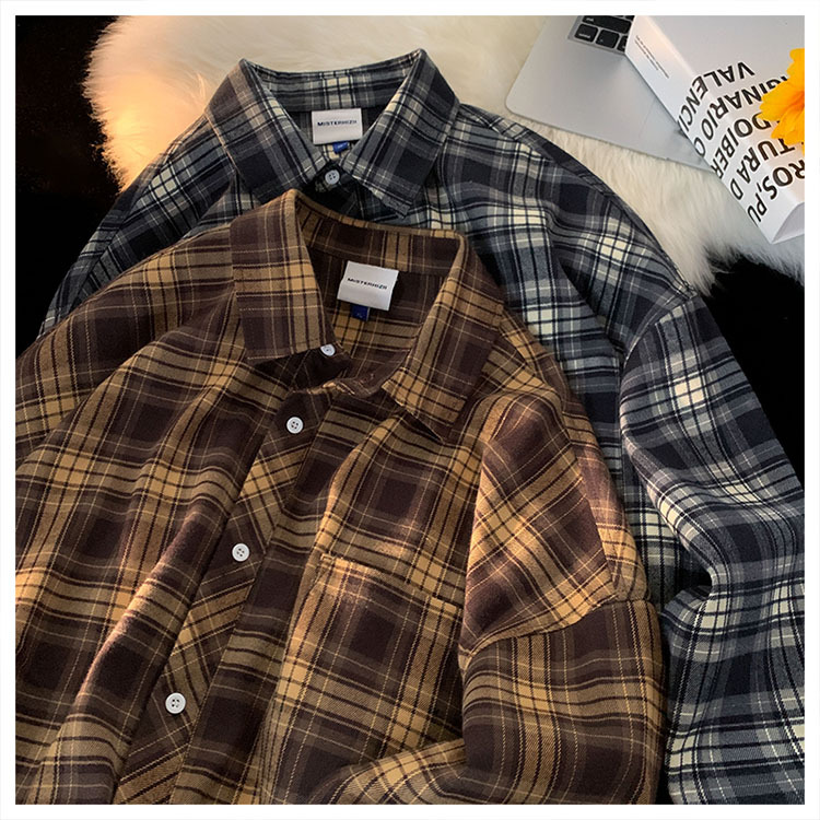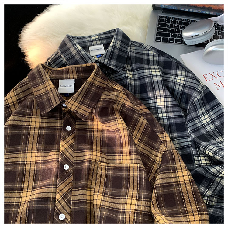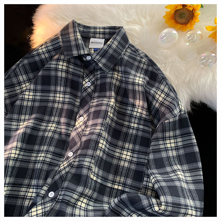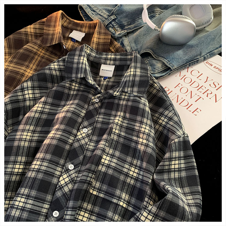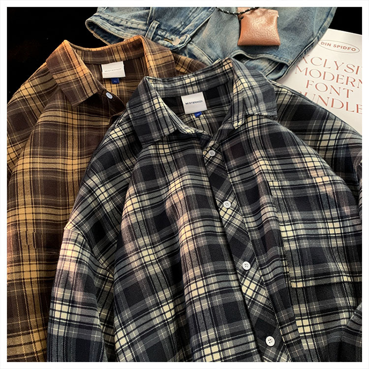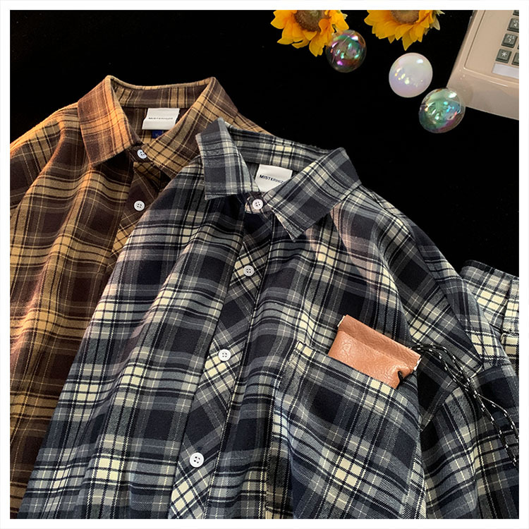 Otoño Hong Kong estilo camisa a cuadros hombres Pu guapo de alta calidad camisa de manga larga de moda marca de moda estilo japonés Capa delgada interior