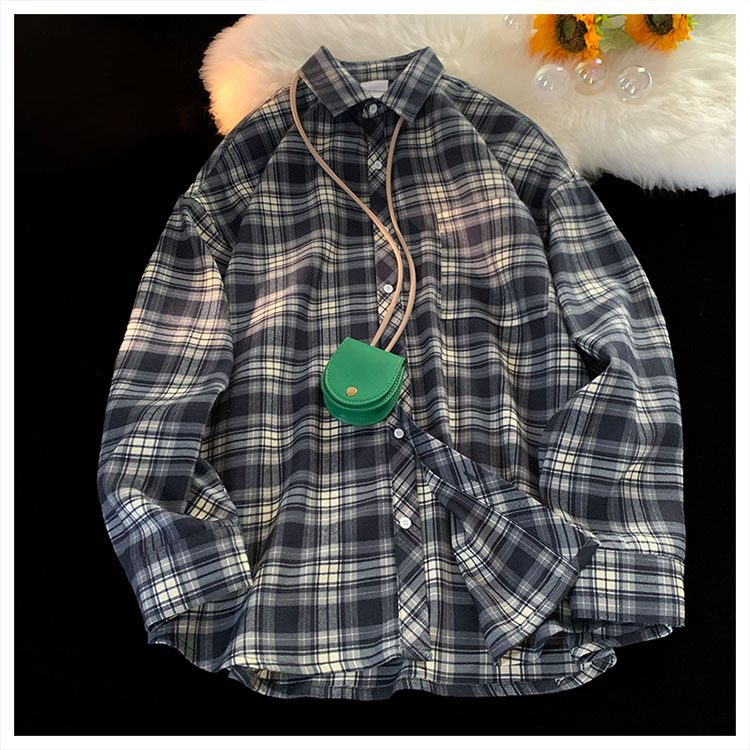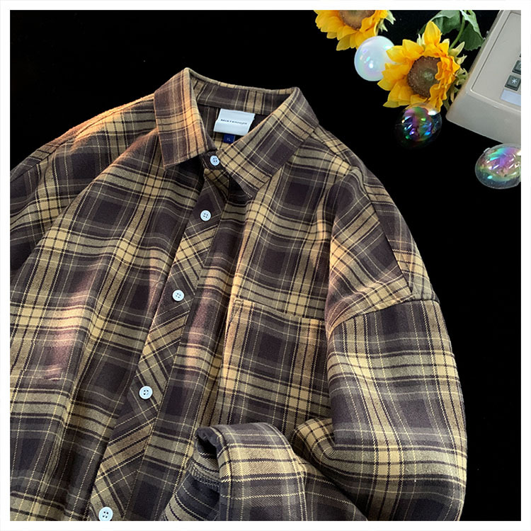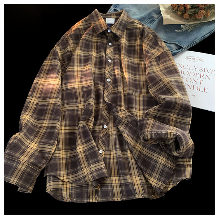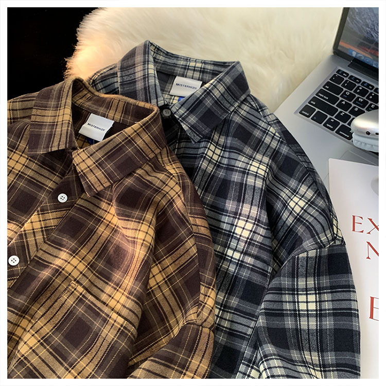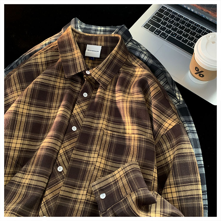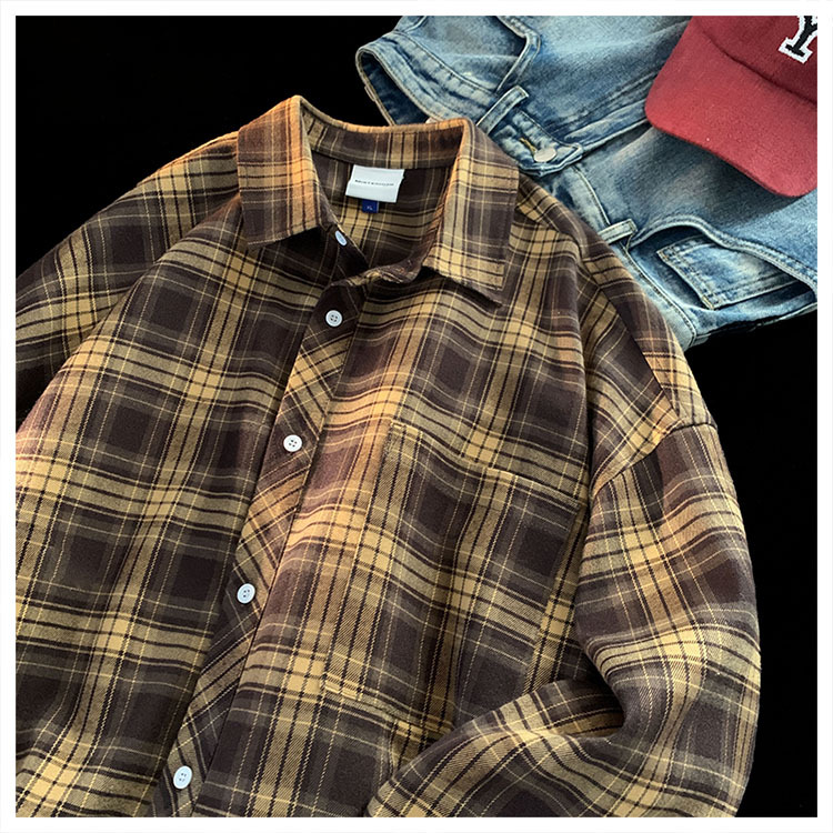 Otoño Hong Kong estilo camisa a cuadros hombres Pu guapo de alta calidad camisa de manga larga de moda marca de moda estilo japonés Capa delgada interior