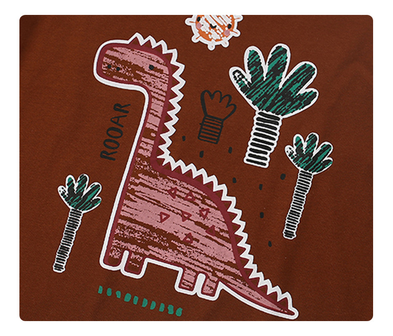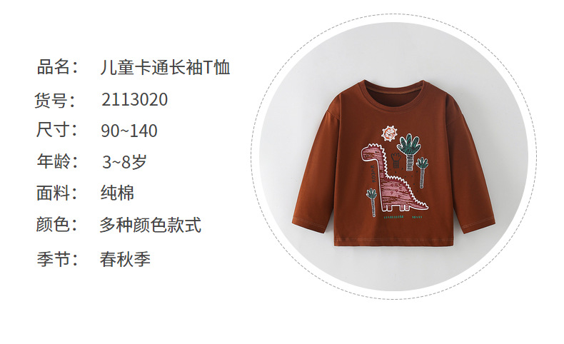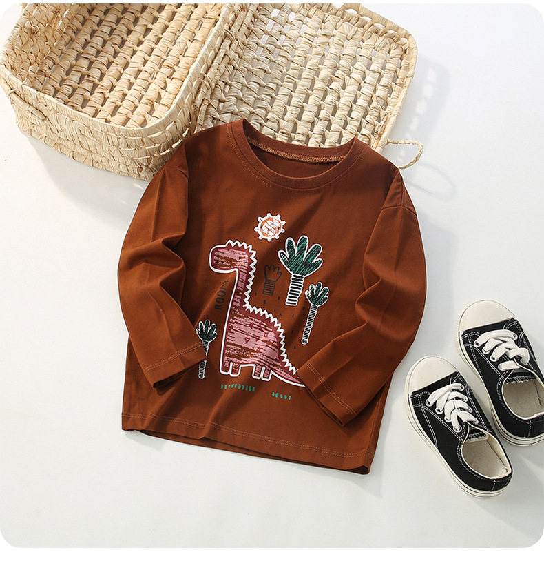 Camiseta para niños de manga larga nueva 2023 tops de ropa para niños europeos y americanos con estampado de dibujos animados de dinosaurios y camisa de fondo de algodón puro