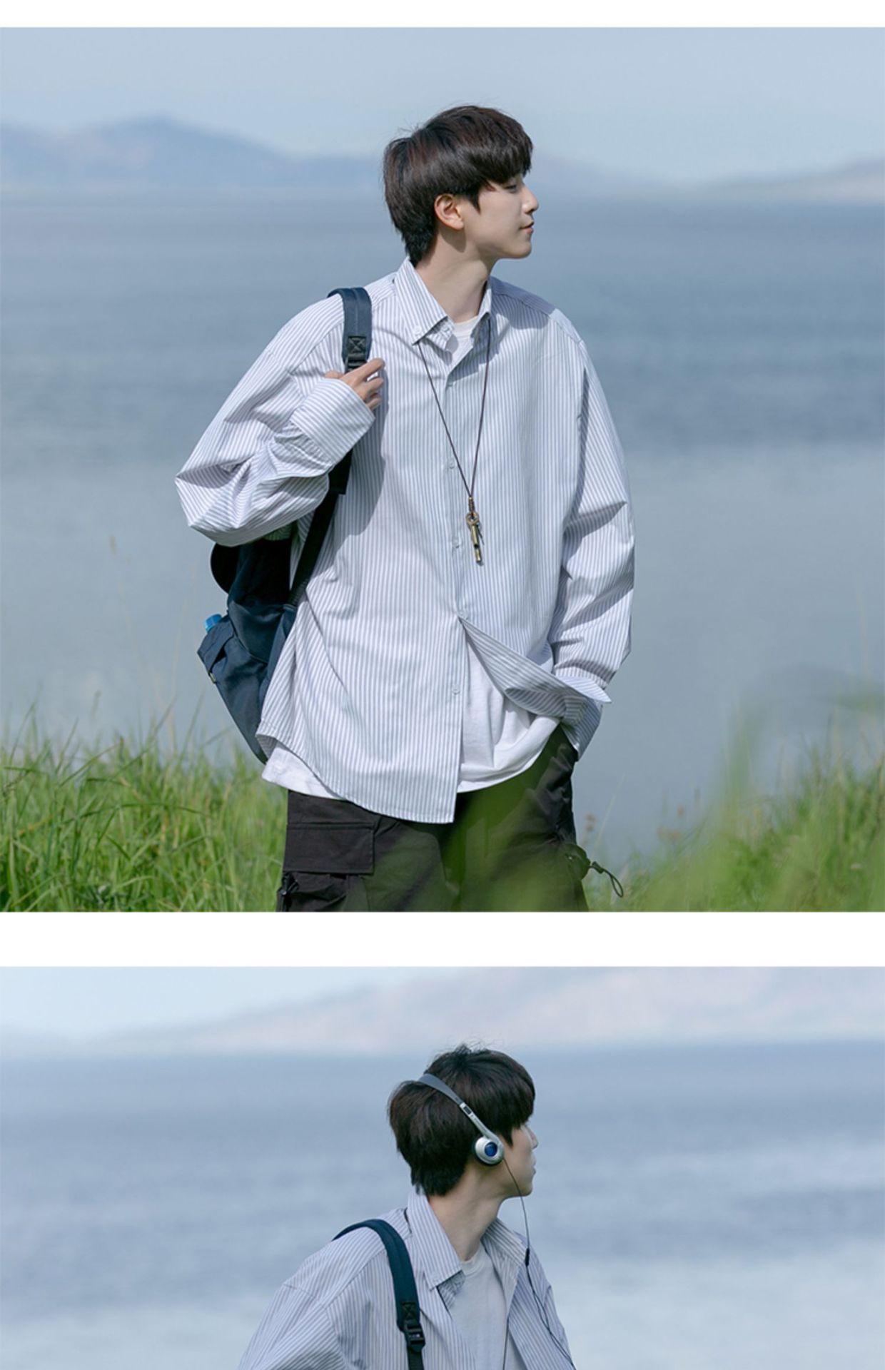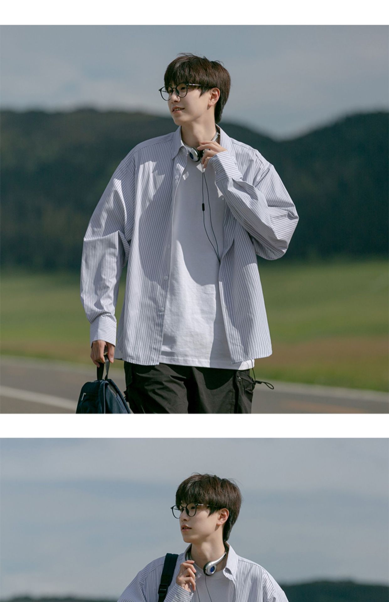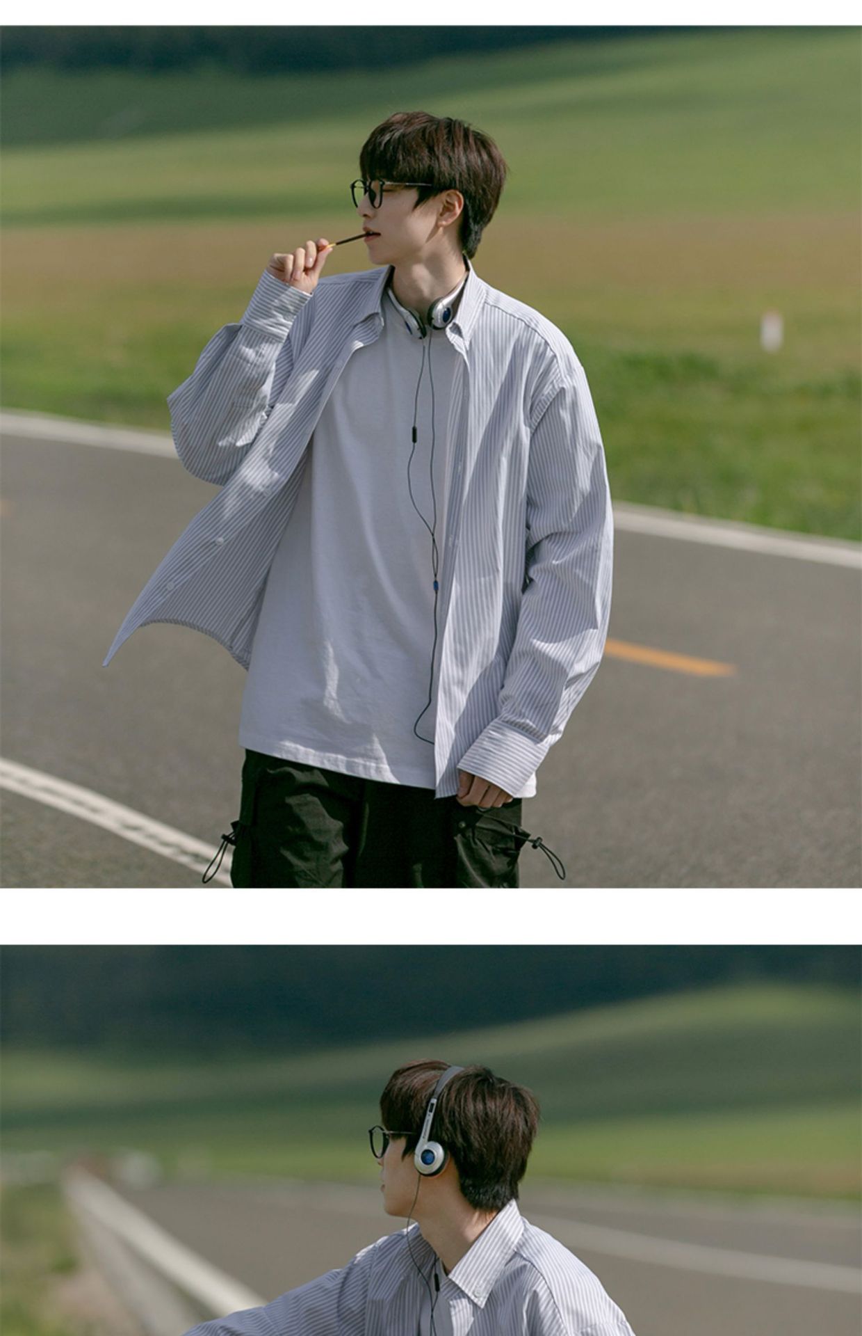 Camisa de manga larga a rayas japonesa para hombre primavera y otoño Camisa de manga corta estilo Hong Kong suelta chaqueta casual de alta calidad de moda