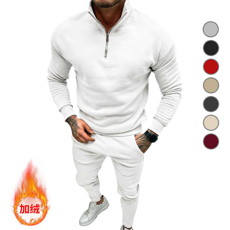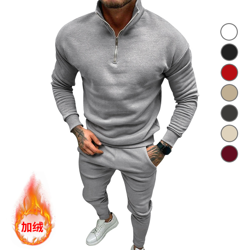 2023 Comercio exterior transfronterizo Otoño e Invierno casual de los hombres forrado de lana de color sólido de manga larga media cremallera pantalones de dos piezas traje de moda