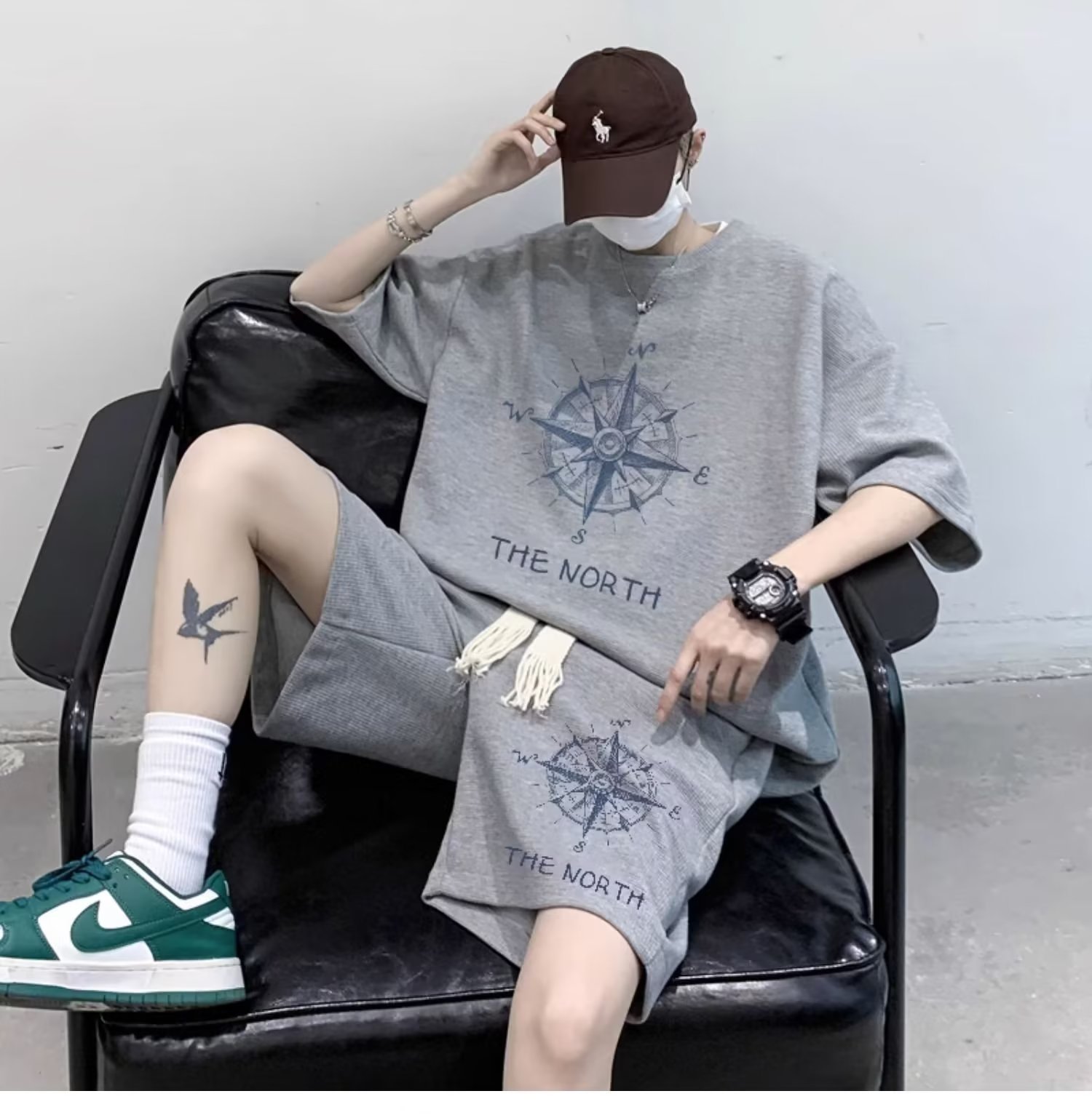 Verano waffle deportes traje casual hombres sueltos más tamaño de manga corta Camiseta pantalones cortos conjunto guapo moda a juego