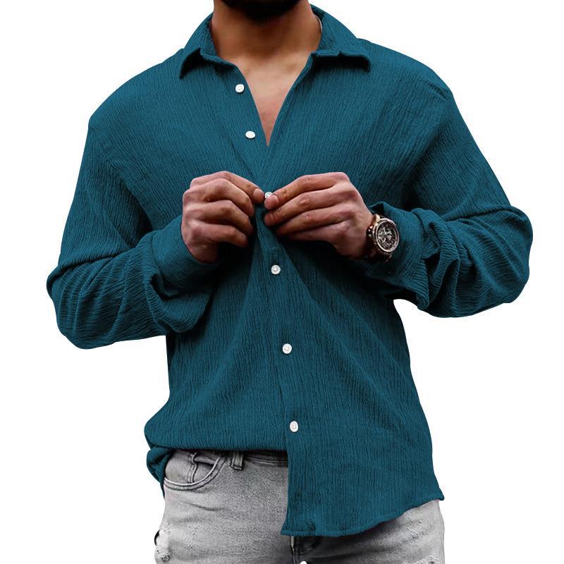 2023 Amazon camisa de manga larga de los hombres de primavera y otoño suelta más tamaño de la burbuja de tela de color sólido solapa camisa casual hombres