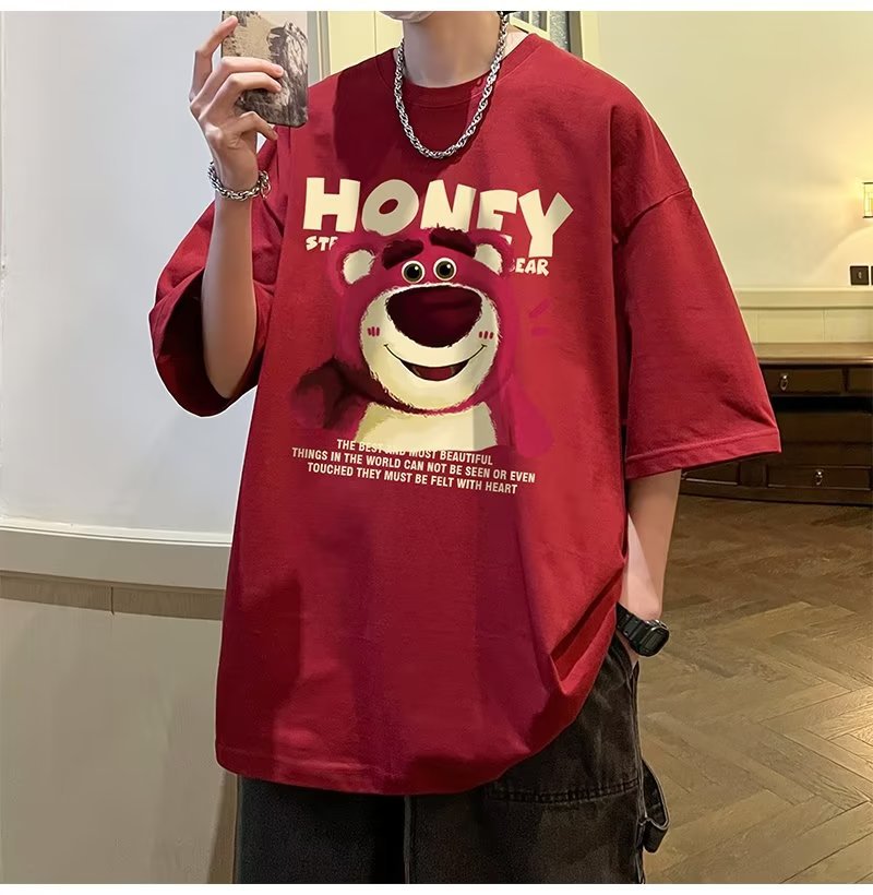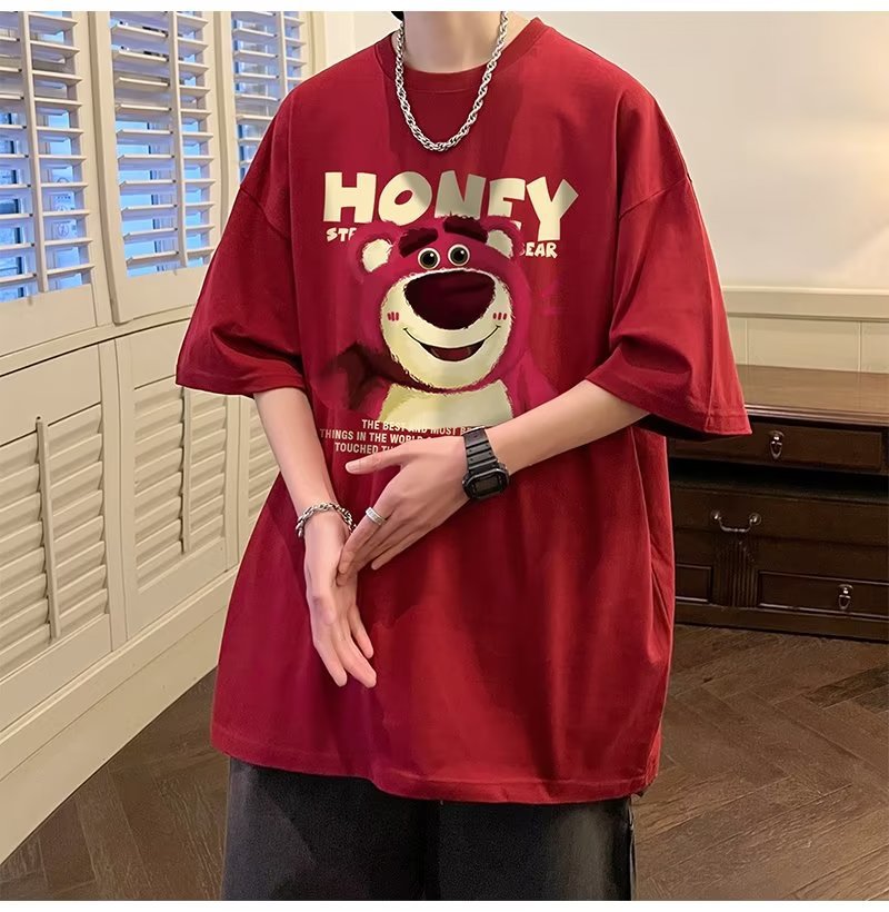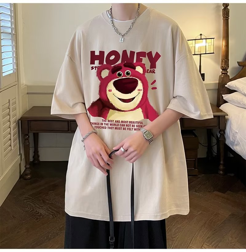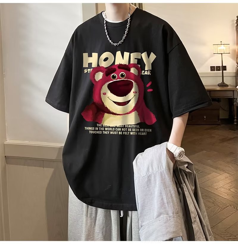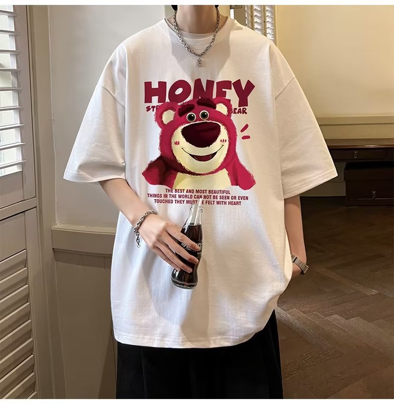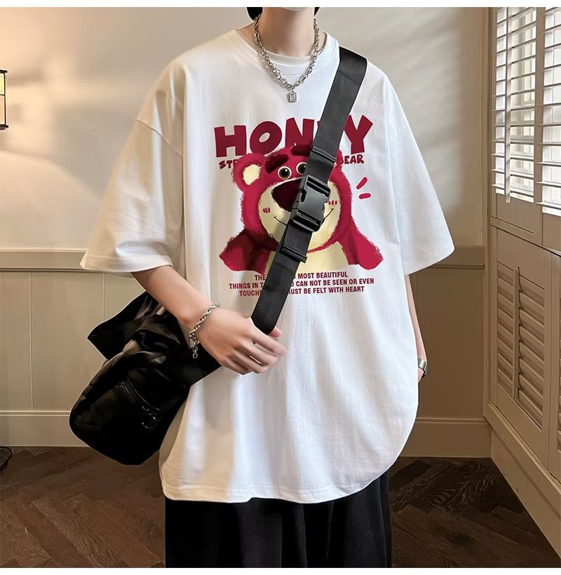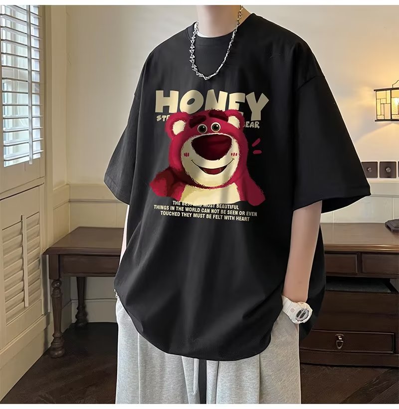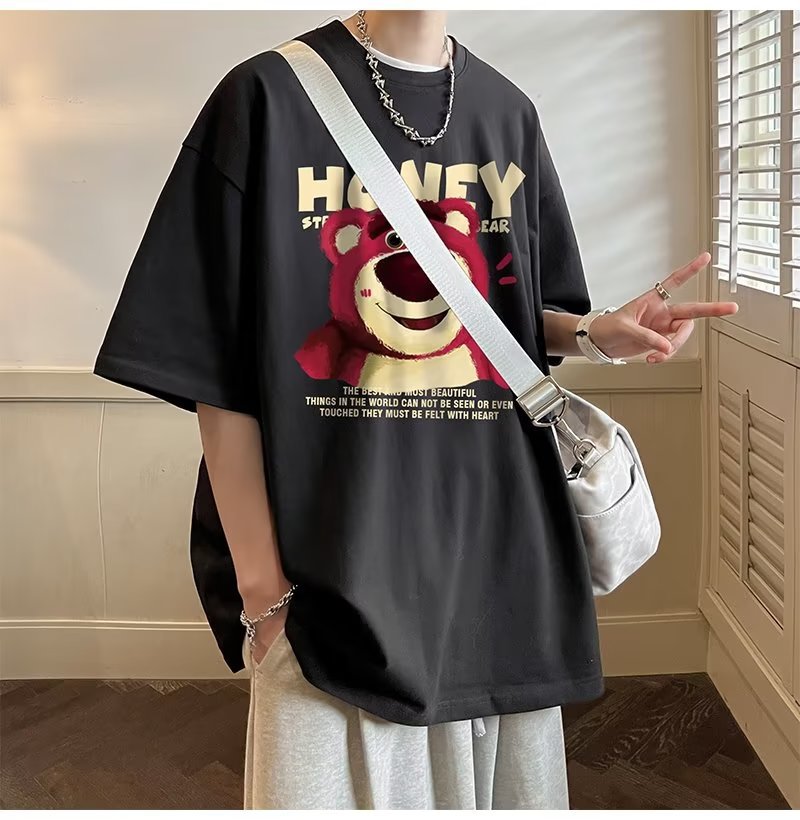 Hong Kong estilo Nueva camiseta de manga corta marca de moda de verano de los hombres fresa oso media manga camiseta americana retro suelta camiseta de los hombres de moda