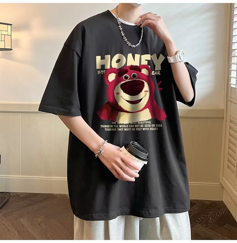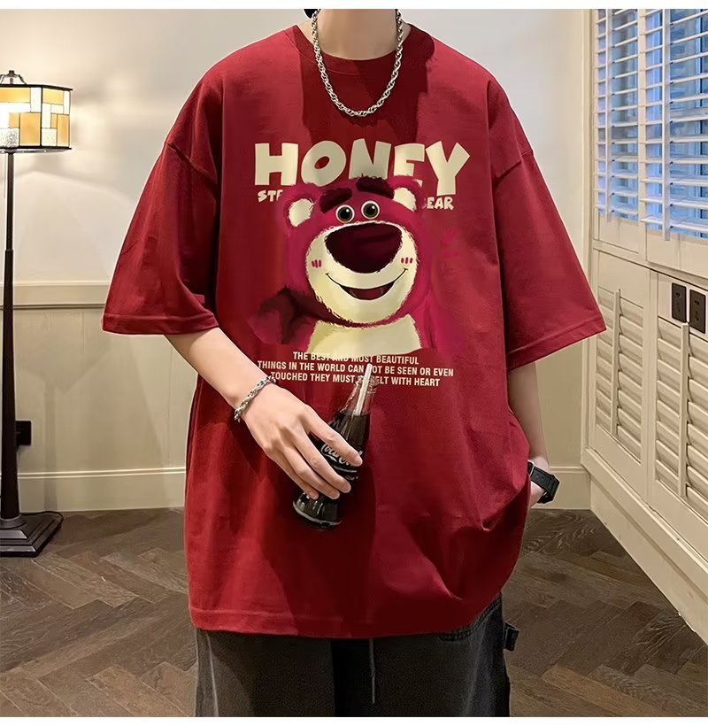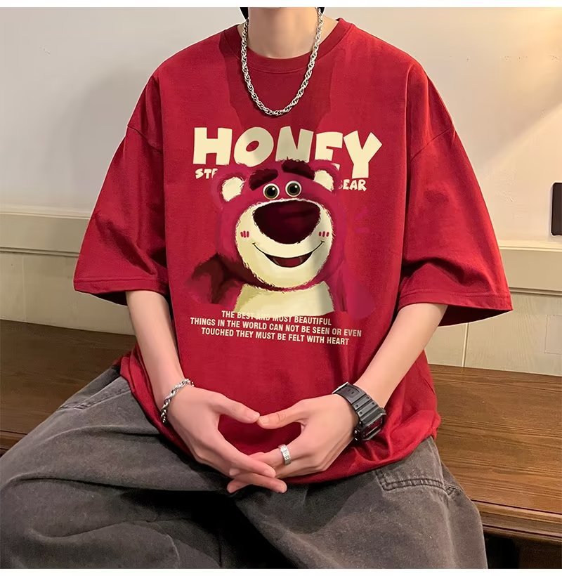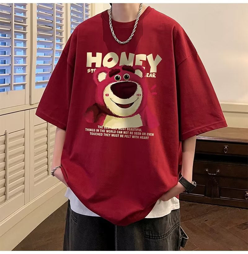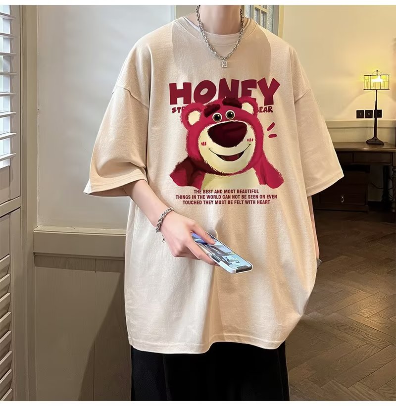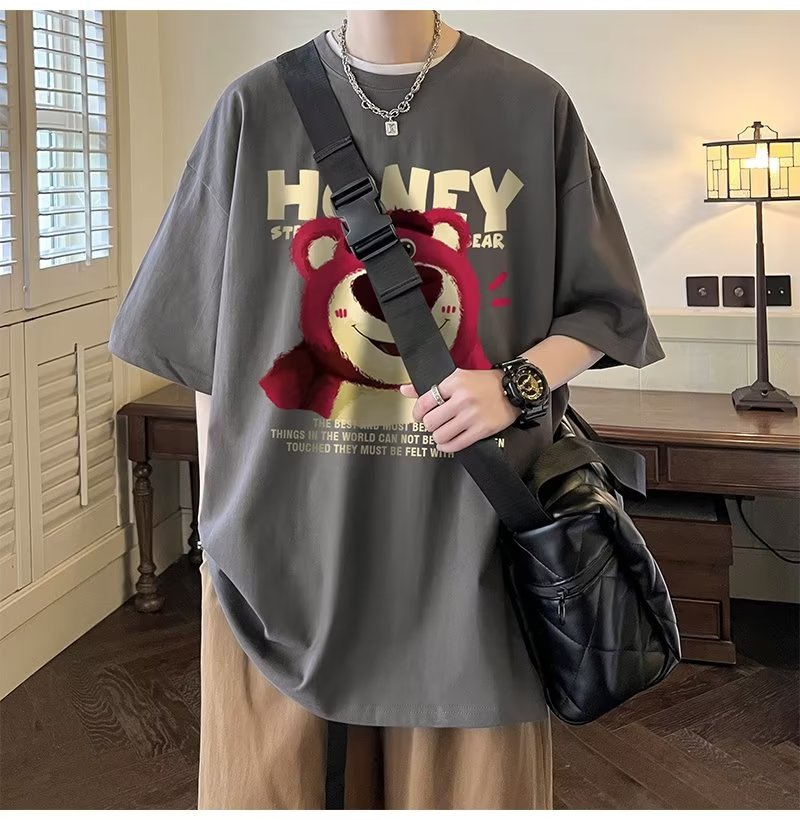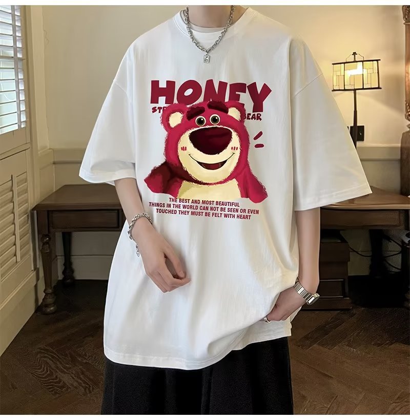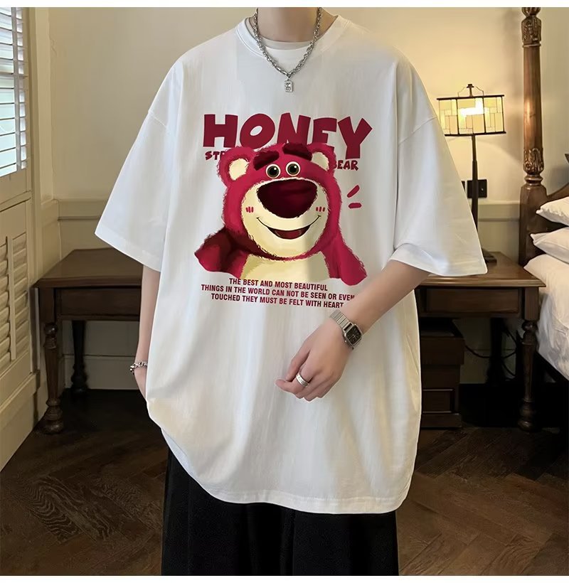 Hong Kong estilo Nueva camiseta de manga corta marca de moda de verano de los hombres fresa oso media manga camiseta americana retro suelta camiseta de los hombres de moda