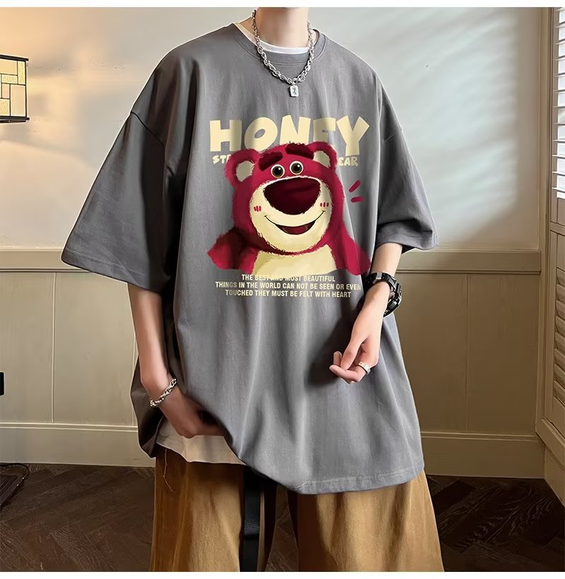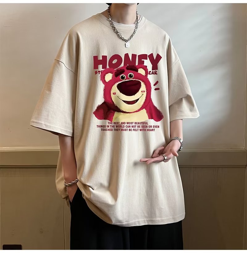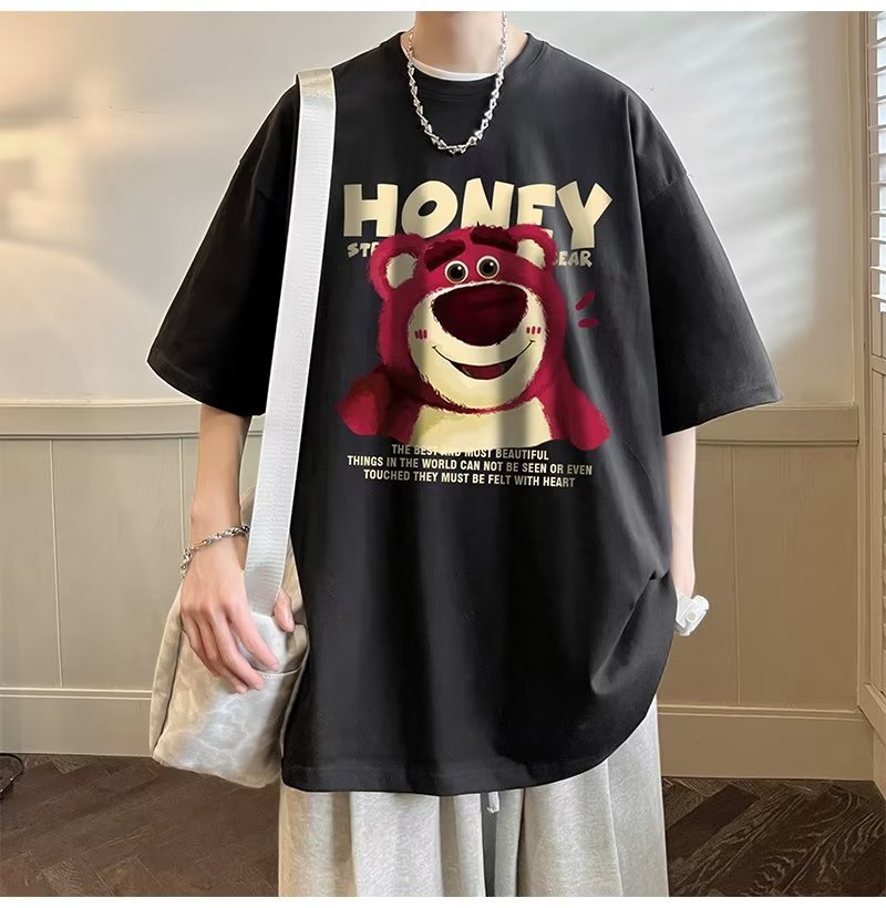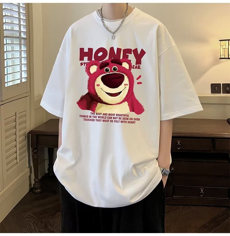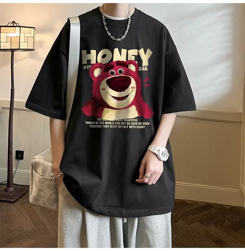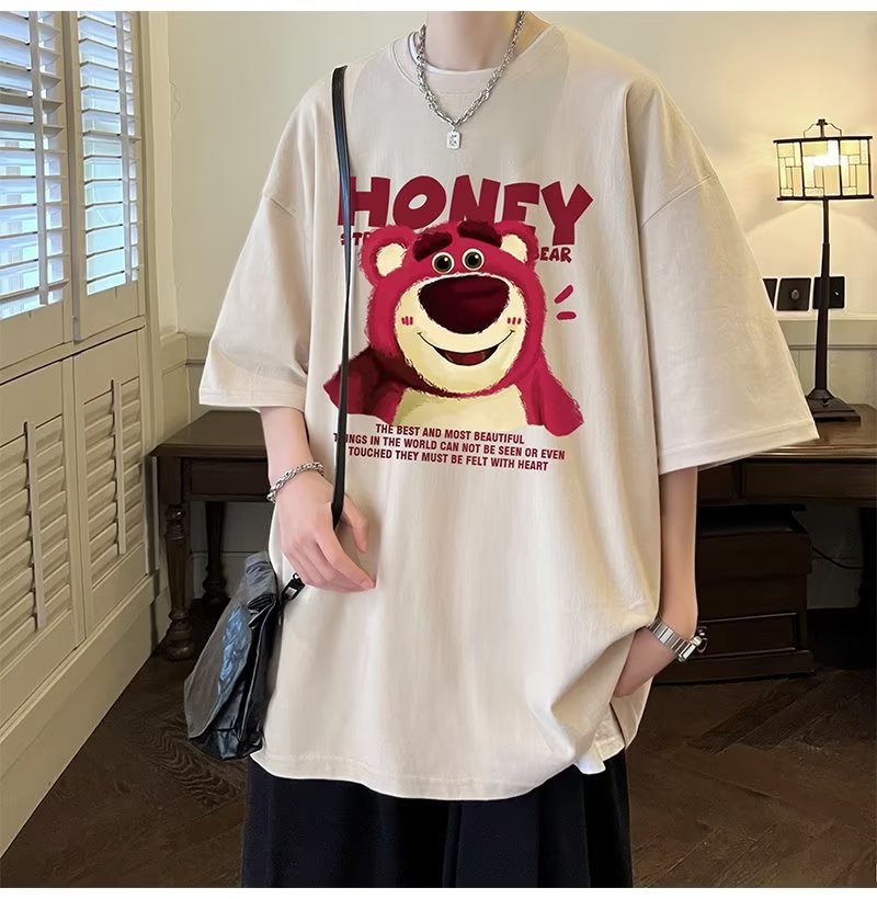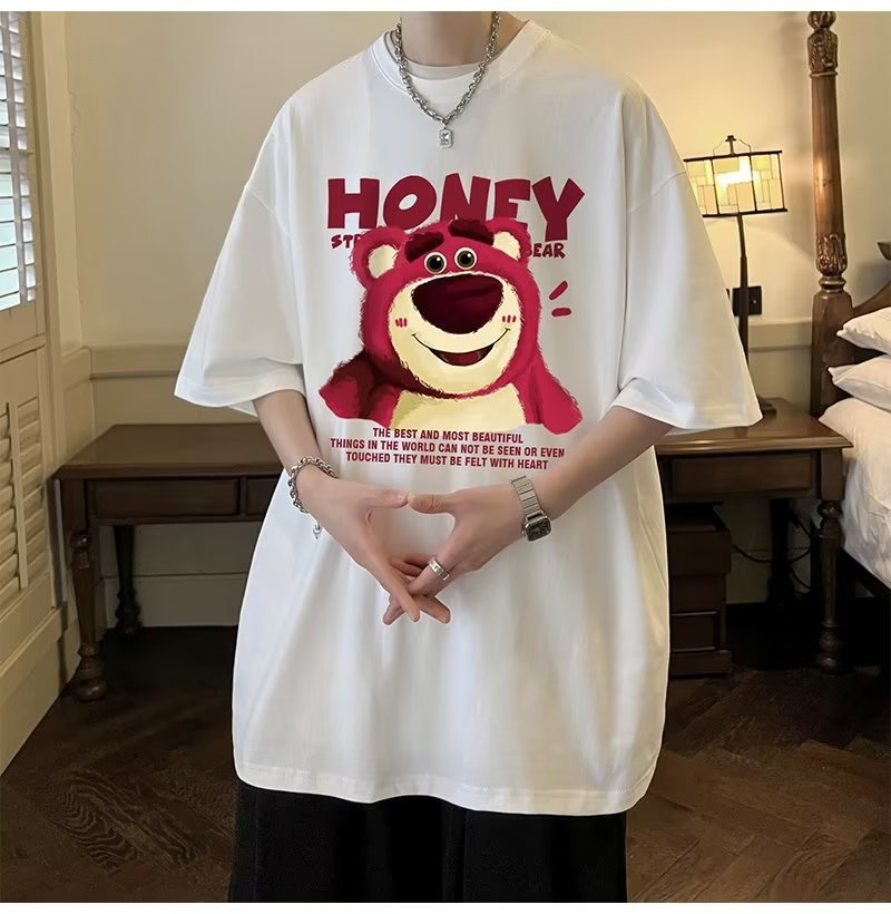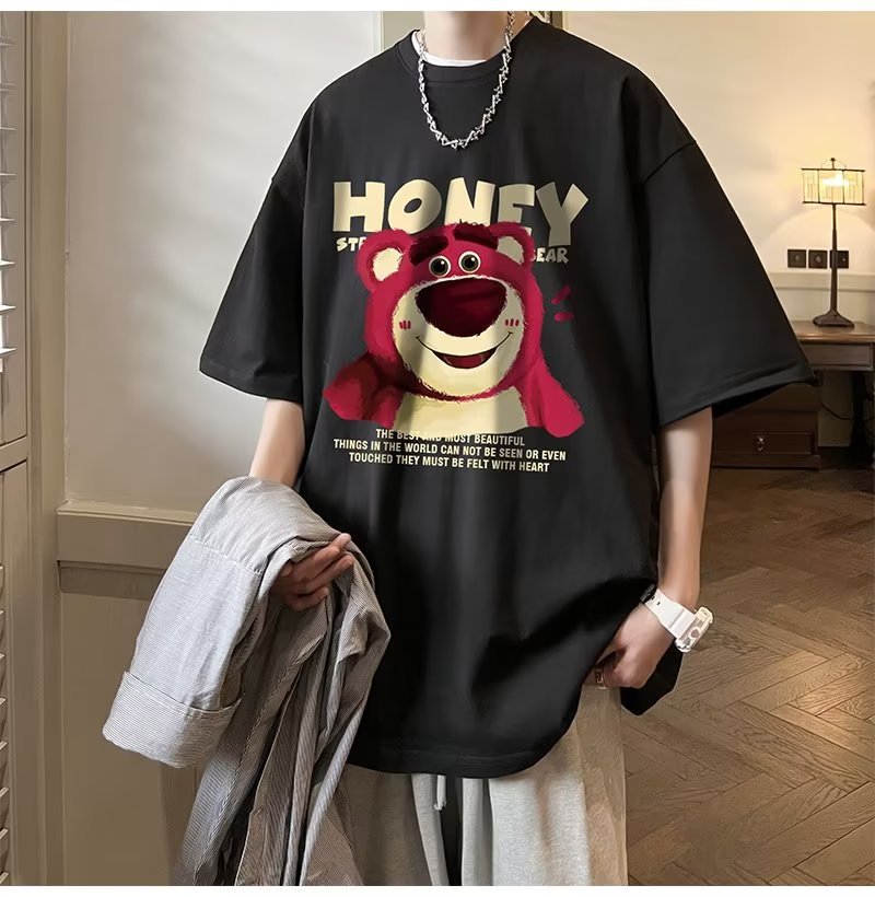 Hong Kong estilo Nueva camiseta de manga corta marca de moda de verano de los hombres fresa oso media manga camiseta americana retro suelta camiseta de los hombres de moda