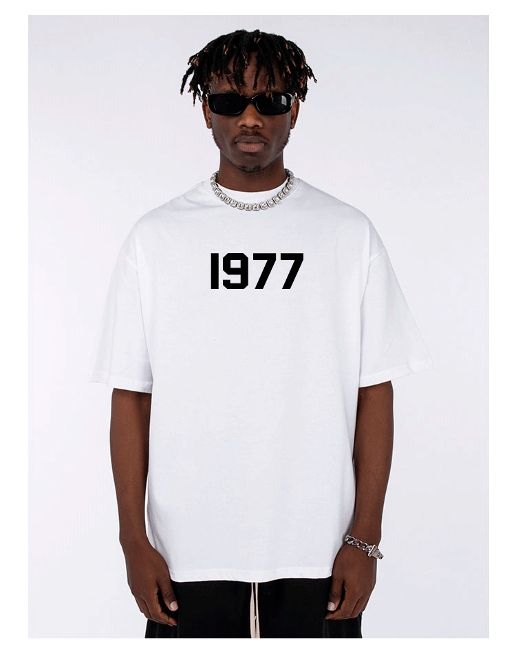 Heavy 350g de hilo doble manga corta para hombres y mujeres escote pequeño 1977 Camiseta de algodón suelta media manga blanca caída hombro media manga