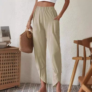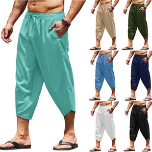 2024 Amazon estación independiente nuevos hombres de algodón y lino color sólido cordón suelto pantalones cortos Casuales