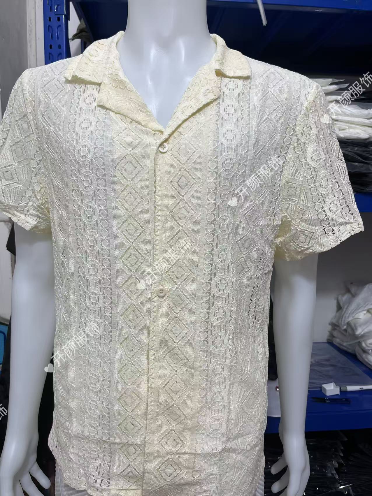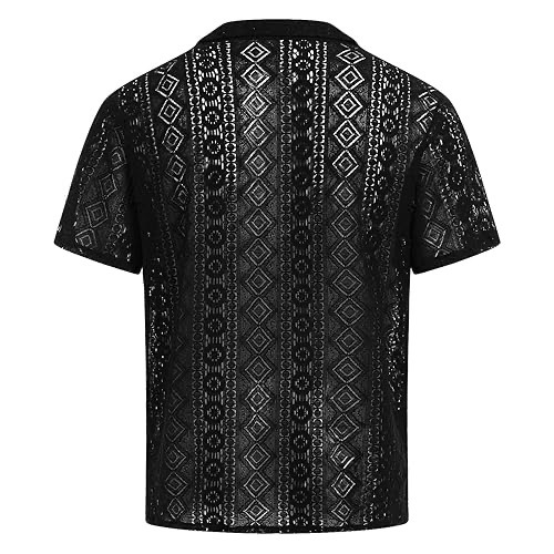 Spot moda europea y americana nueva camisa de manga corta de encaje para hombres botón transparente vacaciones casual top hueco