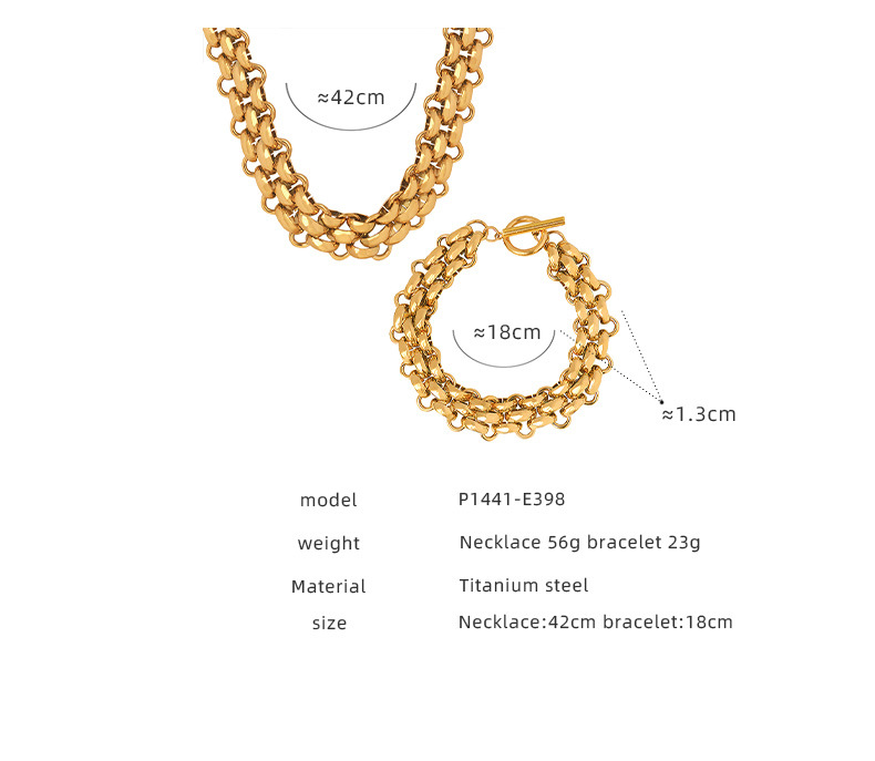 | Color | E398-steel bracelet-18cm,E398-gold bracelet-18cm,P1441-Steel Necklace-42cm,P1441-gold necklace-42cm |