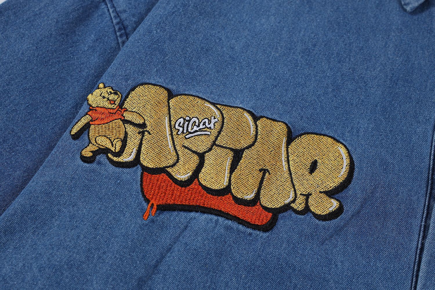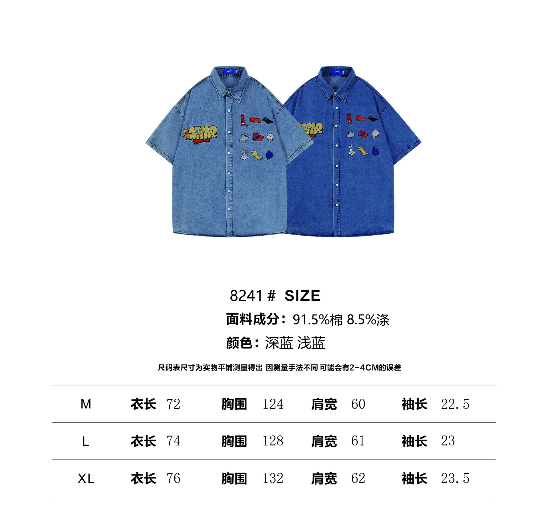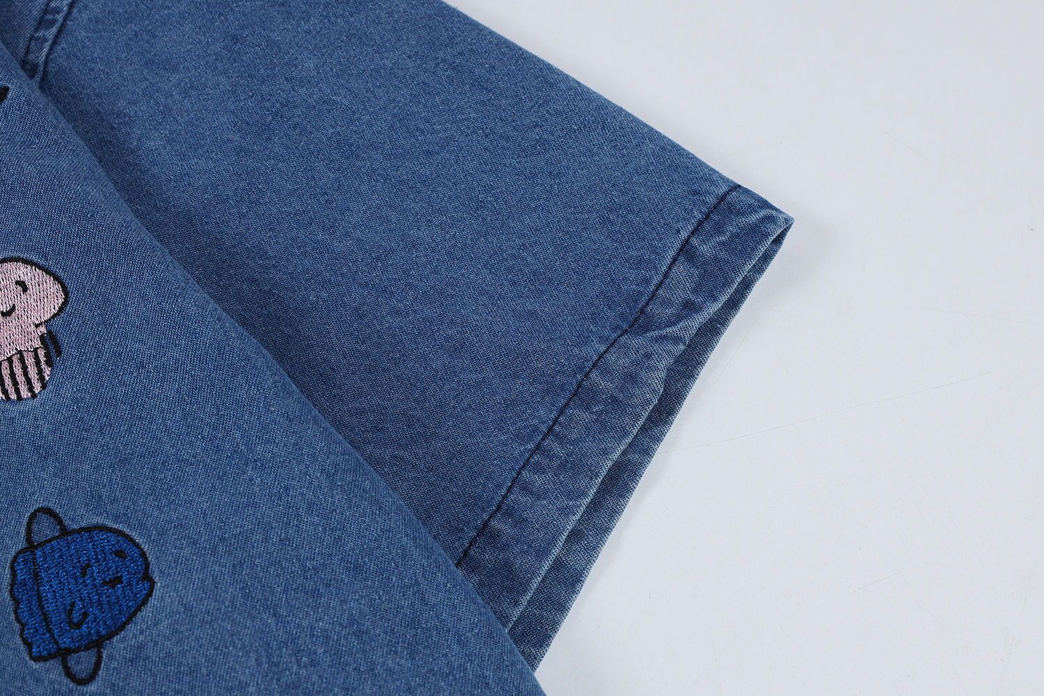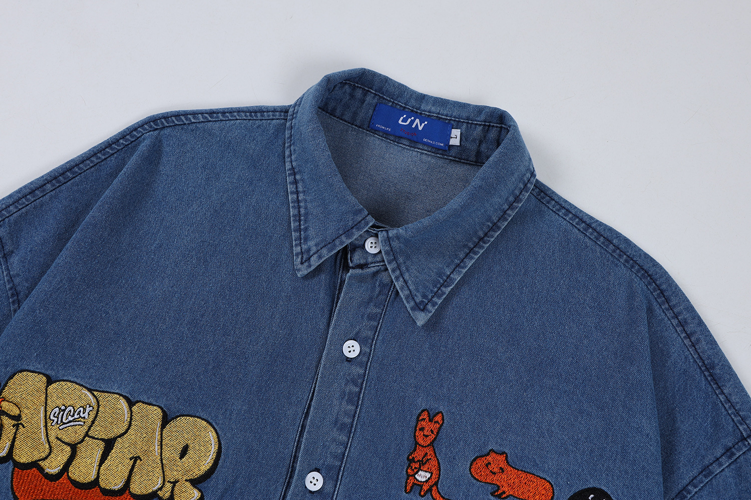 Camisa de manga corta de mezclilla de hombres y mujeres de verano estilo neutro diseño suelto bordado vintage marca de moda casual top