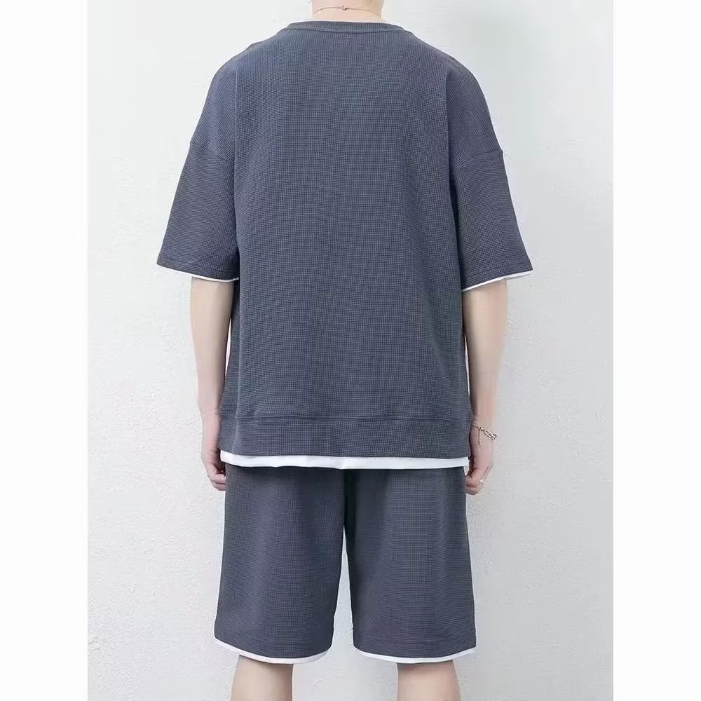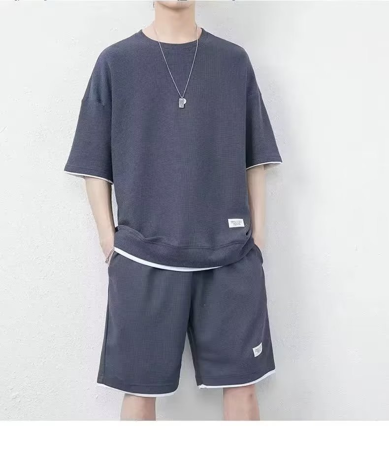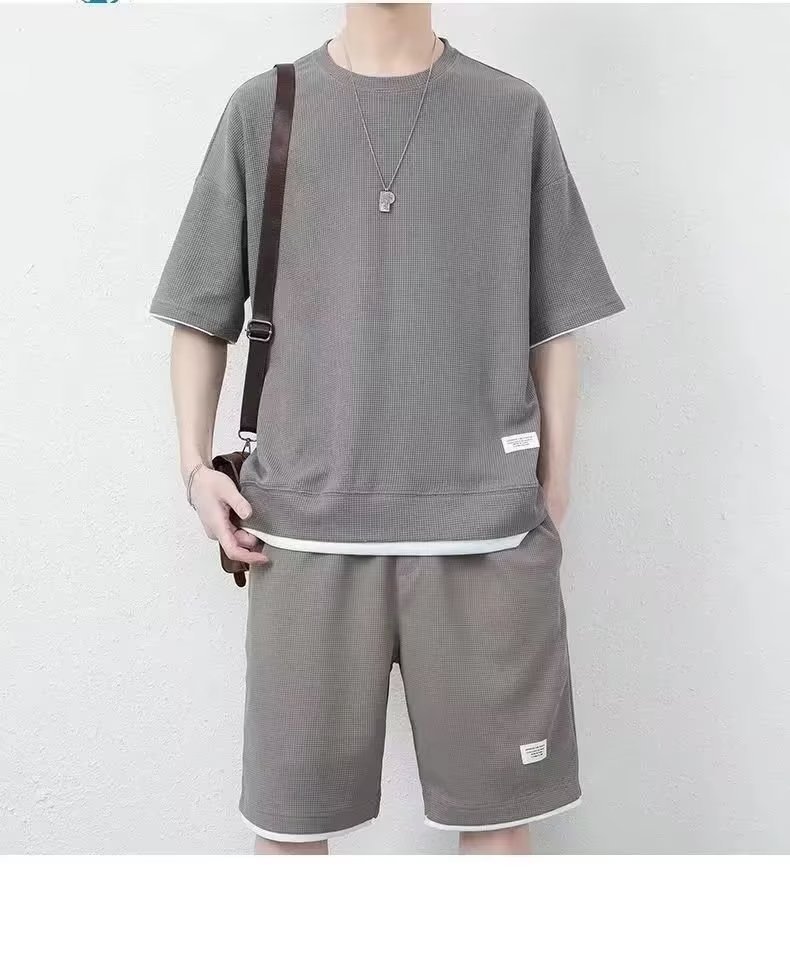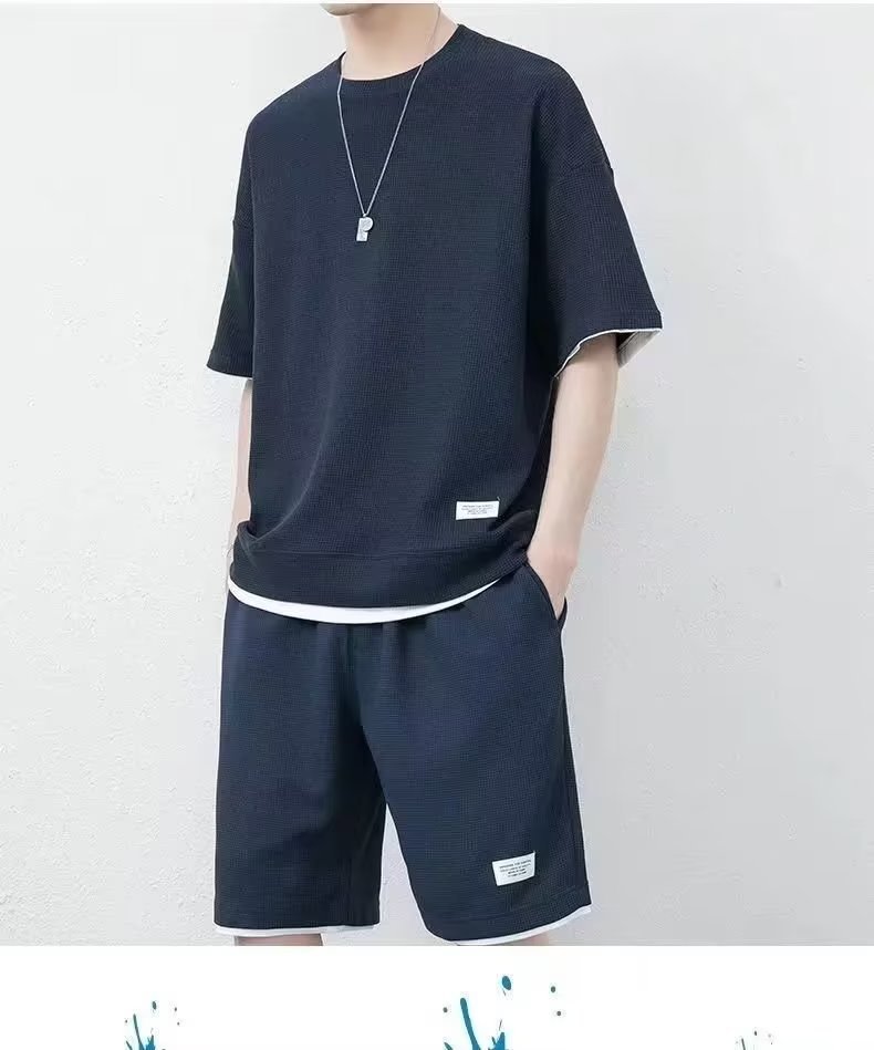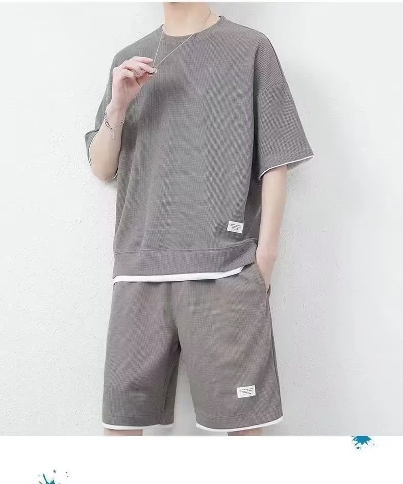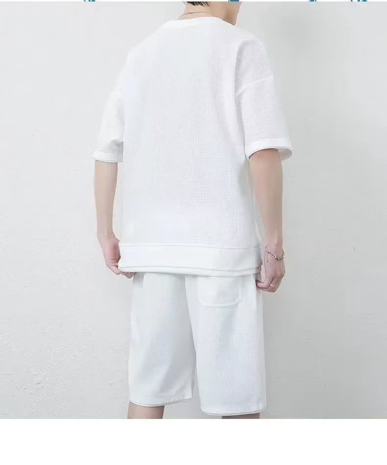 Pantalones cortos waffle traje de verano de los hombres Camiseta de manga corta delgada con pantalones cortos deportivos un conjunto de moda a juego guapo