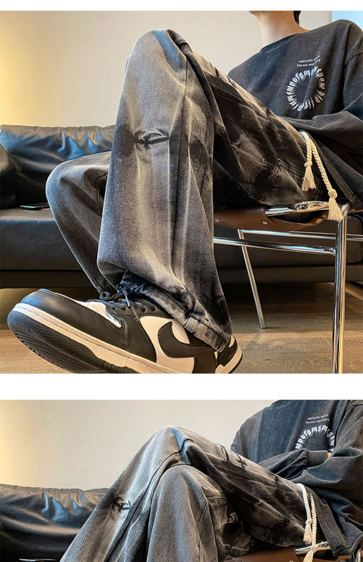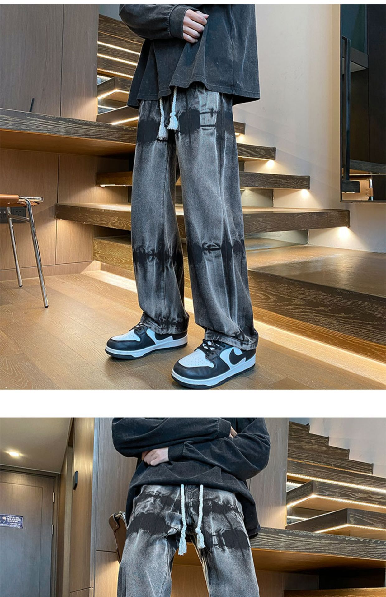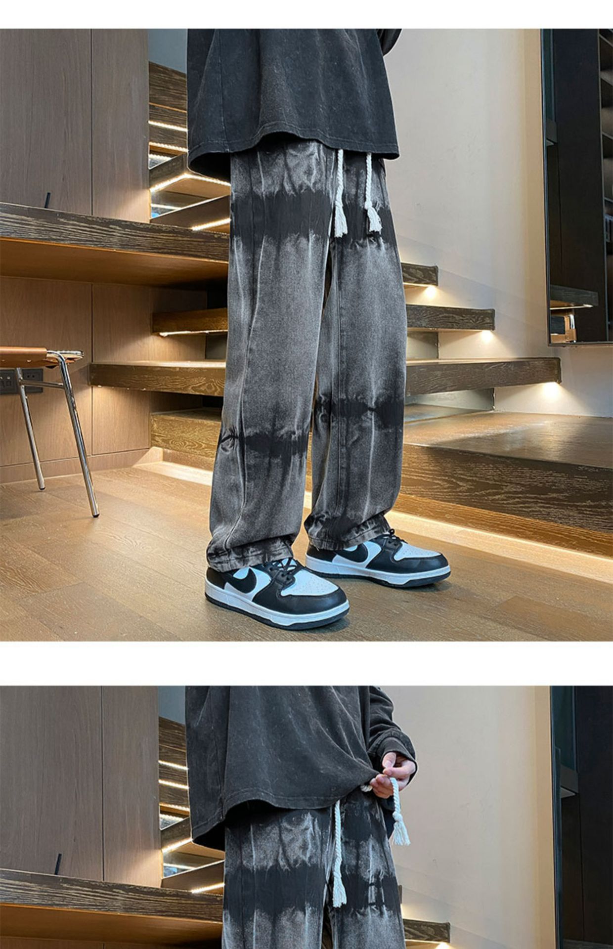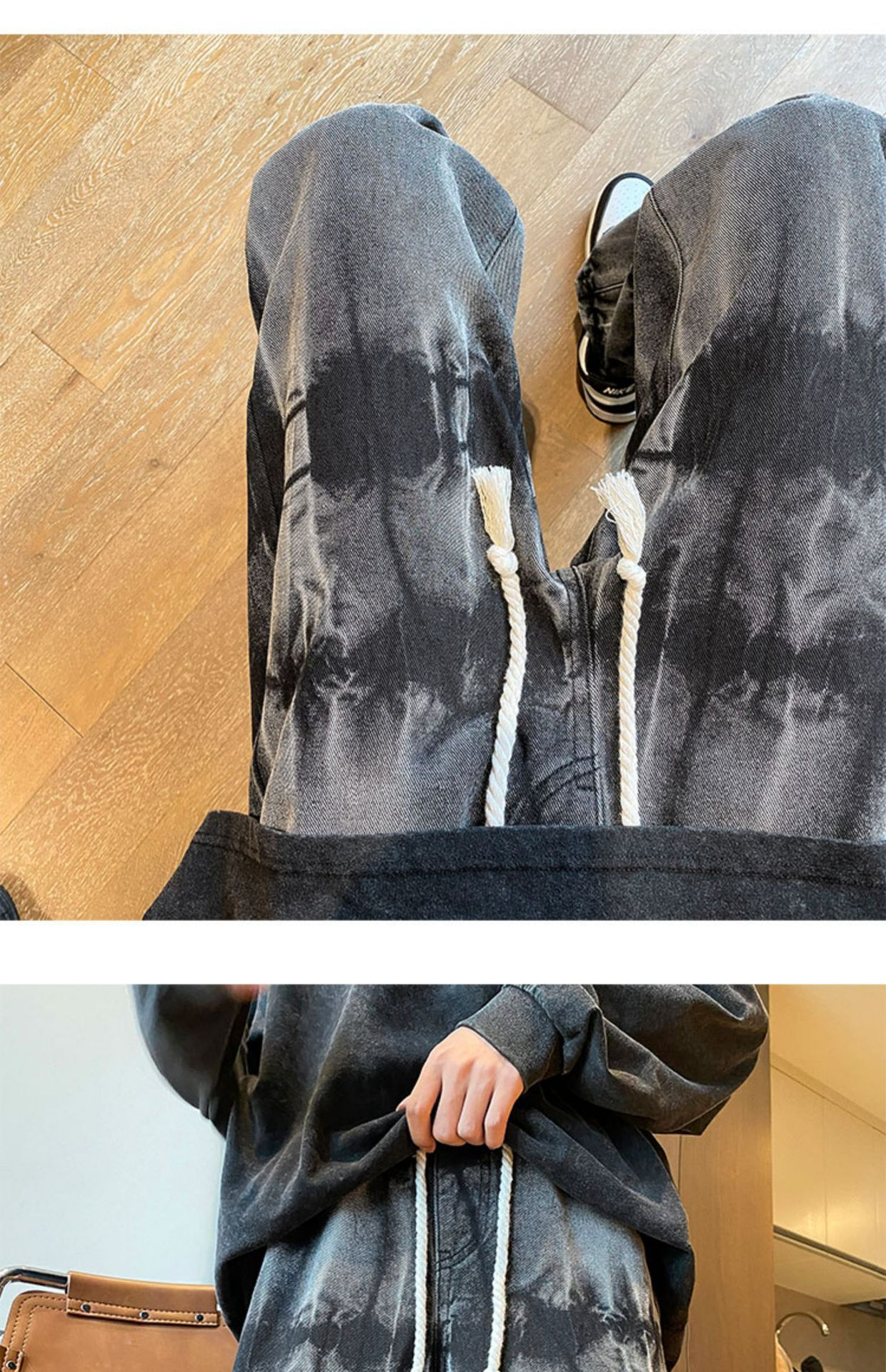 Pantalones europeos y americanos High Street Vibe ins marca de moda tie-dyed vintage drawstring jeans hombres American hiphop Pantalones rectos