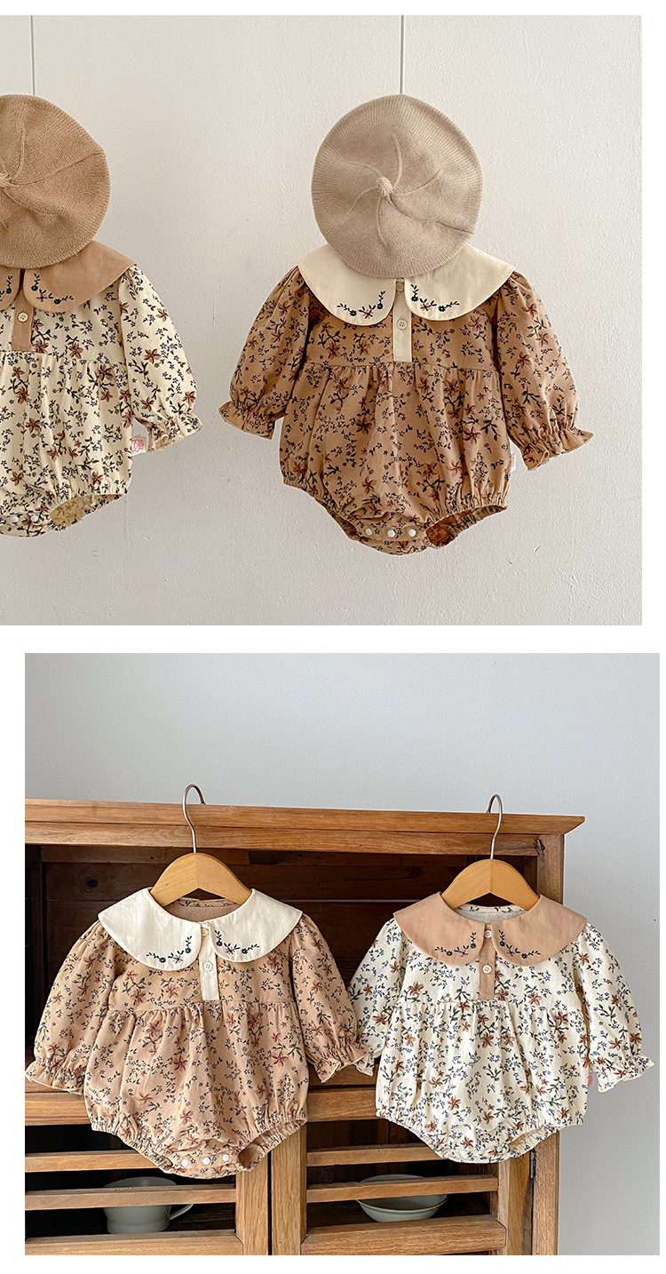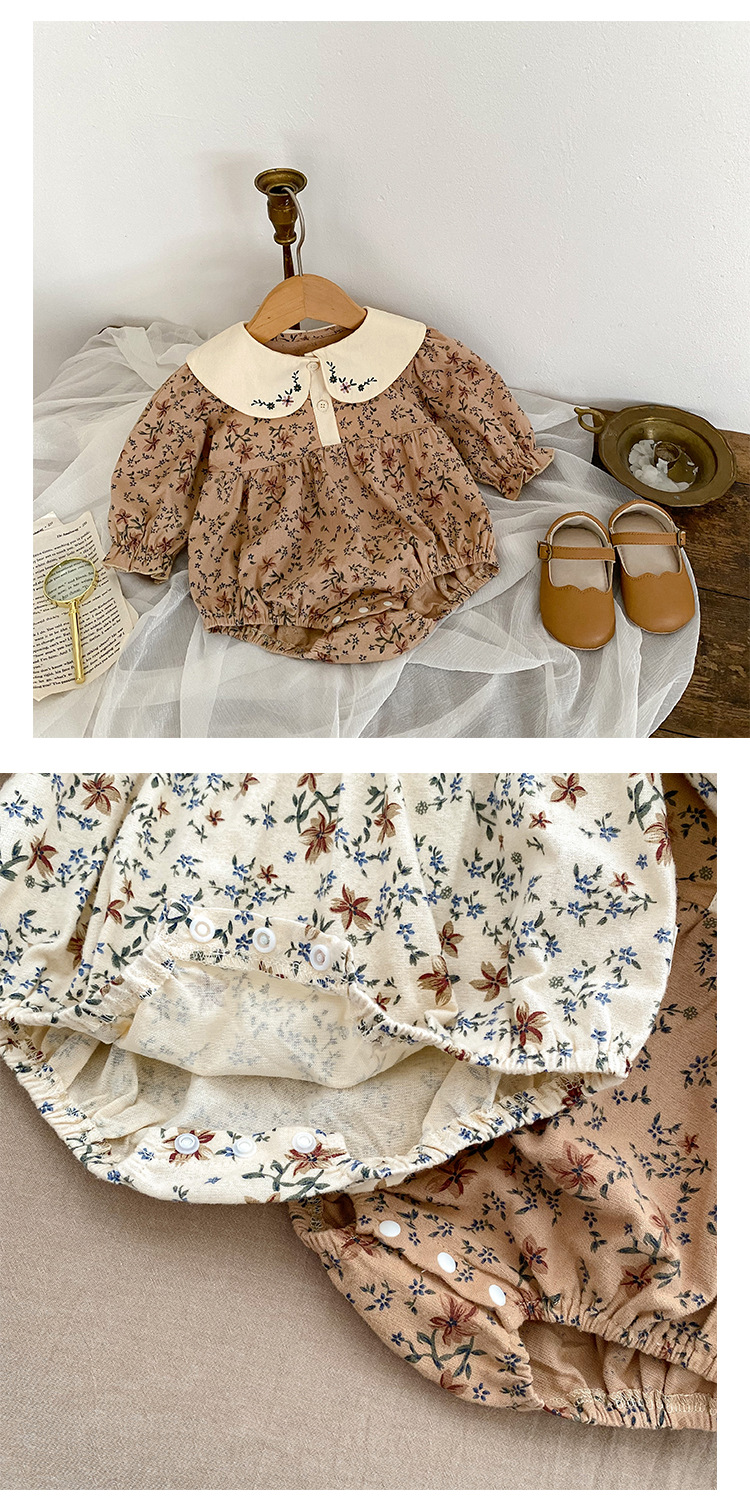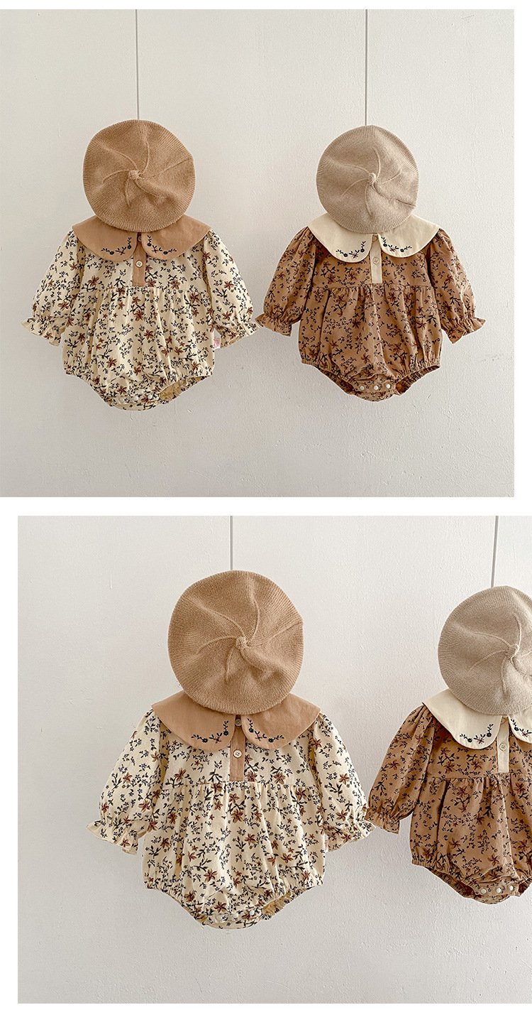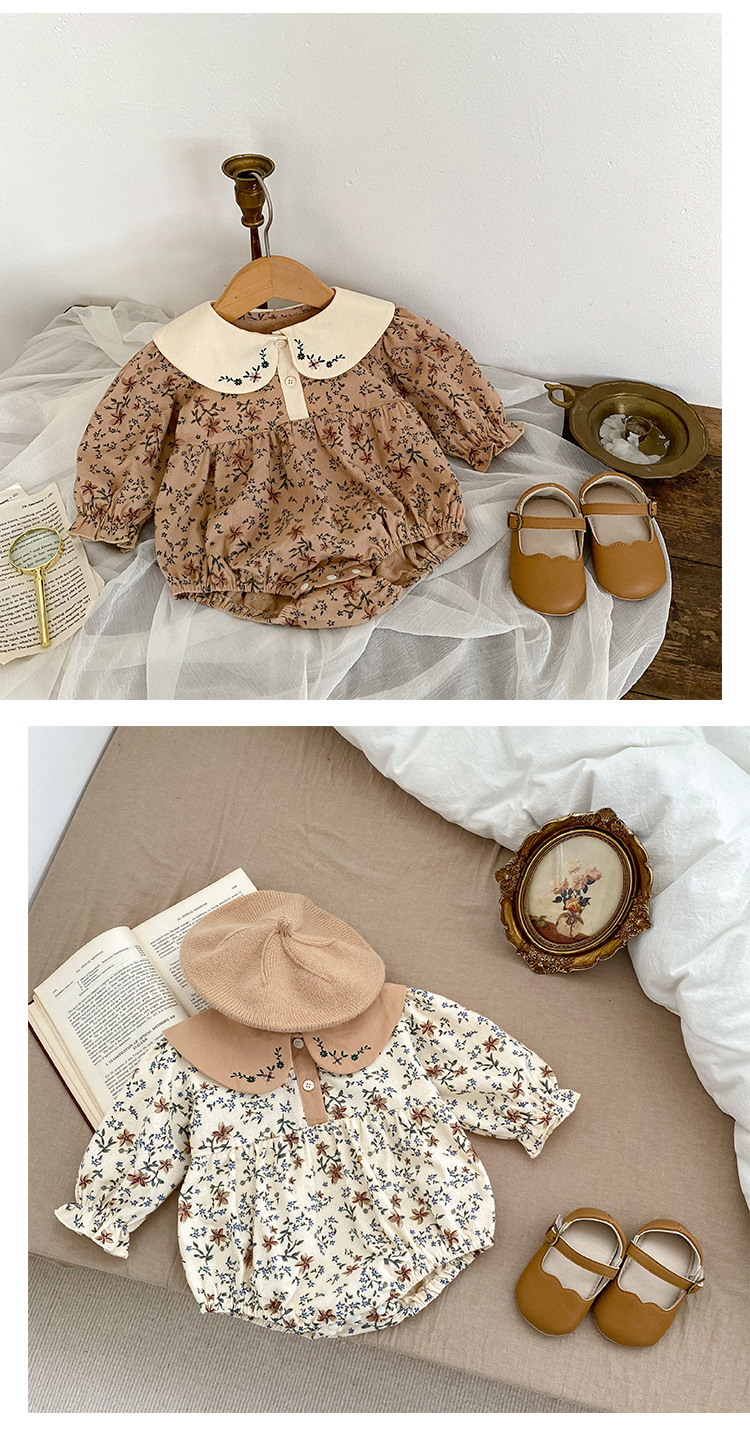 Primavera 2023 bebé niña manga larga vintage floral vaina bebé muñeca collar bordado mameluco estilo occidental Outwear