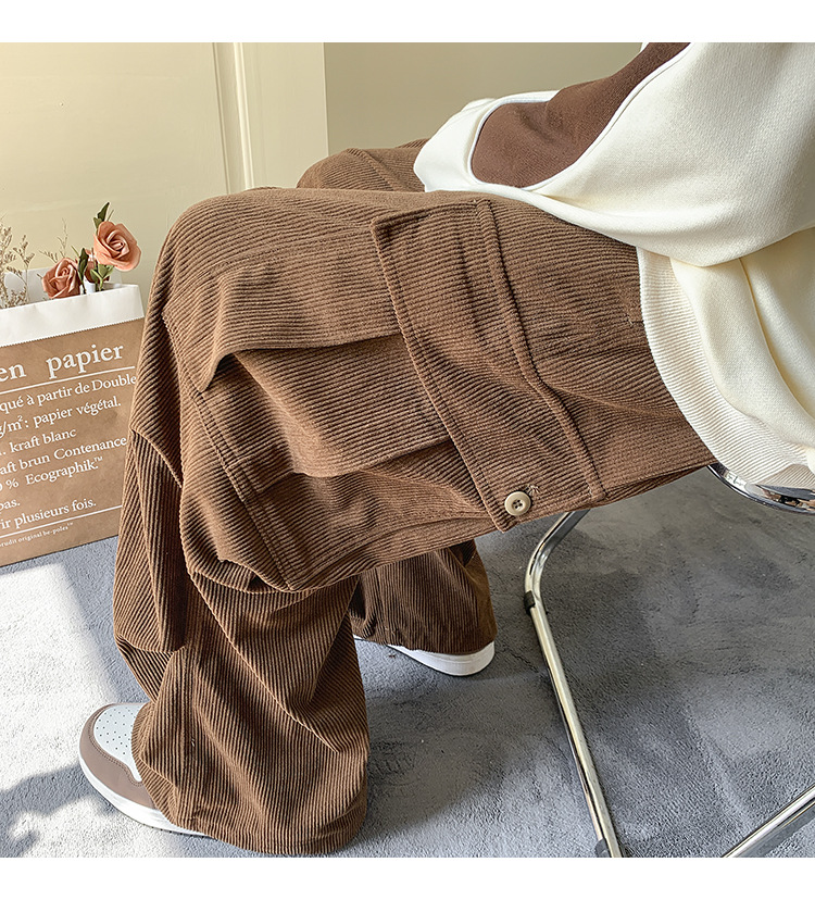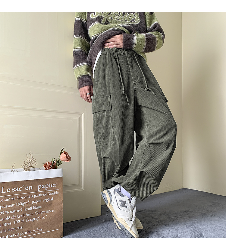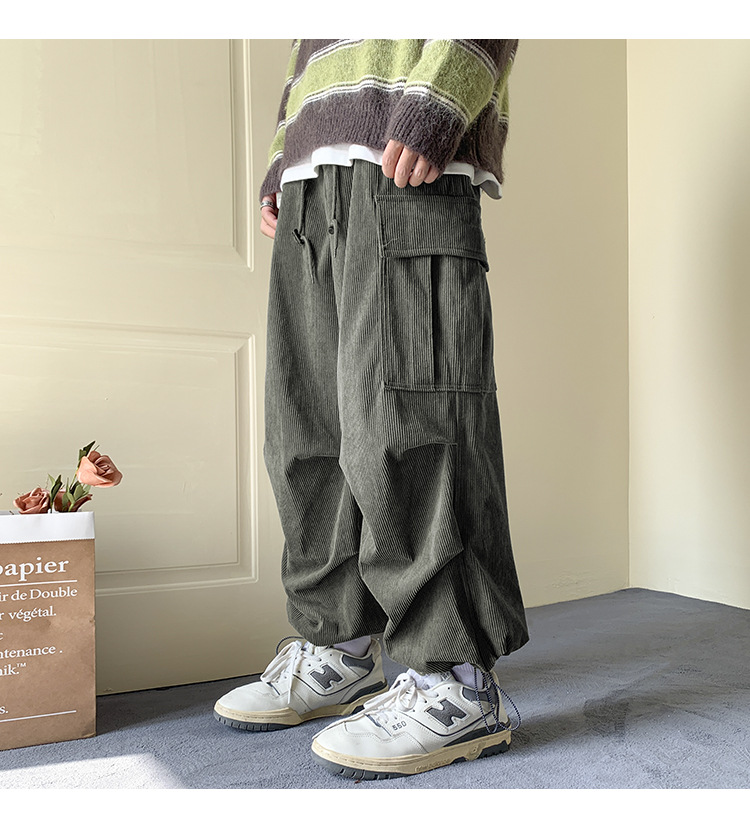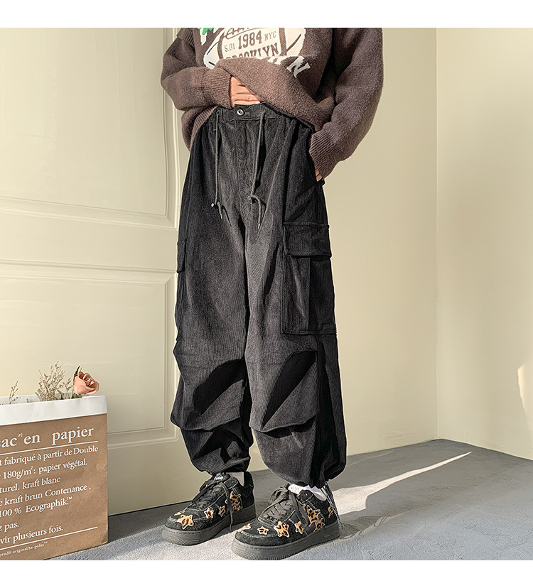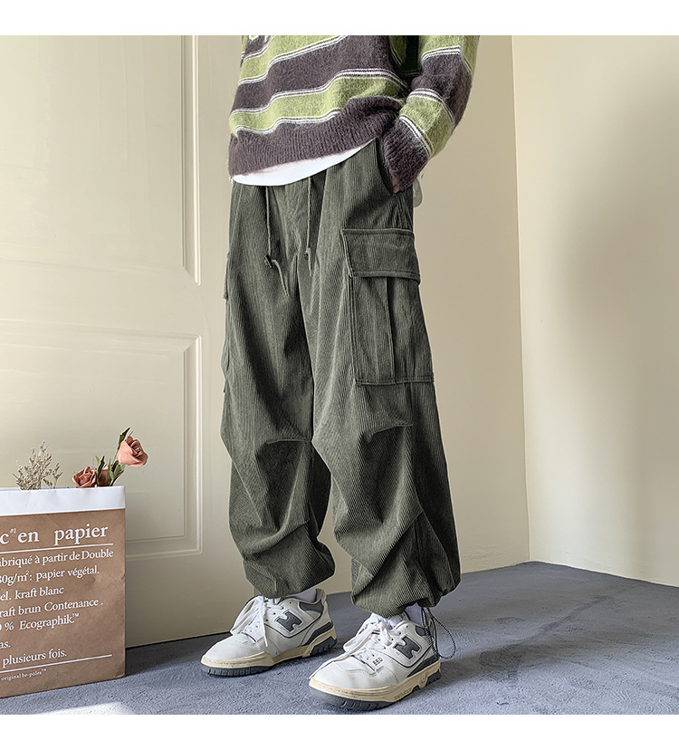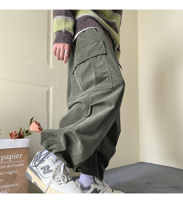 Pantalones de pana para hombre marca de moda americano retro gran bolsillo con pies, monos, pantalones casuales sueltos con cordón de primavera y otoño