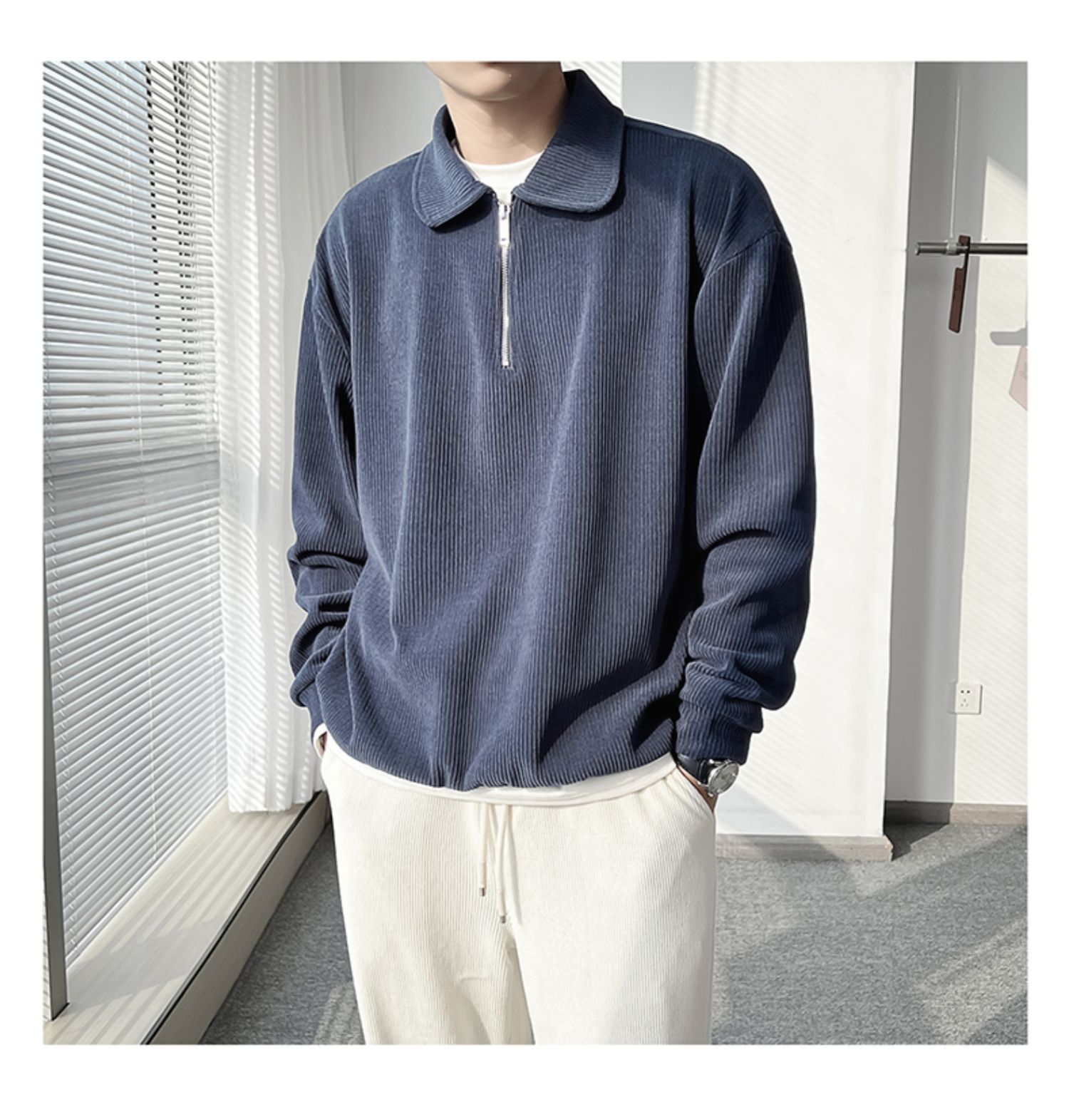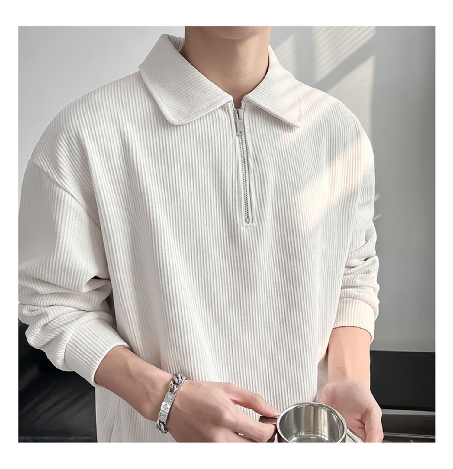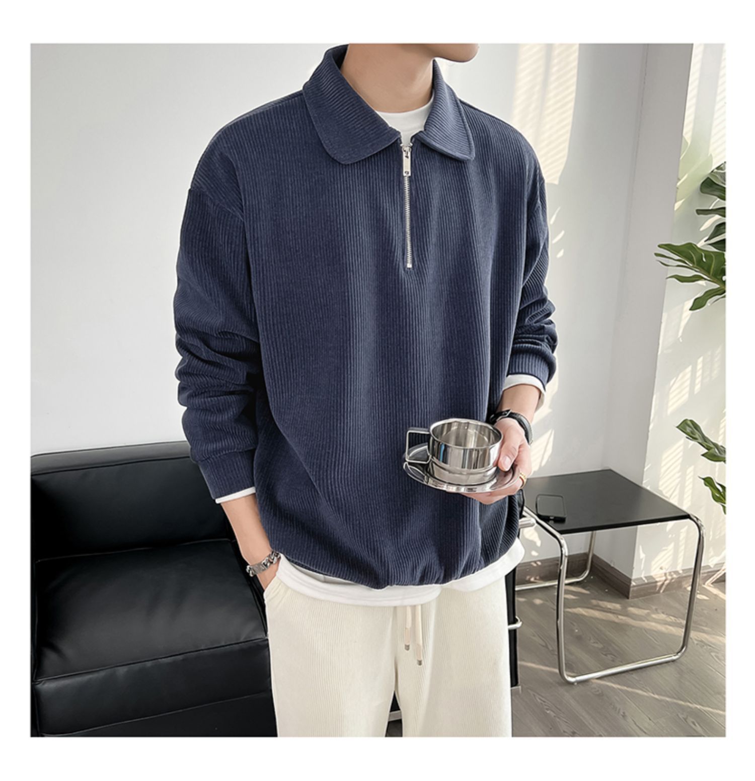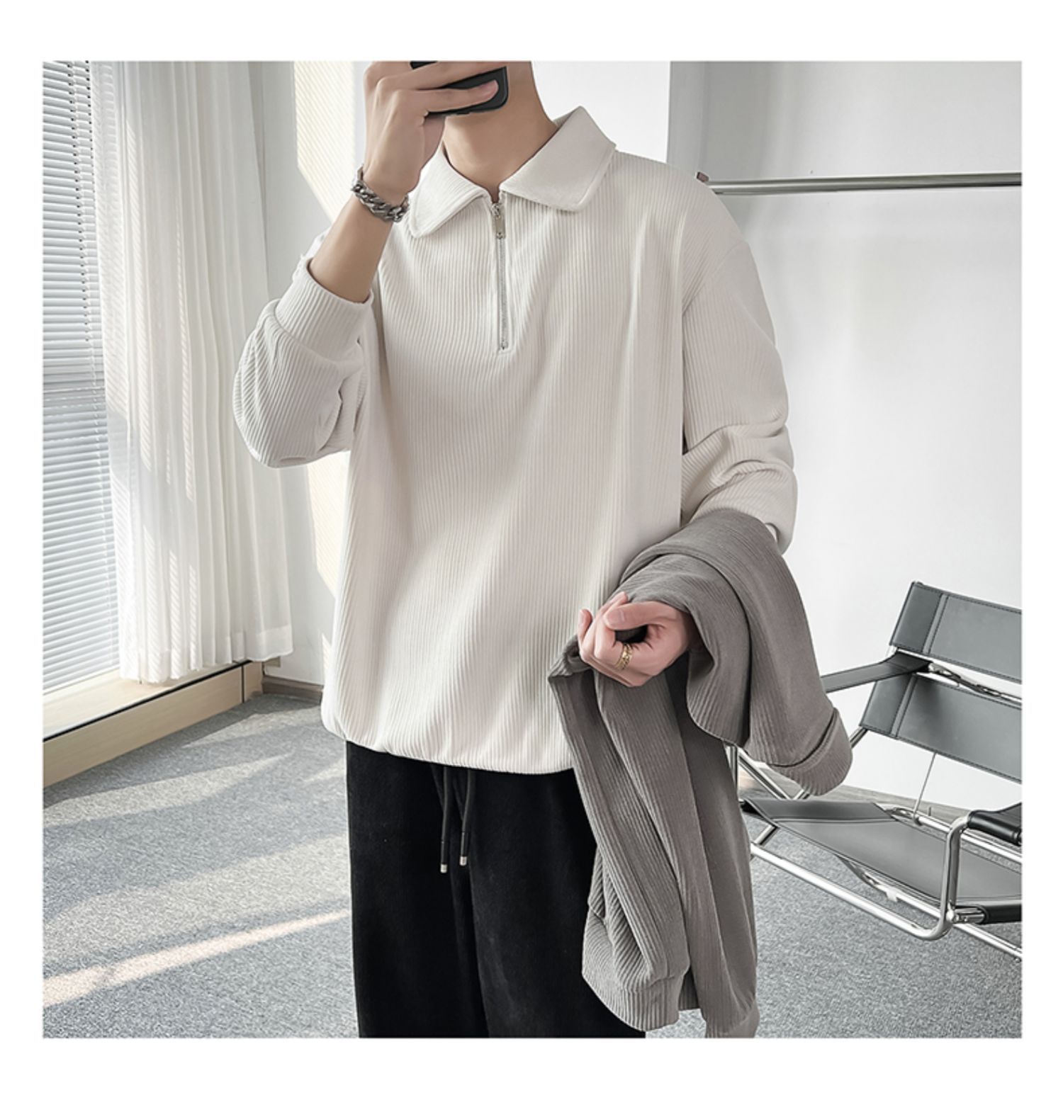 Ruan Shuai frito luz de la calle maduro estilo juvenil solapa rayas abrigo medio cremallera Polo suéter de los hombres otoño marca de moda