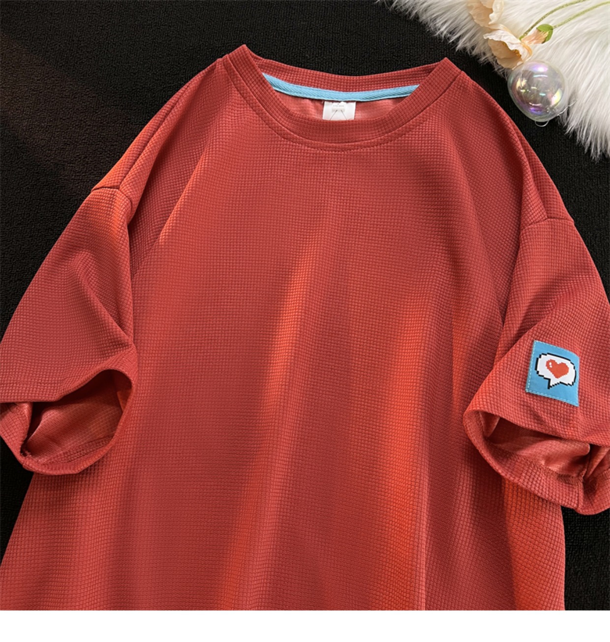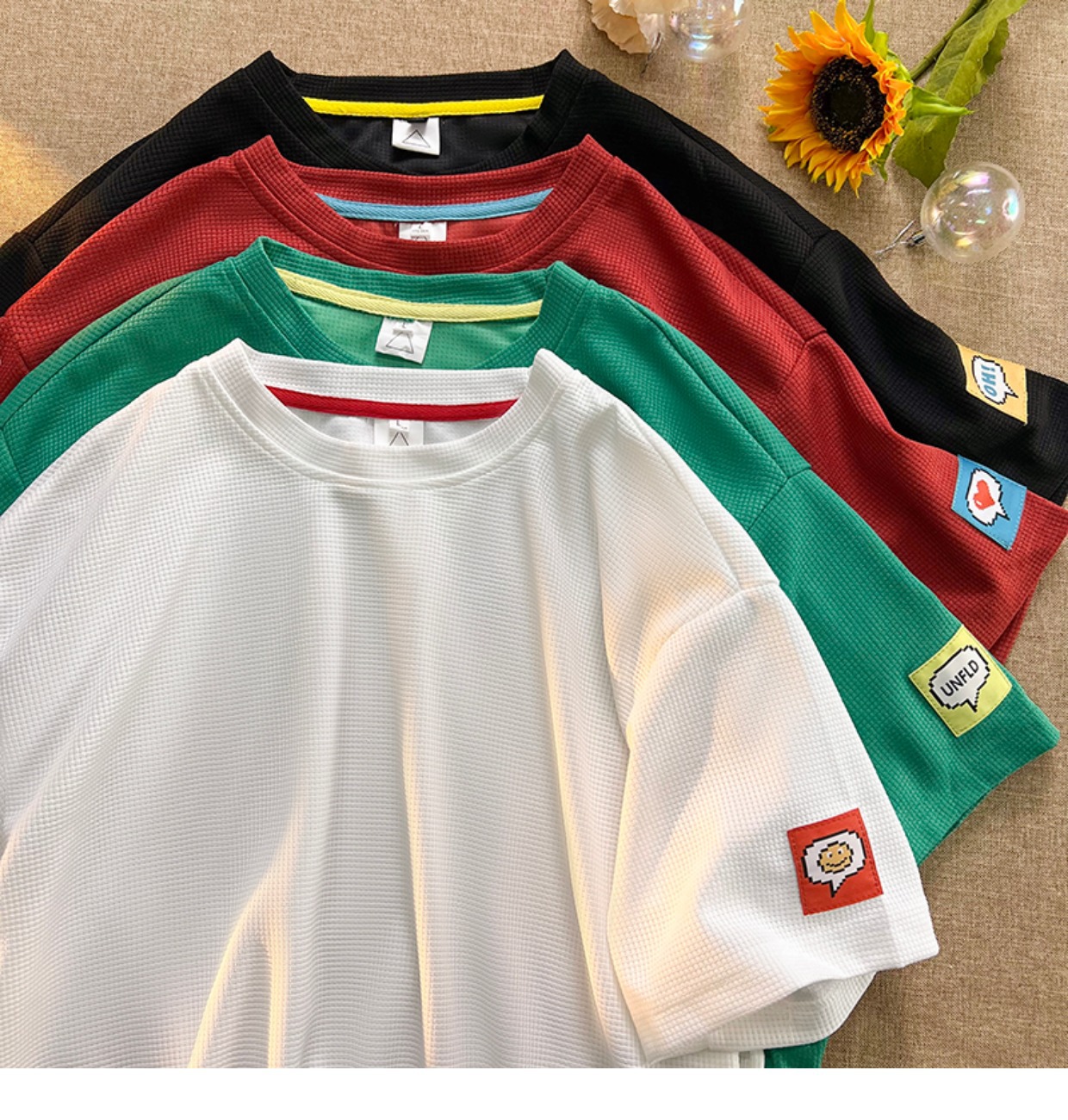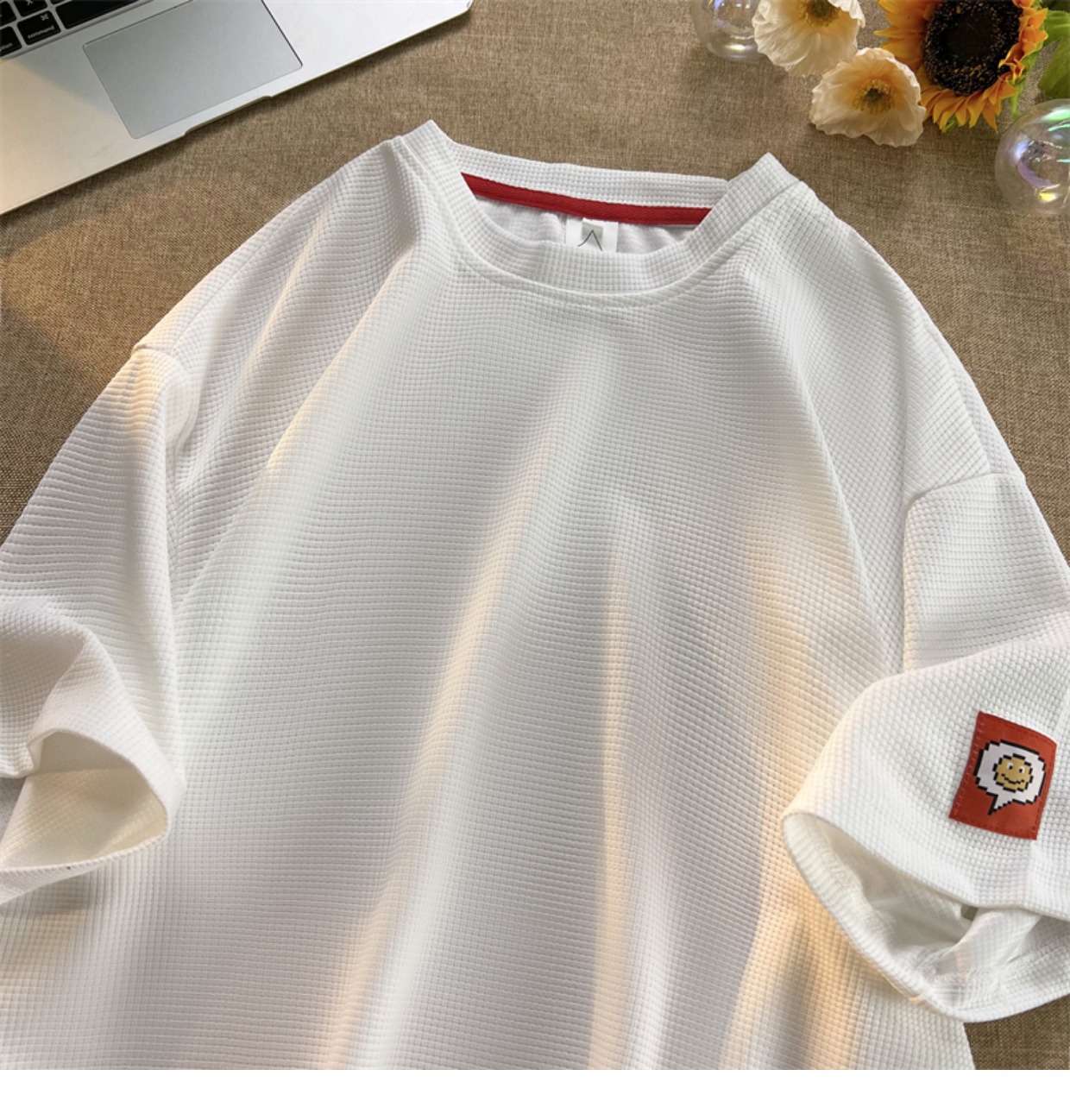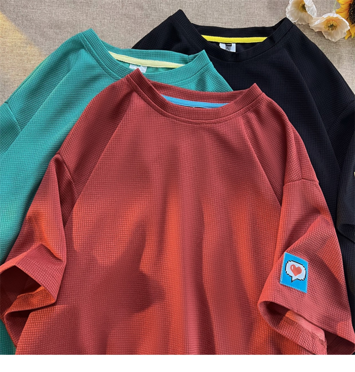 Waffle pesada manga corta verano de los hombres suelta cuello redondo Camiseta marca de moda etiquetado simple moda media manga pareja camiseta
