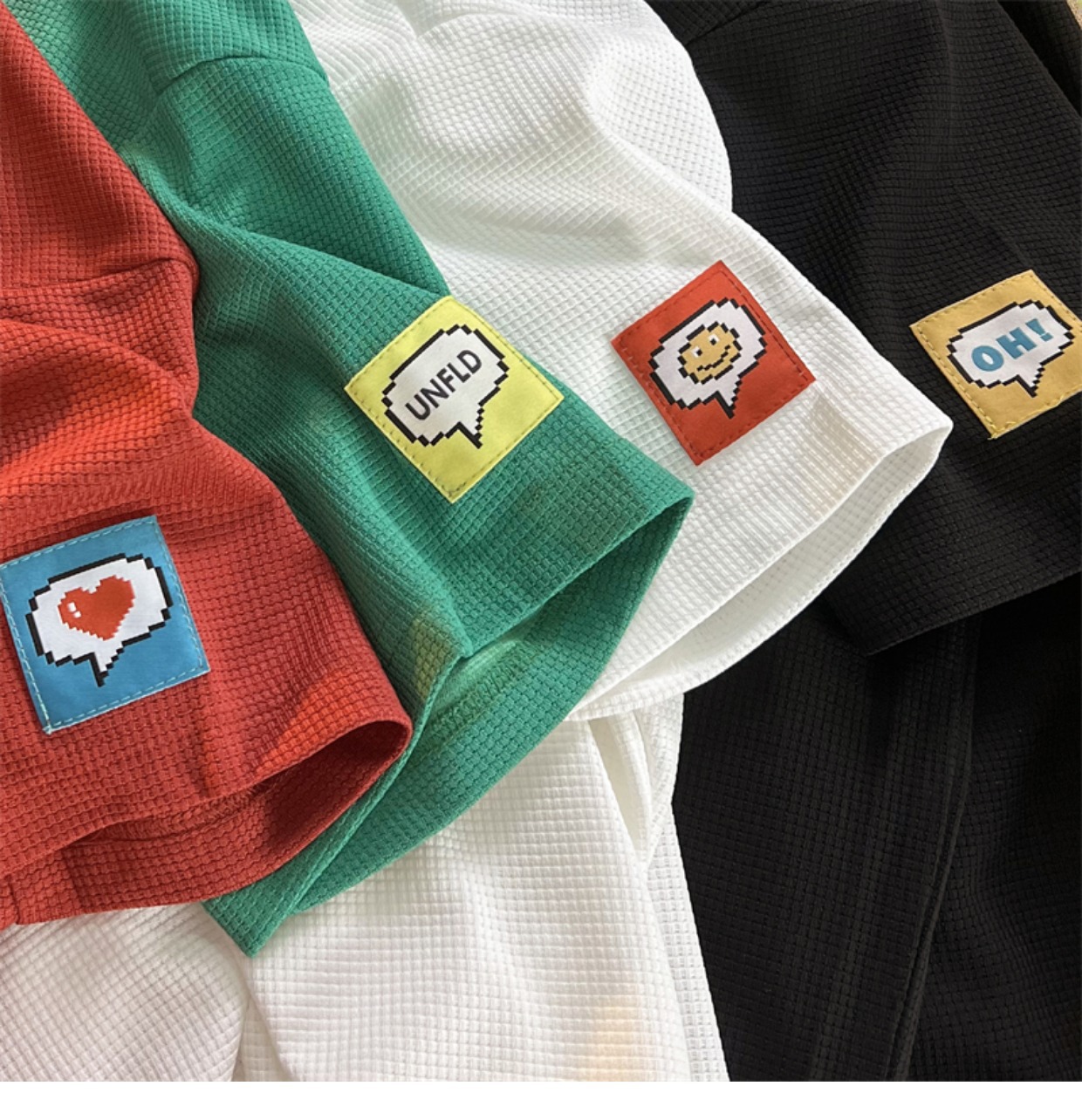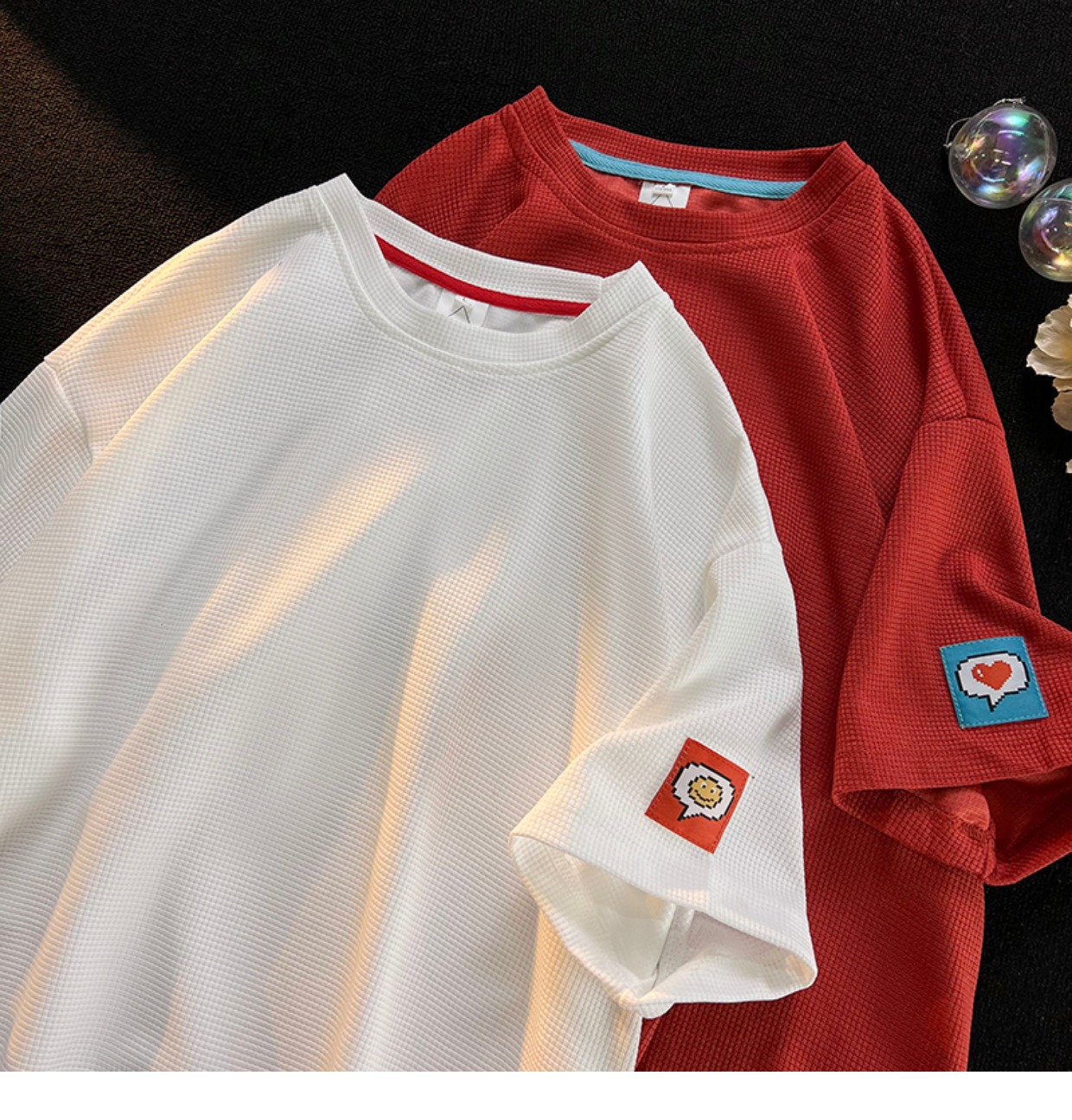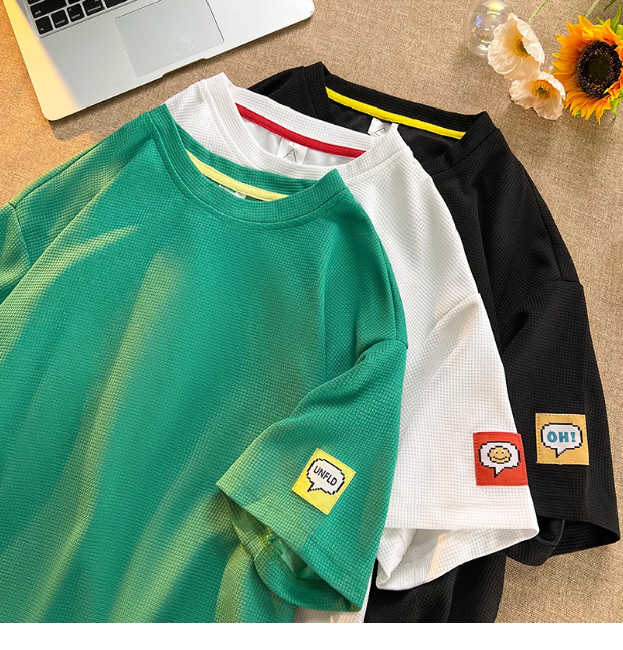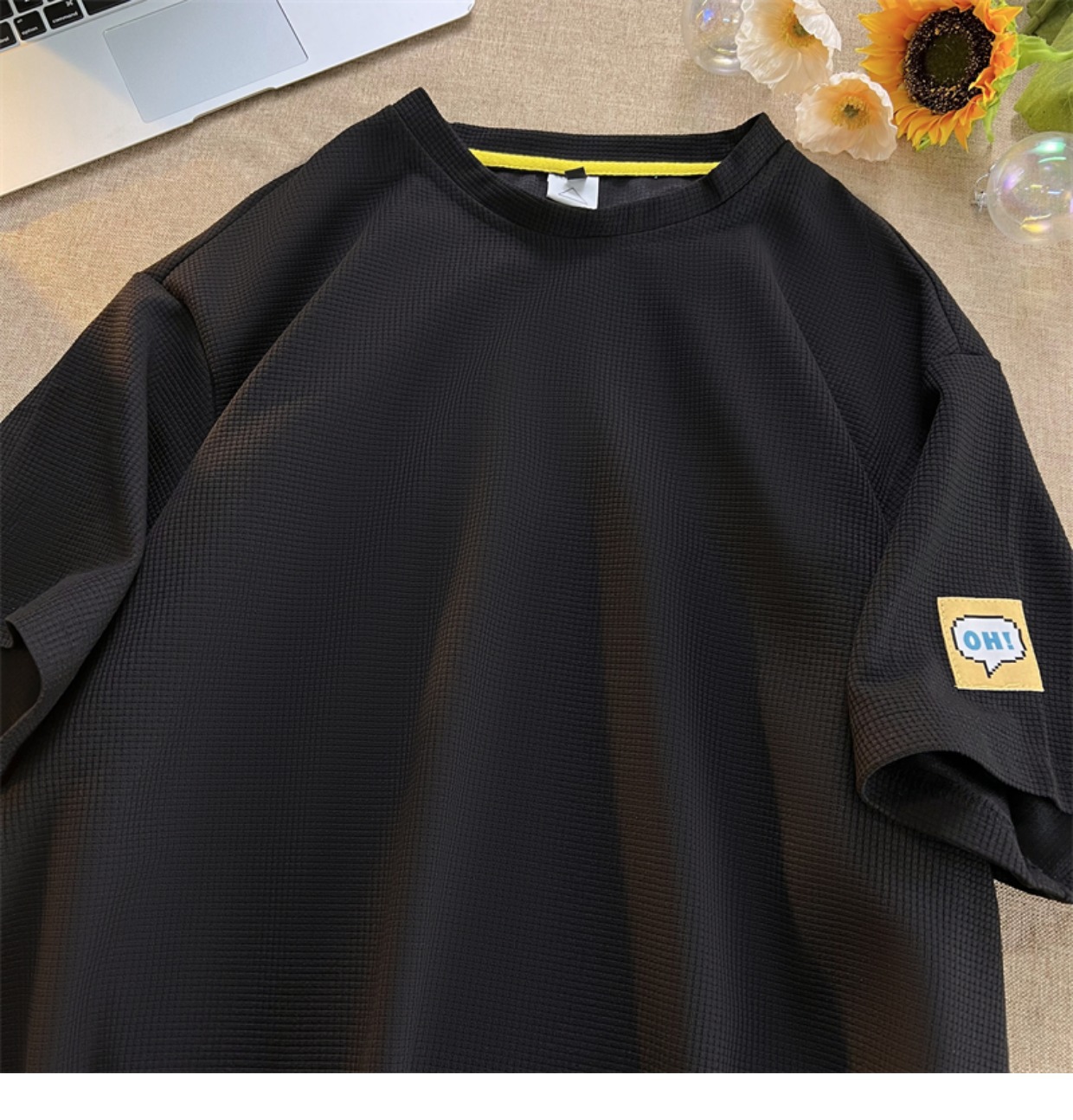 Waffle pesada manga corta verano de los hombres suelta cuello redondo Camiseta marca de moda etiquetado simple moda media manga pareja camiseta