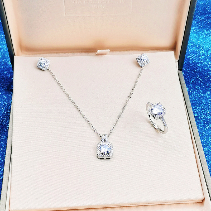 Joyería caliente vivo tres piezas princesa bolsa cuadrada anillo collar pendientes ZIRCON traje moda temperamento clavícula cadena