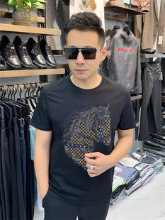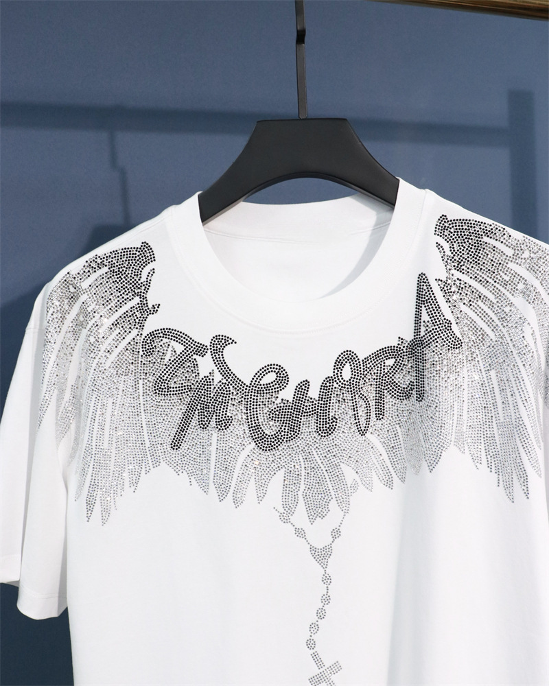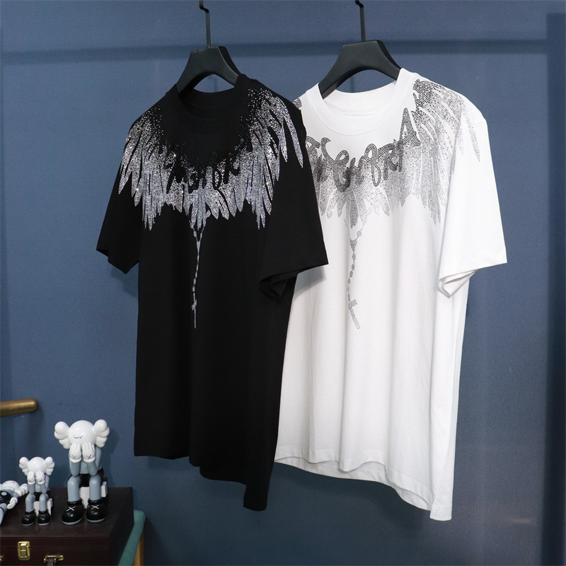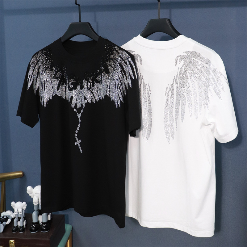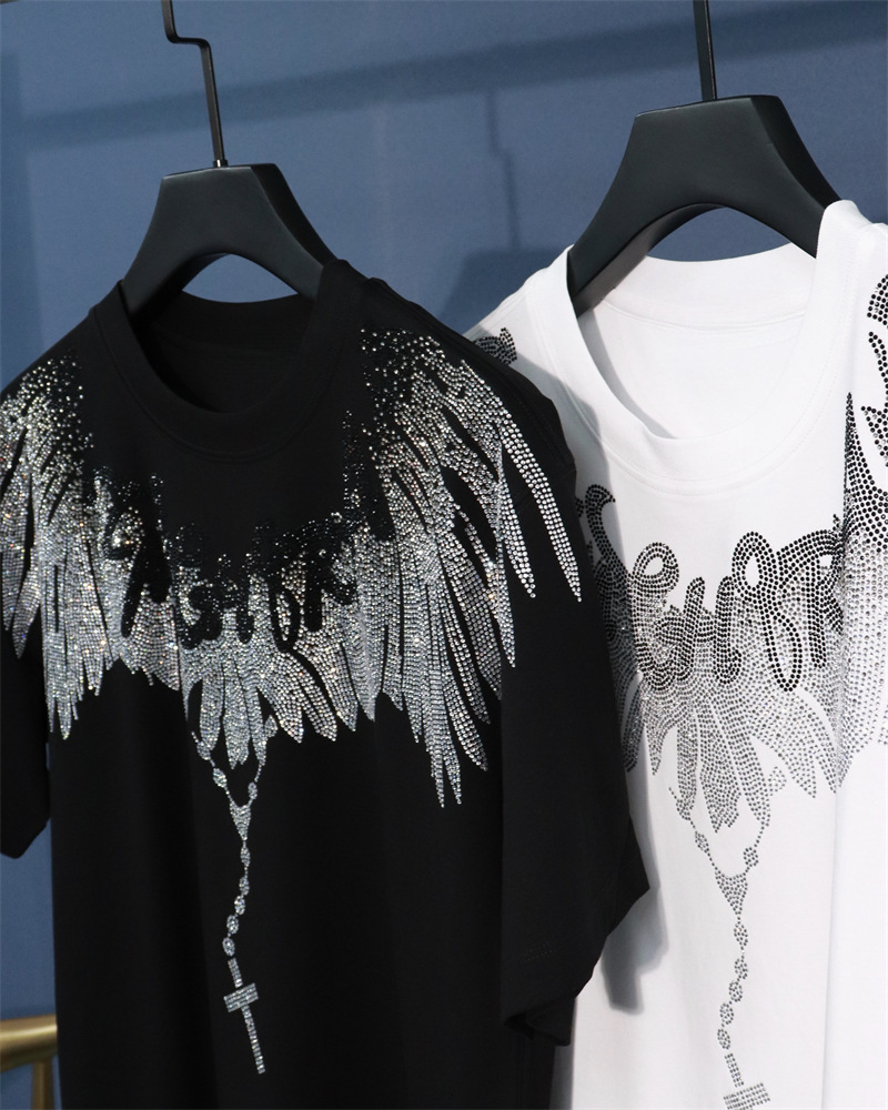 Camiseta de manga corta para hombre, talla grande, estilo europeo, marca de moda, con pedrería, diseño de alas de ángel en la parte delantera y trasera, corte holgado