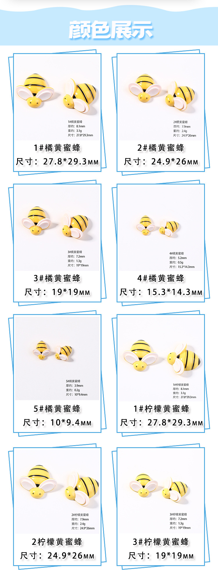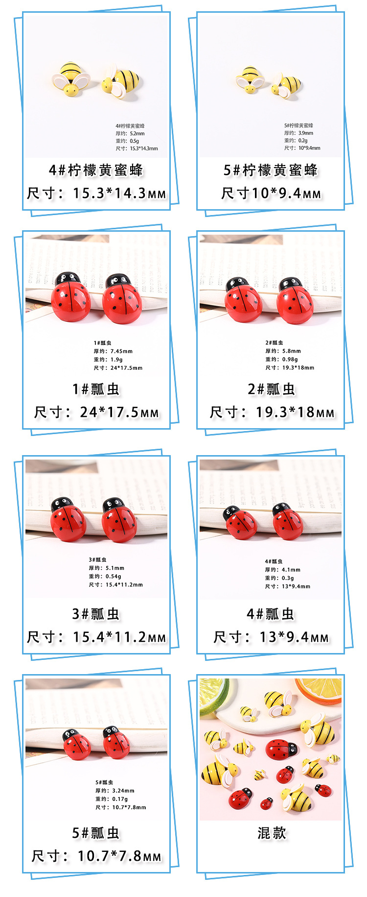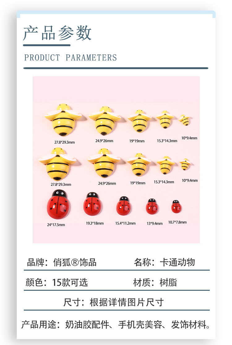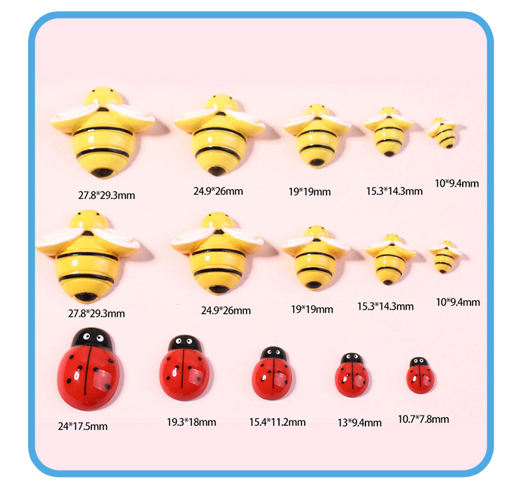 | Colores | 1 # abeja naranja 27.8*29.3mm,2 # abeja naranja 24.9*26mm,3 # abeja naranja 19*19,4 # abeja naranja 15.3*14.3mm,5 # abeja naranja 10*9.4mm,1 # abeja amarilla limón 27.8*29.3mm,2 # abeja amarilla limón 24.9*26mm,3 # abejas amarillas limón 19*19mm,4 # abeja amarilla limón 15.3*14.3mm,5 # abeja amarilla limón 10*9.4mm,1 # mariquita 24*17.5mm,2 # mariquita 19.3*14mm,3 # mariquita 15.4*11.2mm,4 # mariquita 13*9.4mm,5 # mariquita 10.7*7.8mm,Mariquita de siete estrellas 11*15mm,Mariquita de siete estrellas 14*19mm,Mariquita de siete estrellas 18*24mm,1 # abeja 22*22mm,2 # abeja 18*18mm,4 # Abeja 10*10mm |