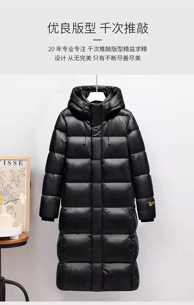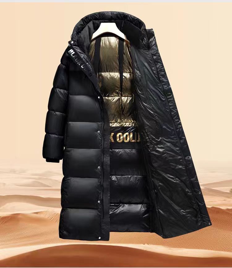 Ropa de invierno larga negra dorada transfronteriza para parejas, con capucha, unisex, cálida, holgada, por encima de la rodilla, para exteriores, gruesa, a prueba de frío.