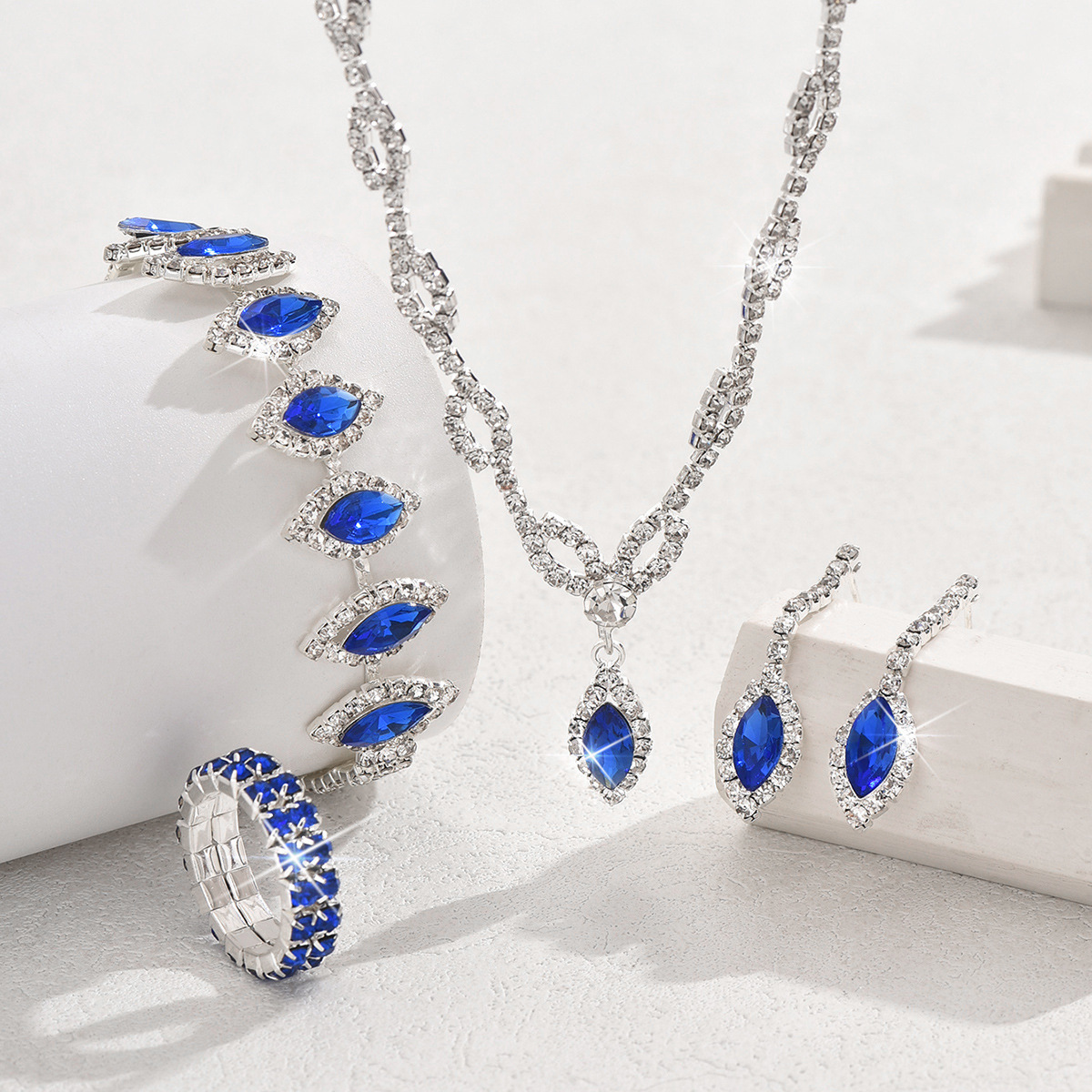 Amazon joyería caliente marca nueva moda joyería nupcial accesorios de boda simple zafiro azul diamante collar pendientes