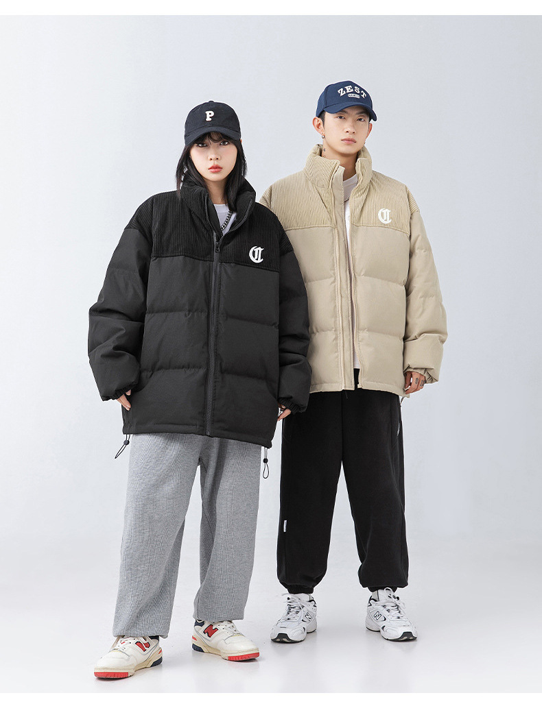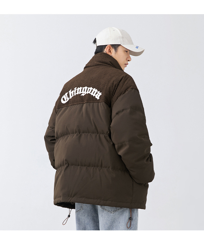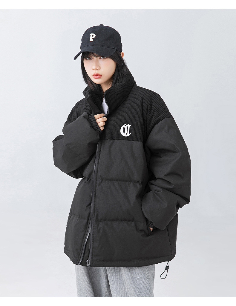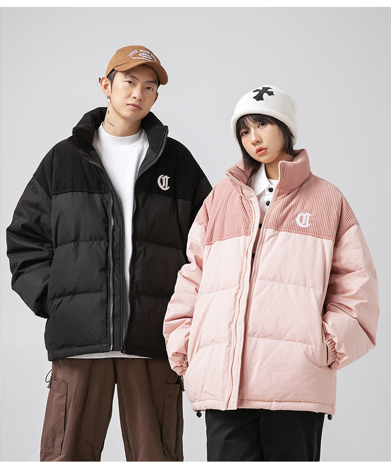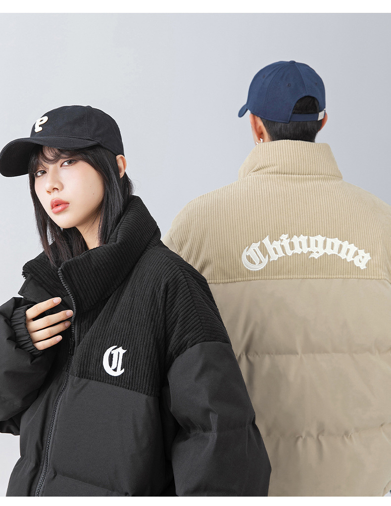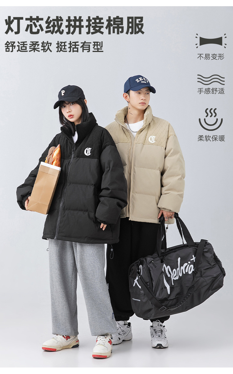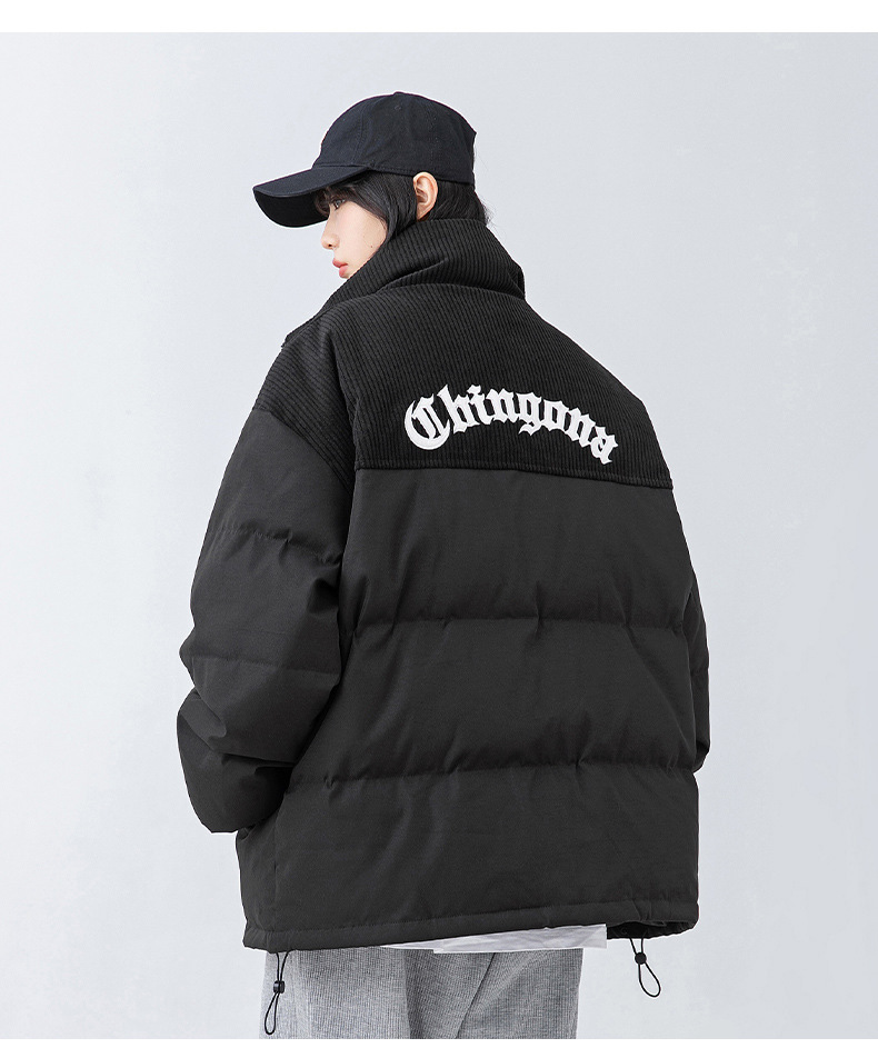 Chaqueta de algodón gruesa de invierno para parejas, nuevo estilo de invierno con bordado de letras, marca de moda, abrigo de algodón con parches de pana holgada.