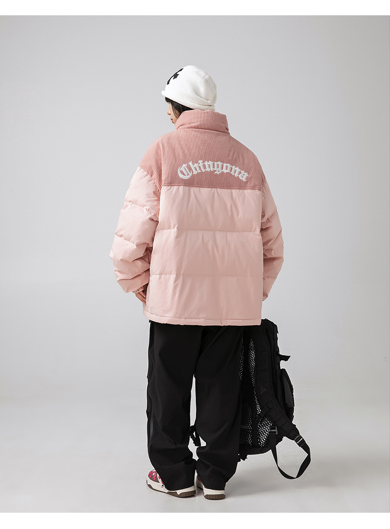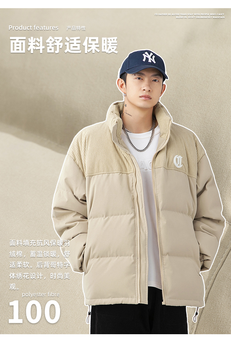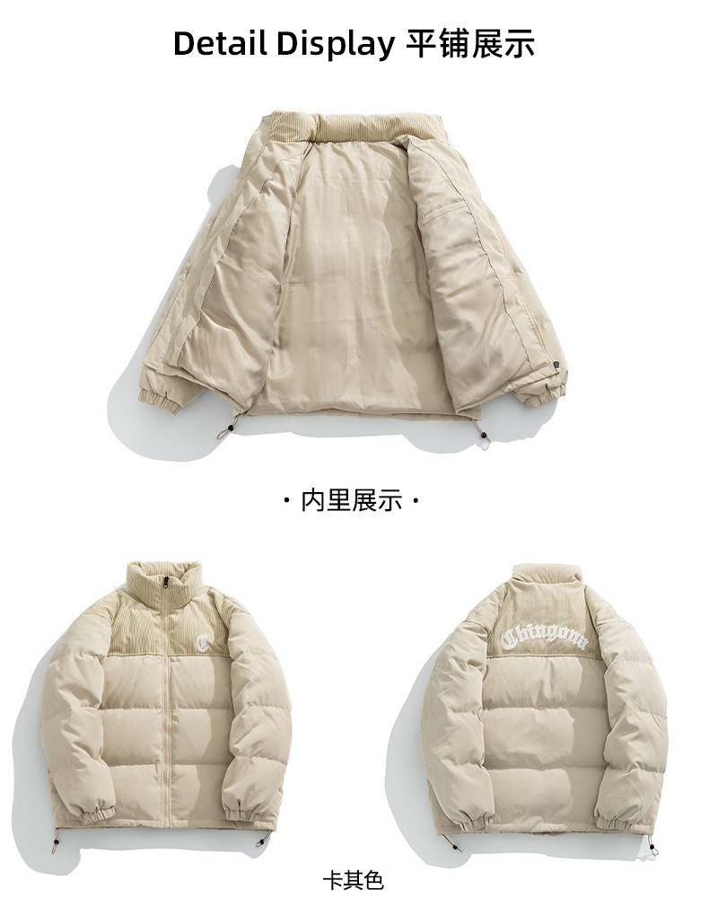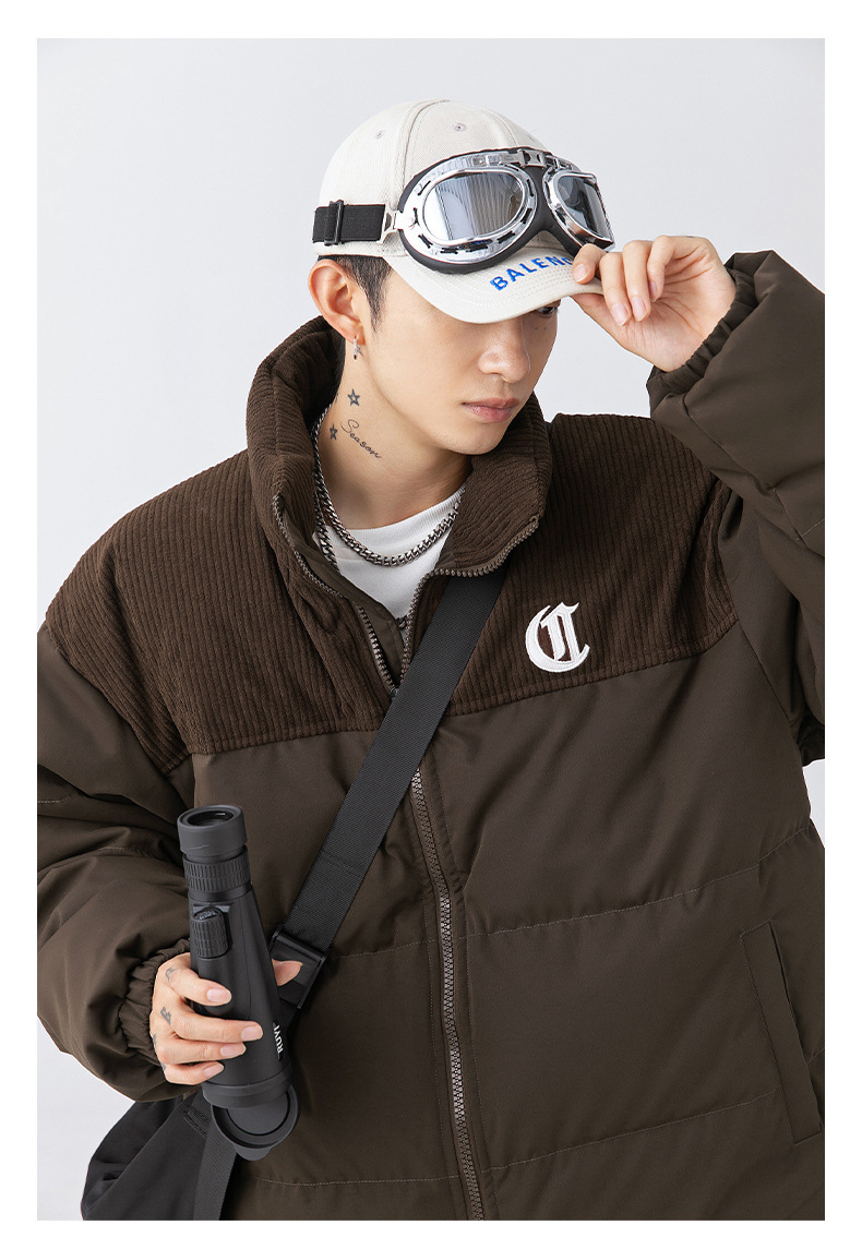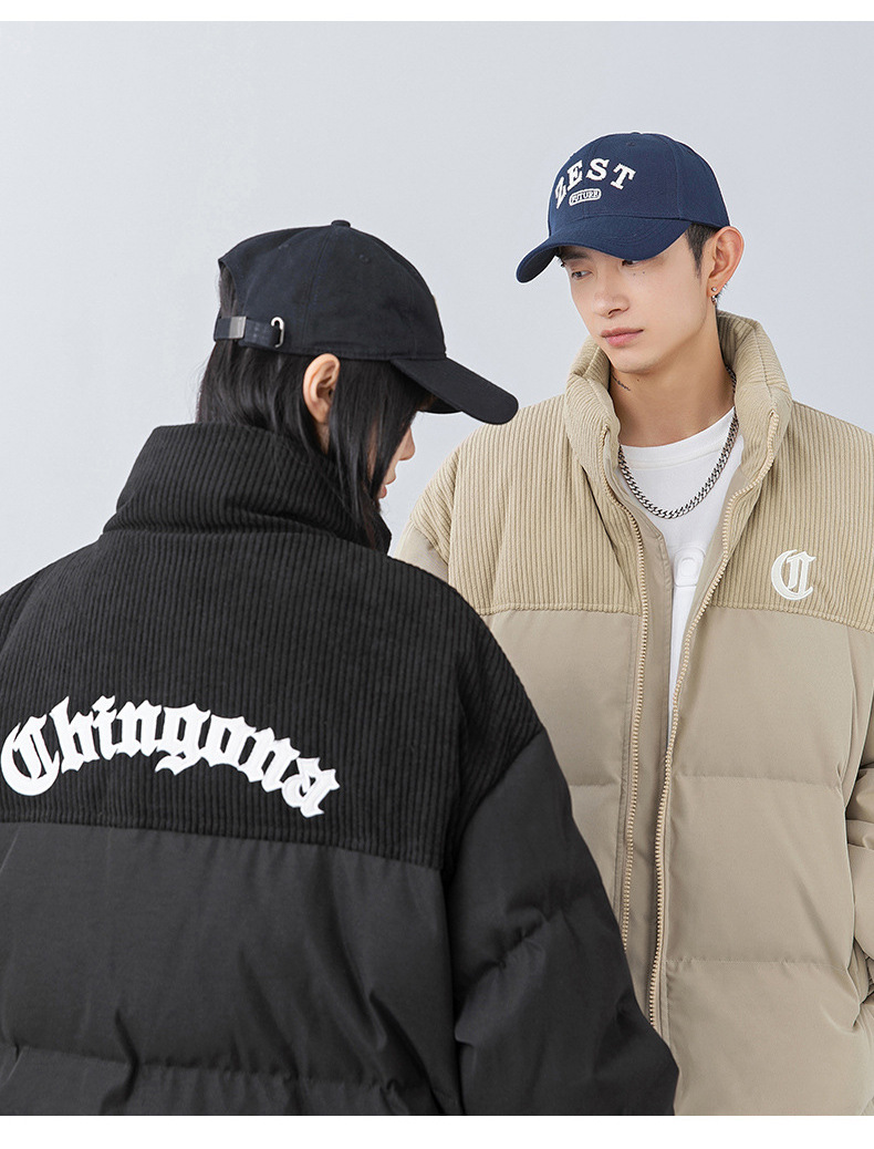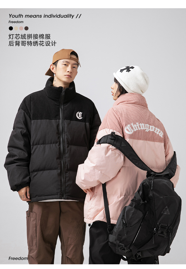 Chaqueta de algodón gruesa de invierno para parejas, nuevo estilo de invierno con bordado de letras, marca de moda, abrigo de algodón con parches de pana holgada.