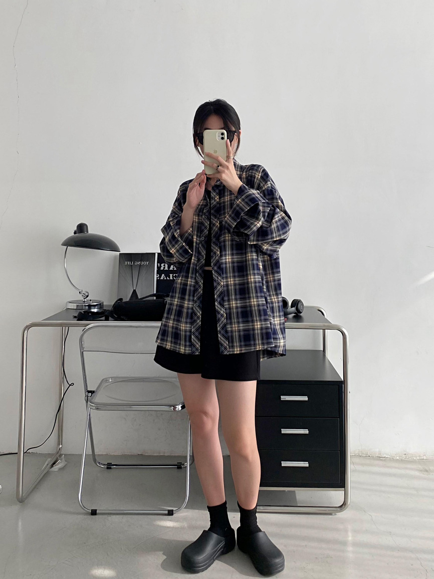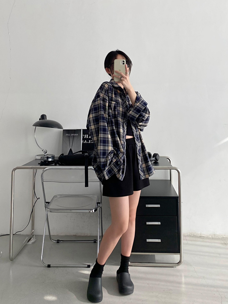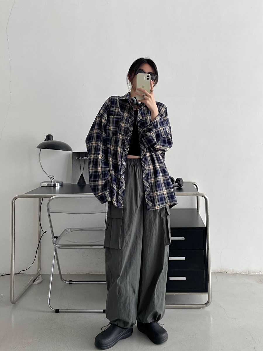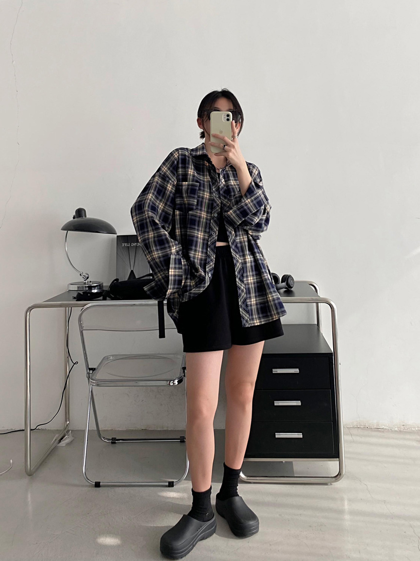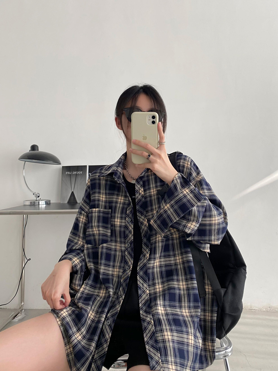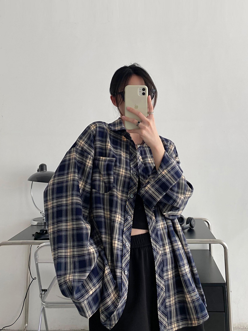 Camisa a cuadros retro americana para hombres y mujeres abrigo primavera y otoño cardigan diseño suelto camisa exterior de manga larga superior