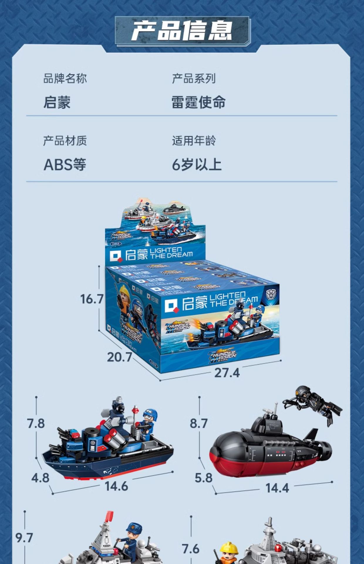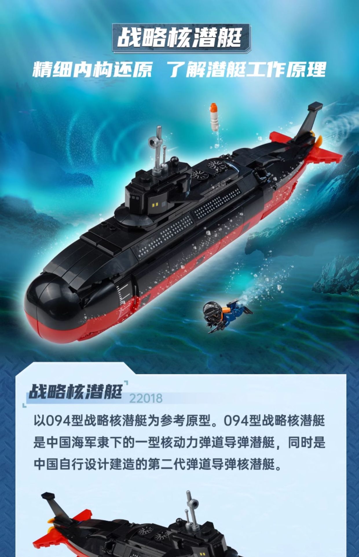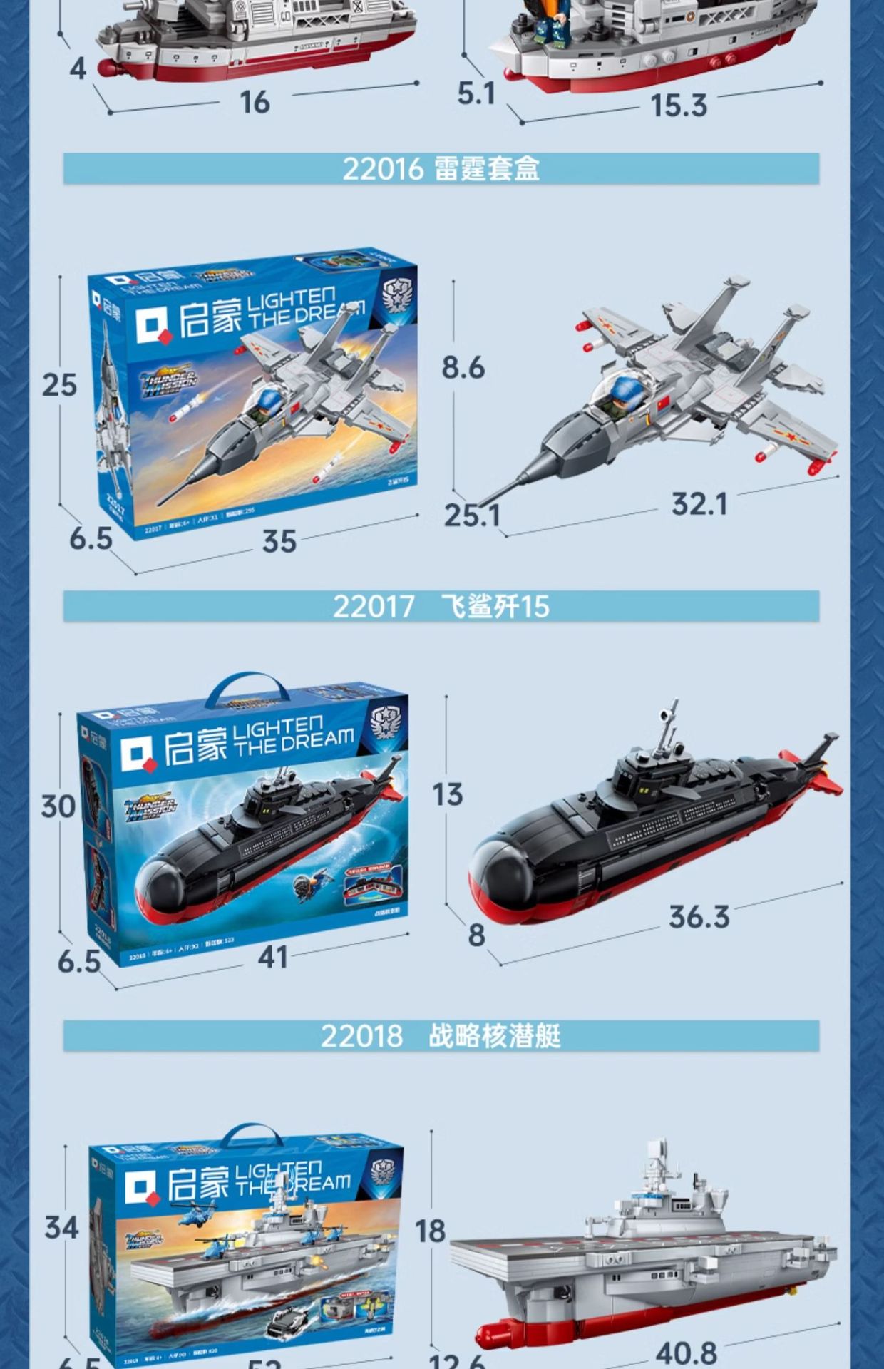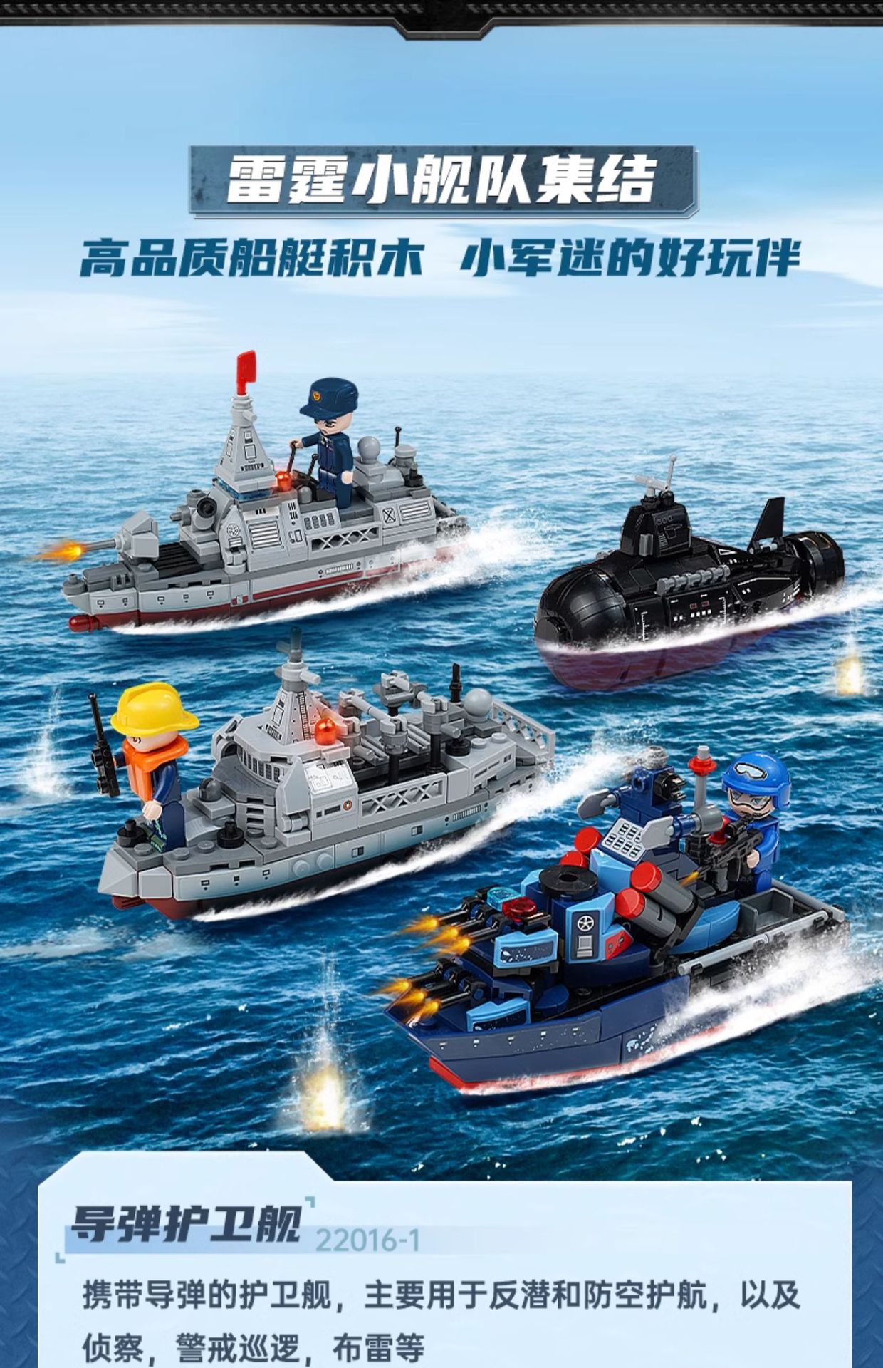 | Color | Fragata de misiles 22016 - 1, submarino nuclear de aguas profundas 22016 - 2, destructor armado 22016 - 3, buque de suministro integral 22016 - 4, cuerpo de Marines Thunder 22016 [conjunto completo de 4 modelos], tiburón volador 22017 J 15 [295 partículas], submarino nuclear estratégico 22018, buque de ataque anfibio 22019 |